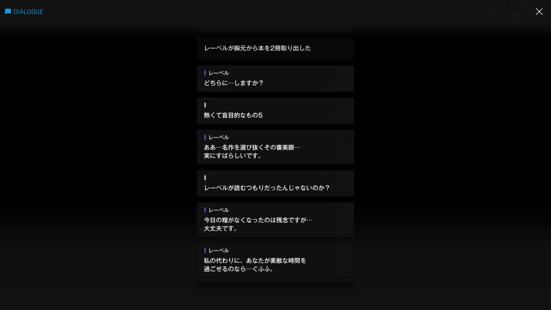 ・白性女ラプンツェルが愛して止まない『熱くて盲目的なもの』シリーズの最新作である5巻を所持している → 偉大な先輩は、現在ブレインシェルターで精子⋯⋯もとい生死の境をさまよっているが、新ボディに(煩悩も)パワーアップして復活した暁には、ぜひ快気祝いの名目でプレゼントしてあげてほしい(レーベル面談:03より)