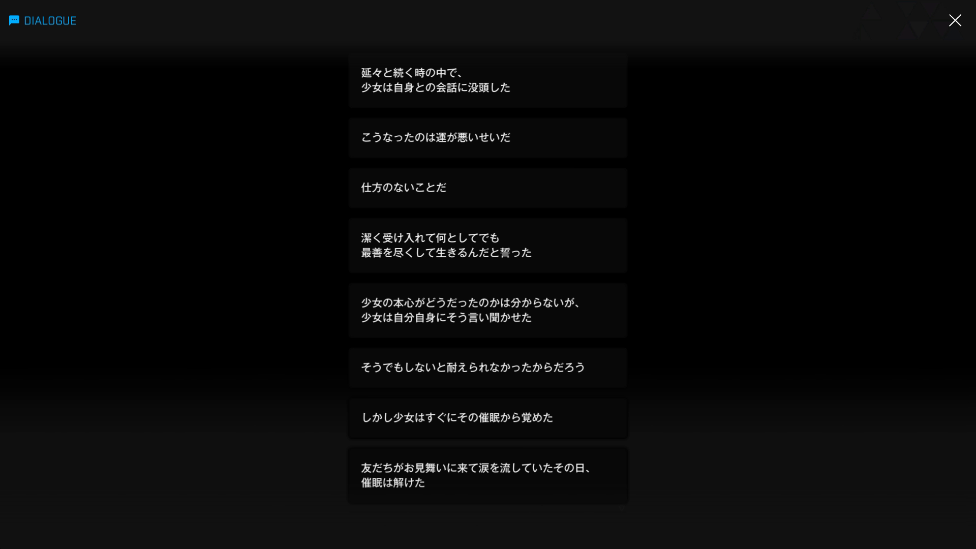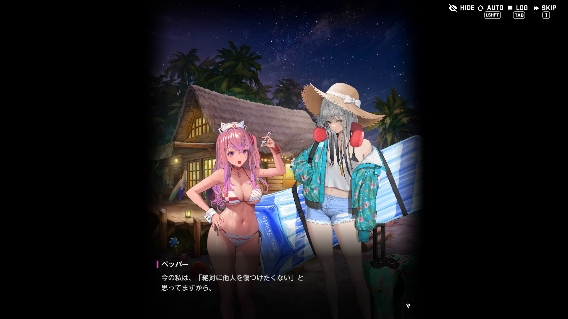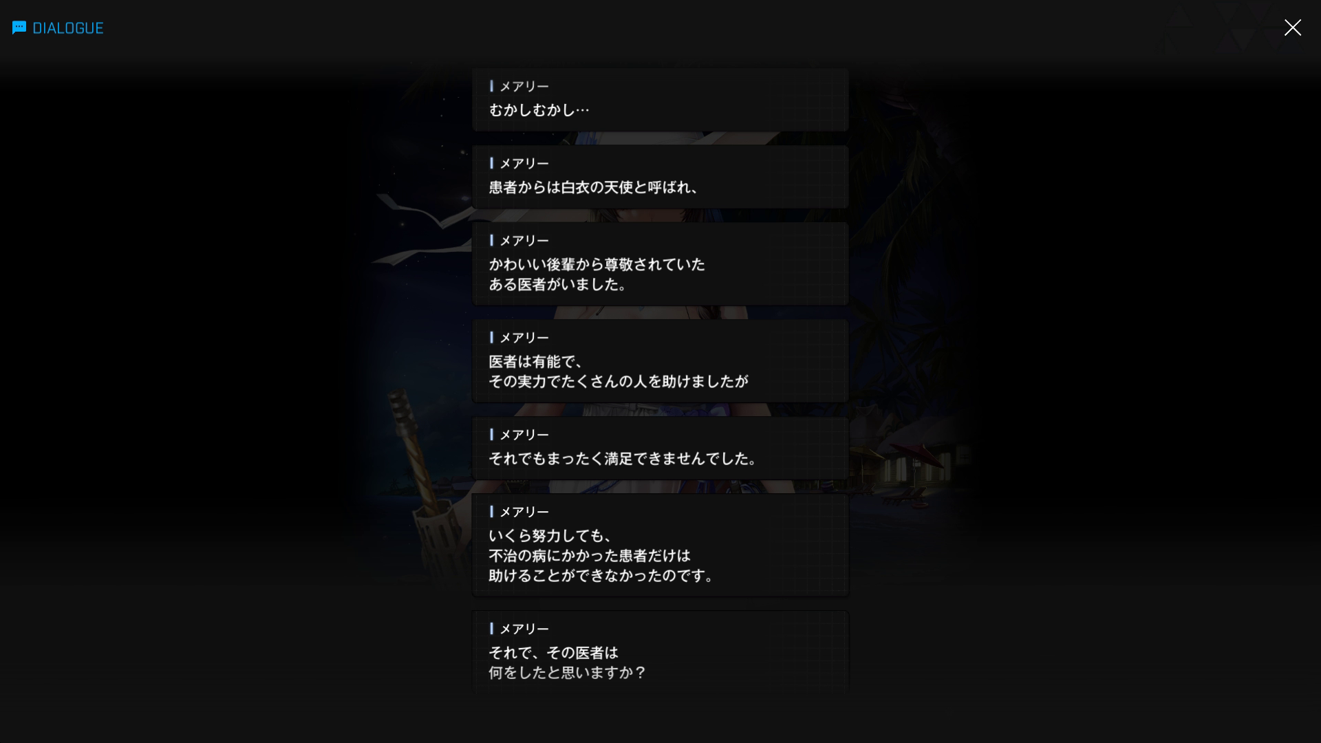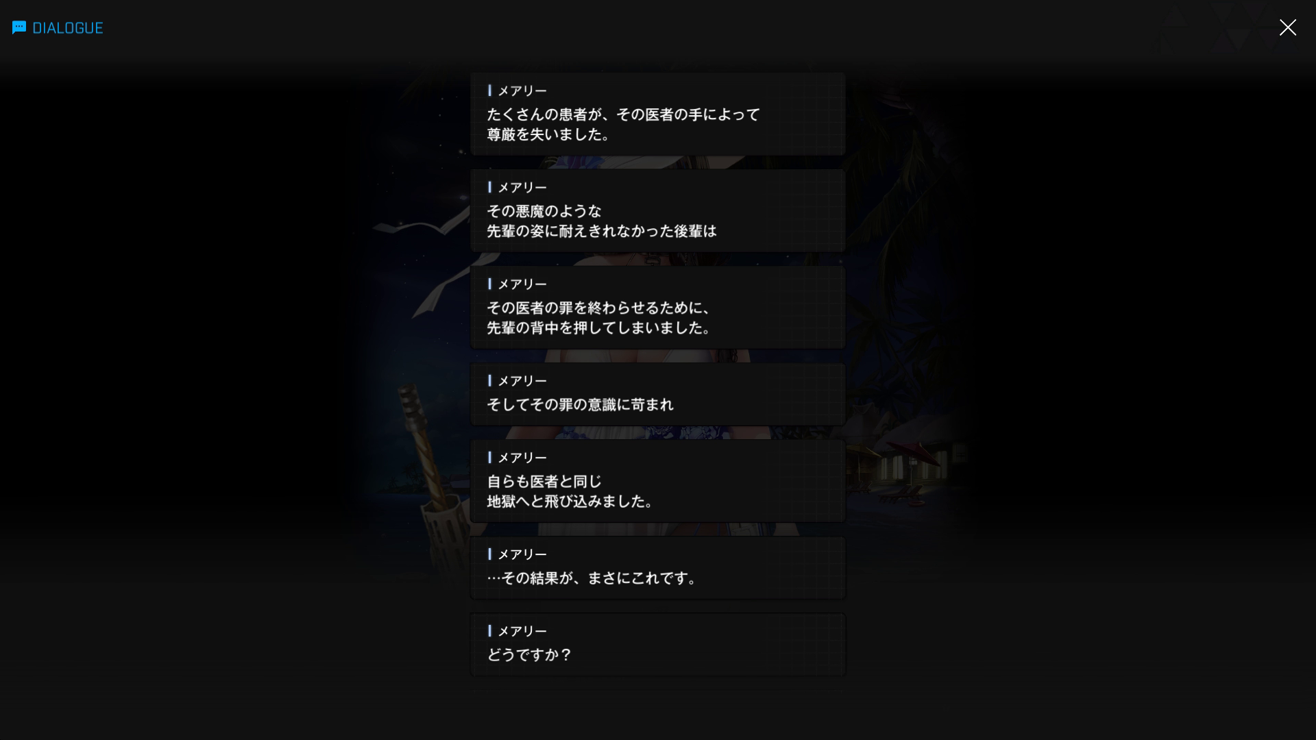 ・こちらのメアリーの項目と重複するが、ペッパーがニケ化した理由は以下SSの説明がより正確 & わかりやすい → つまり、『いくら衝動的にメアリーを突き落としたとはいえ、自らの手で殺害した事実は記憶から消せないため、『元白衣の天使』が死亡した同じ場所で投身自殺した』という話(イベント『Blue Water Island』第2部『夏の奇跡:B』より)