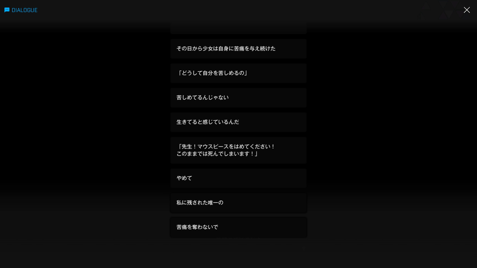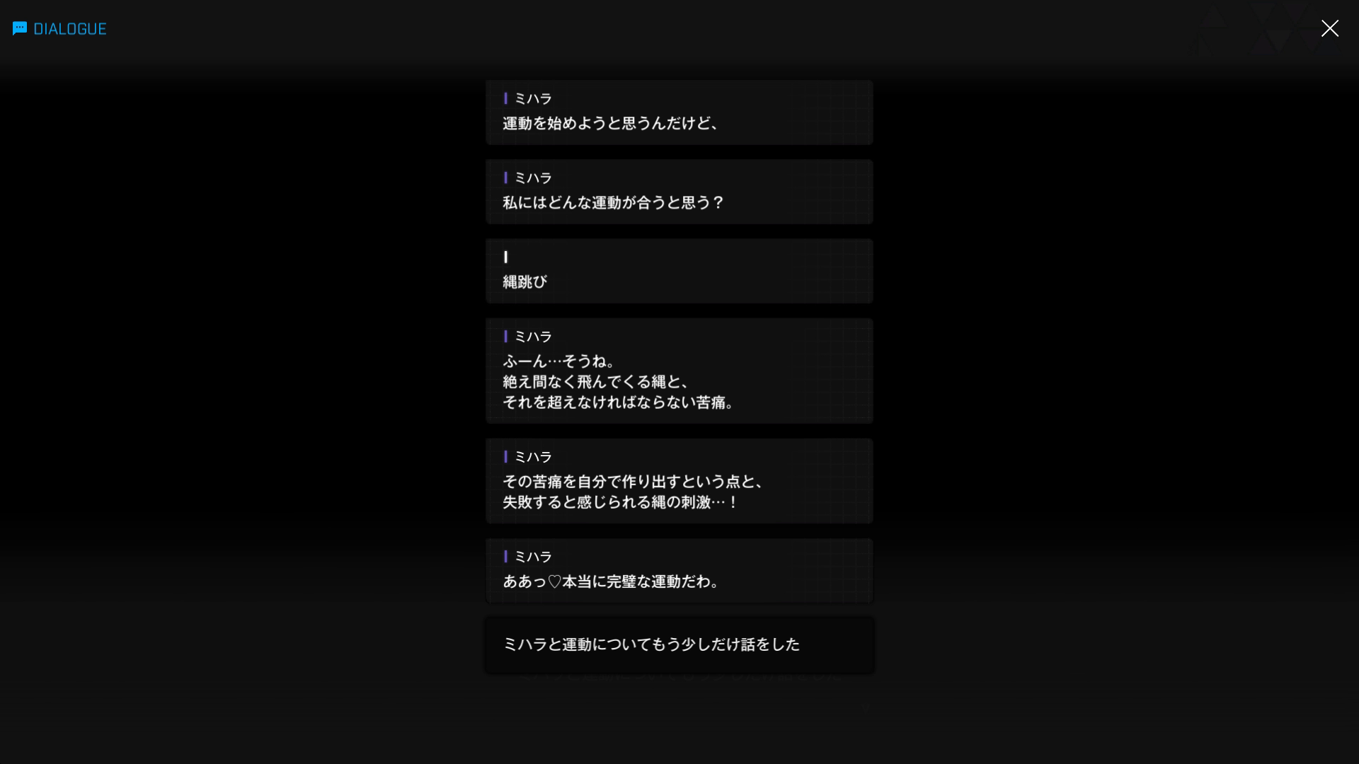 ・縄跳びの運動ですら、彼女にかかれば苦痛を得るための方法と捉えられてしまう → なぜ担当者は『水泳』などの例を挙げなかったのかは不明だが、おそらく『違う意味での縄運動』を想像していたのだろう(ミハラ面談:17より)