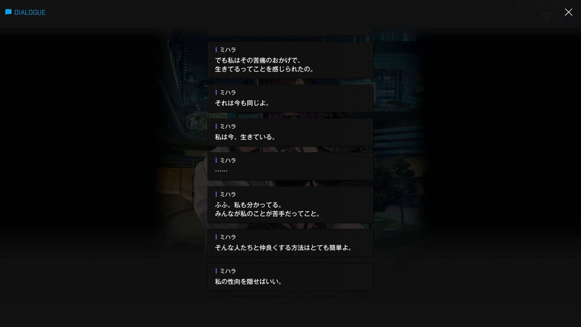 アークテロ後、ミハラがユニ共々シュエンに追放される際、彼女から暴言を吐かれても感謝の意を述べて去ったのはこれが理由(サイドストーリー『WORDLESS』のPART 03『STAGE 13』より)