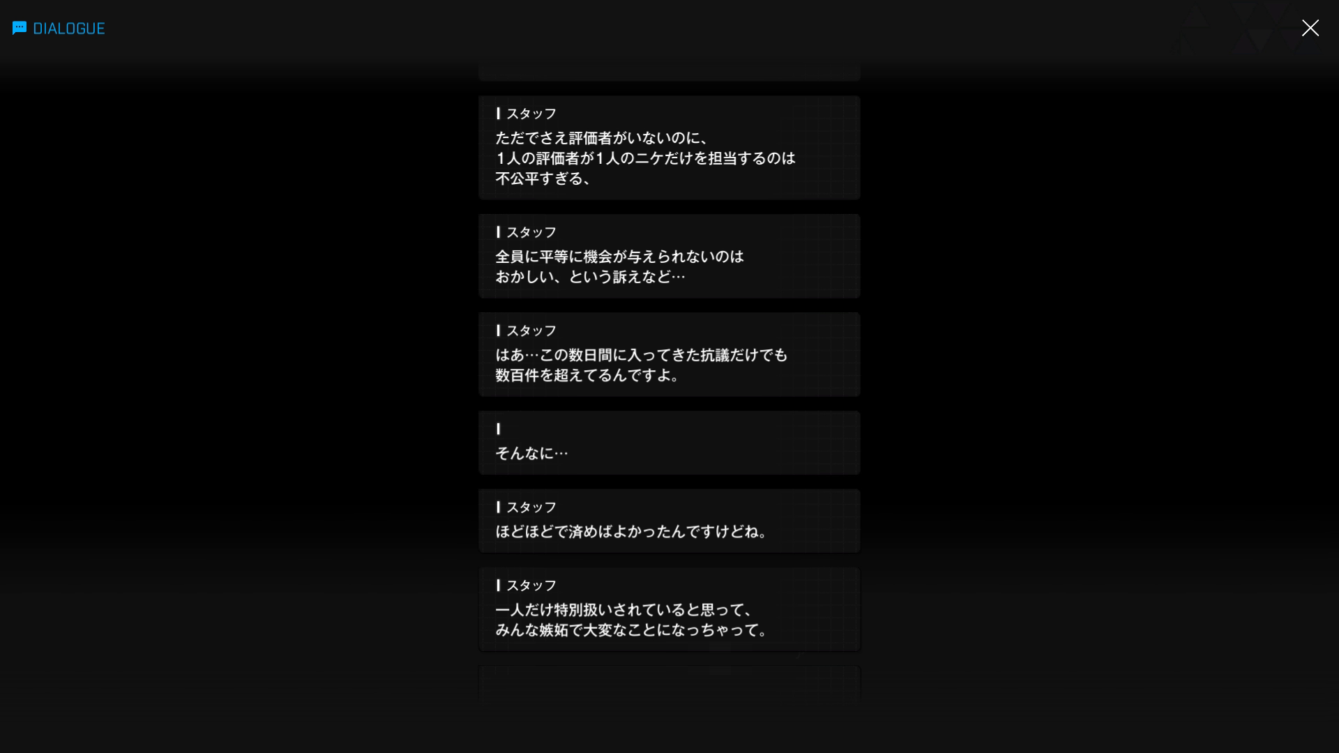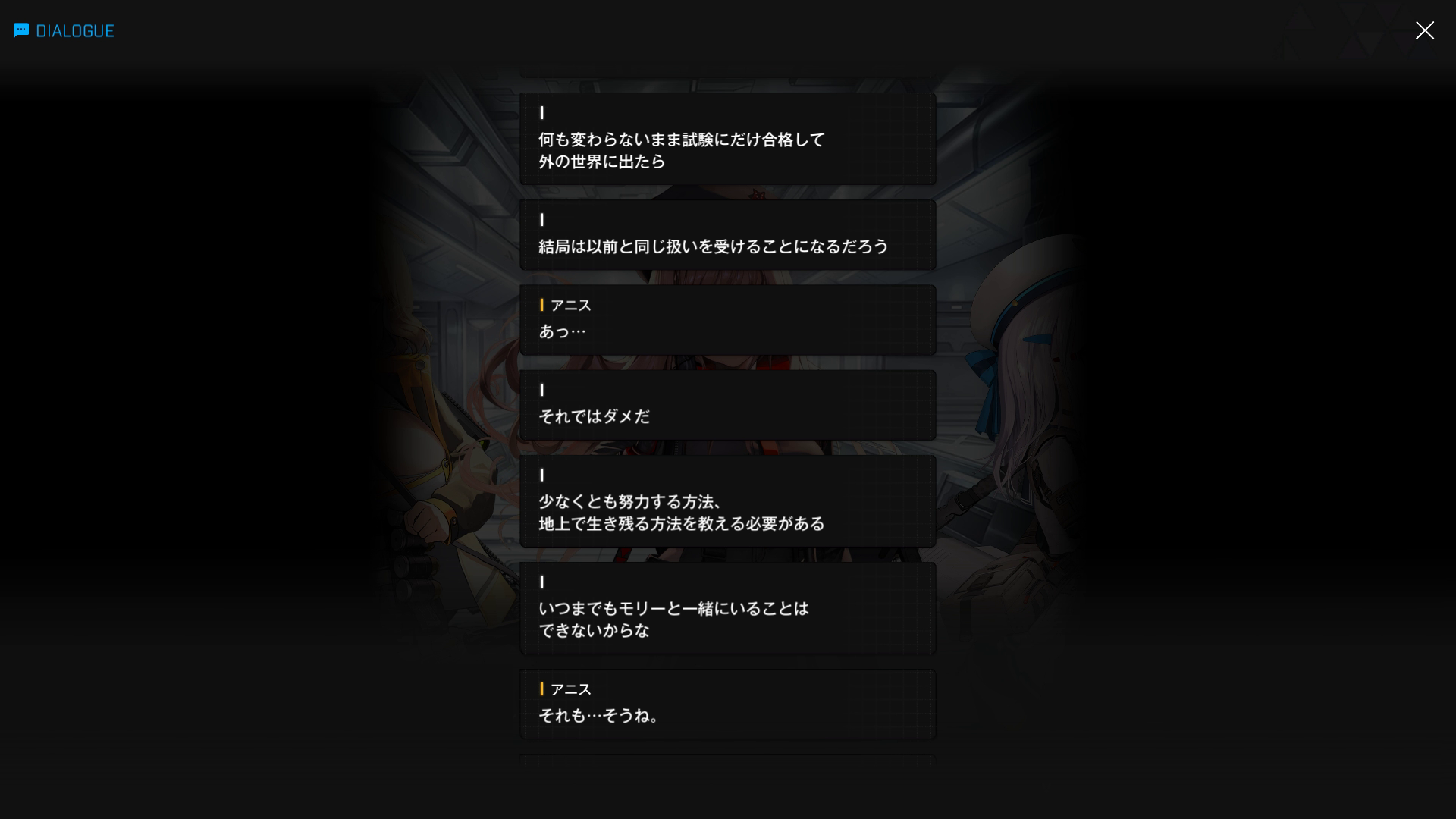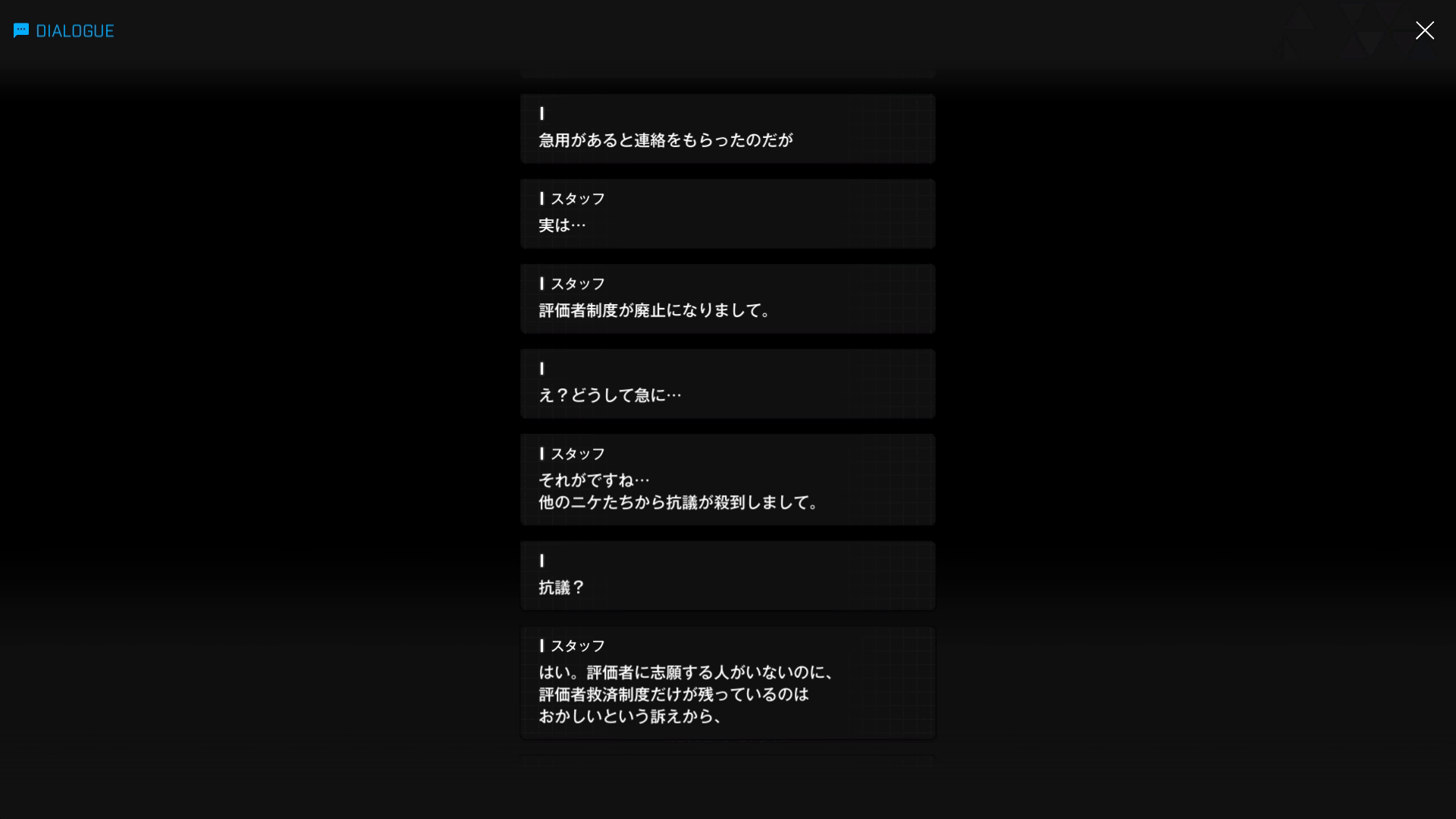 ⑤これまで判明したデータを正直に報告すると、ニケである彼女には何も回ってこないため、あえて捏造した報告書をシュエンに提出する → 人間の研究員が優先 & 功績も横取りされてしまうらしい(マクスウェルエピソード5より)
