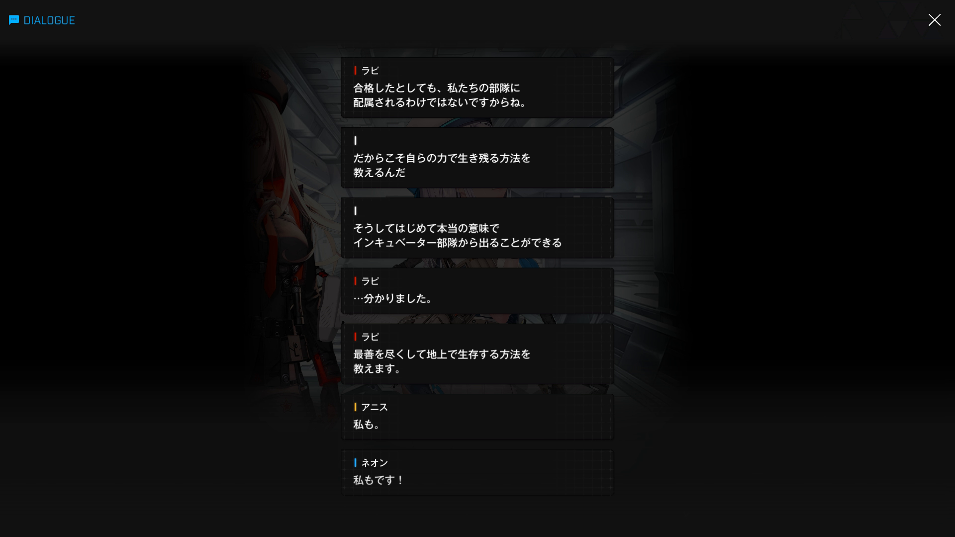 ・ニケになった以上「使えないから即廃棄処分」というわけにもいかず、最終的に『インキュベーター 』と名付けられたミシリス部隊に配属される → さらにジエンがサイドストーリー『WORDLESS』でキメラ化したユニの性能実験役に抜擢(シュエン同様、ニケを虐待することに関しては姉妹揃って超一流と言ったところか)