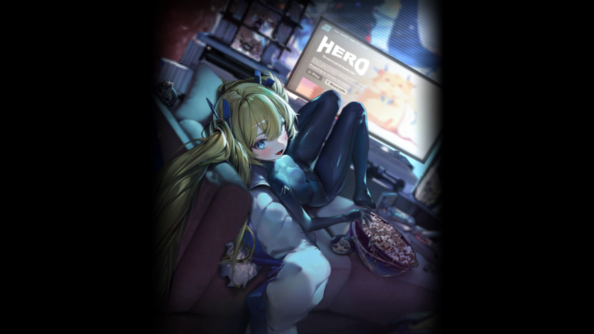 ・彼女のファンのために、宝物開放後の専用背景だけ紹介しておく → よく見ると、いつも羽織っている白いジャンパー?みたいなものを脱ぎ、黒いぴちぴちスーツ?だけの姿になっている(『スーパーグレイトヒーロー!』より)