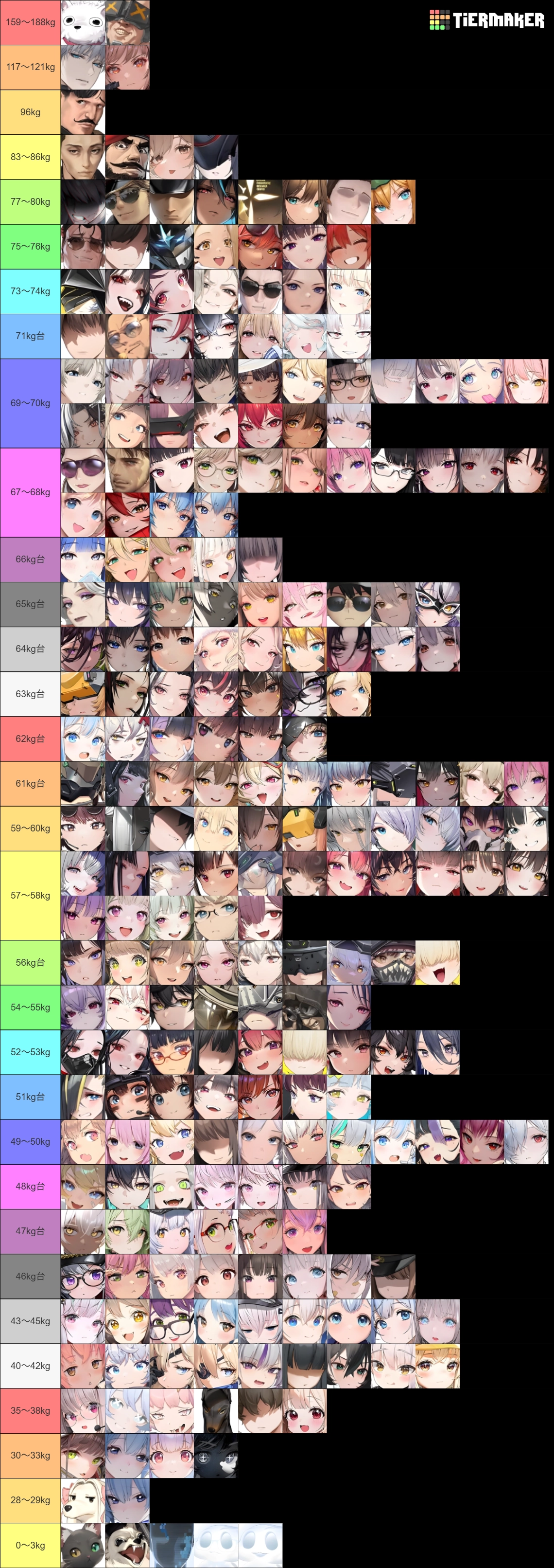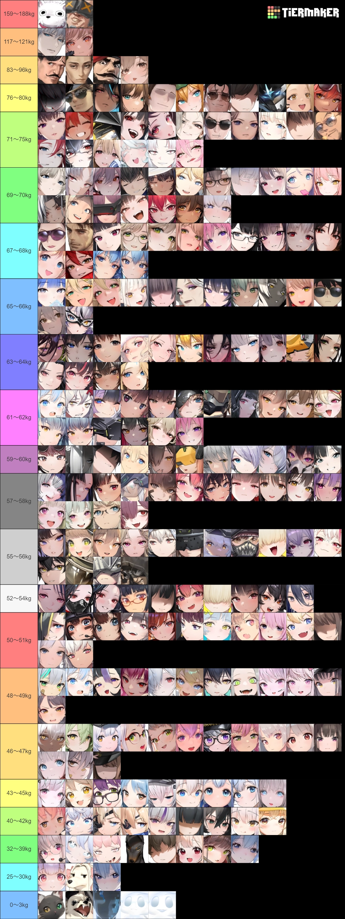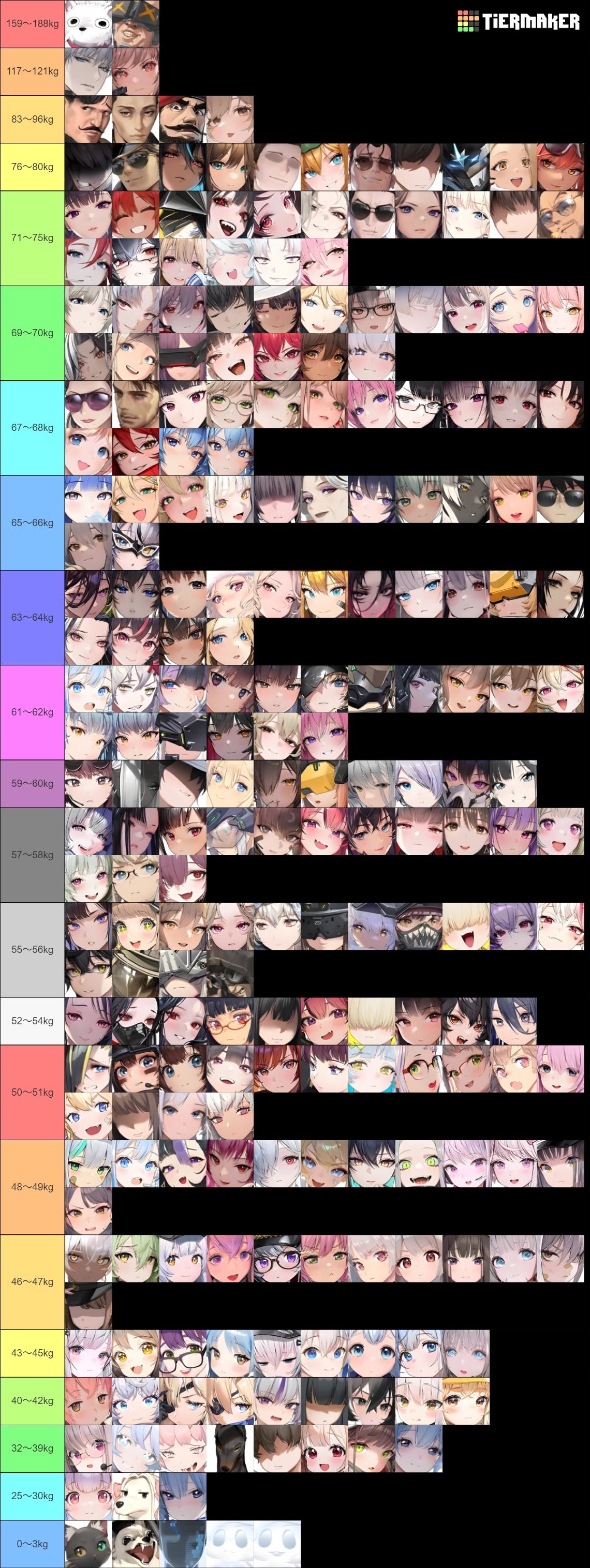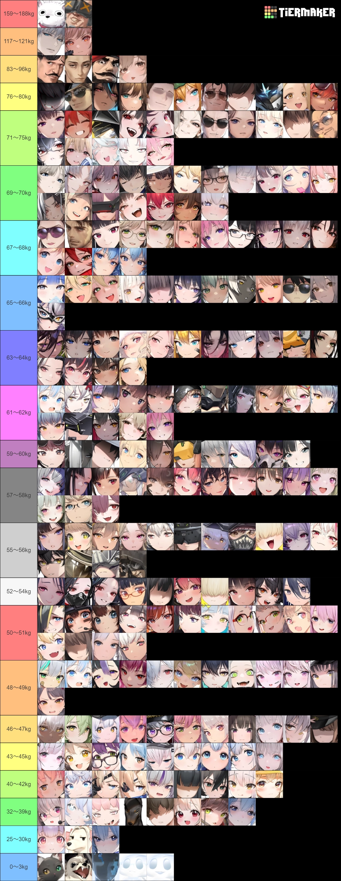 ※ニケ & 人間+実装状態に関係なく、数値的に高い方から50音順で並べました → 基本的に2~3kg刻みが目安なものの、1列分(11名以下)で収まらない場合はその人数分以下になるよう小分けし、よりわかりやすく調整しています。