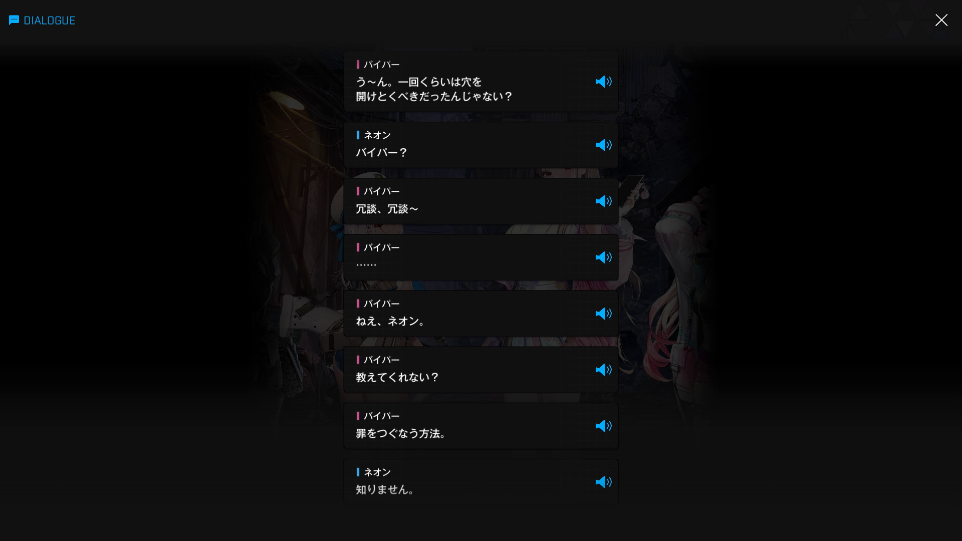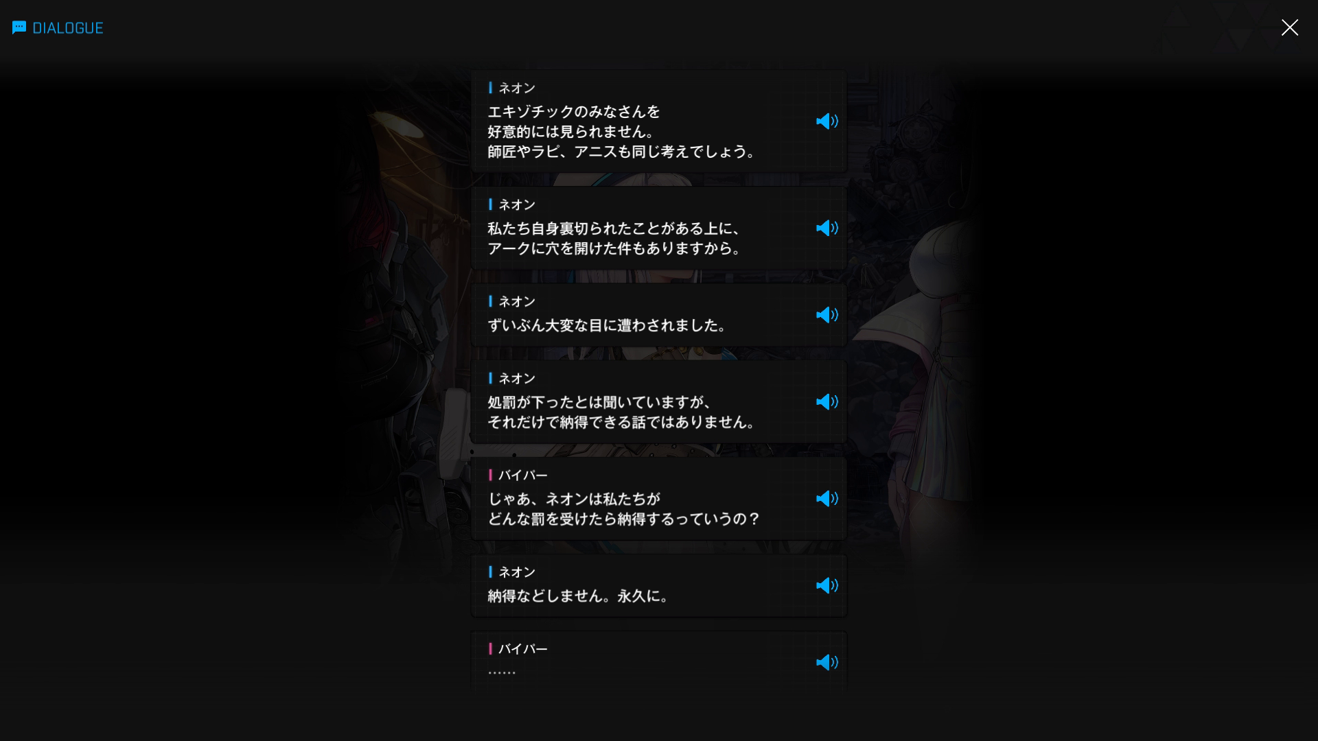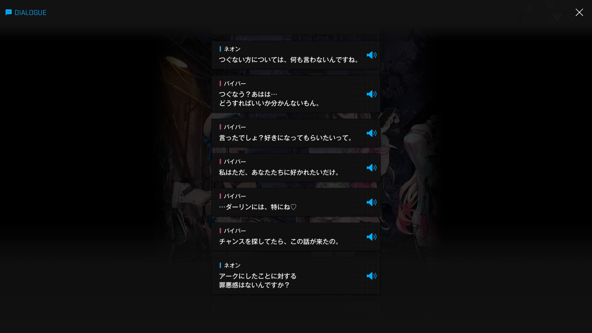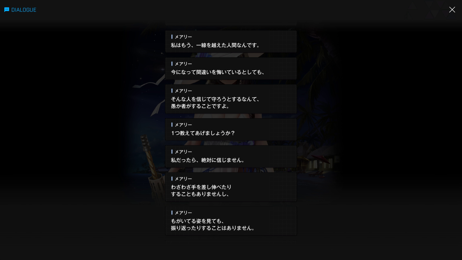 バイパーファンの中には「⋯⋯あの~ネオンさん、ちょっと言い過ぎじゃ⋯⋯?」と思った諸兄も少なからずいたであろうが、管理人からすれば「いいぞ、よく代弁してくれた!」とPC前で称賛 & さらにメアリーの言葉を借りるなら、まさしく以下SSのような超弩級正論パンチをお見舞いしたように感じた → 擁護派にとっては、記憶消去のように過去の罪をなかったことにはできないため、非常に耳が痛い内容だったはず(イベント『Blue Water Island』第2部『夏の奇跡:B』より)