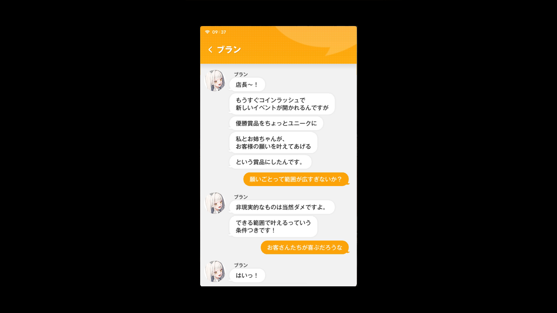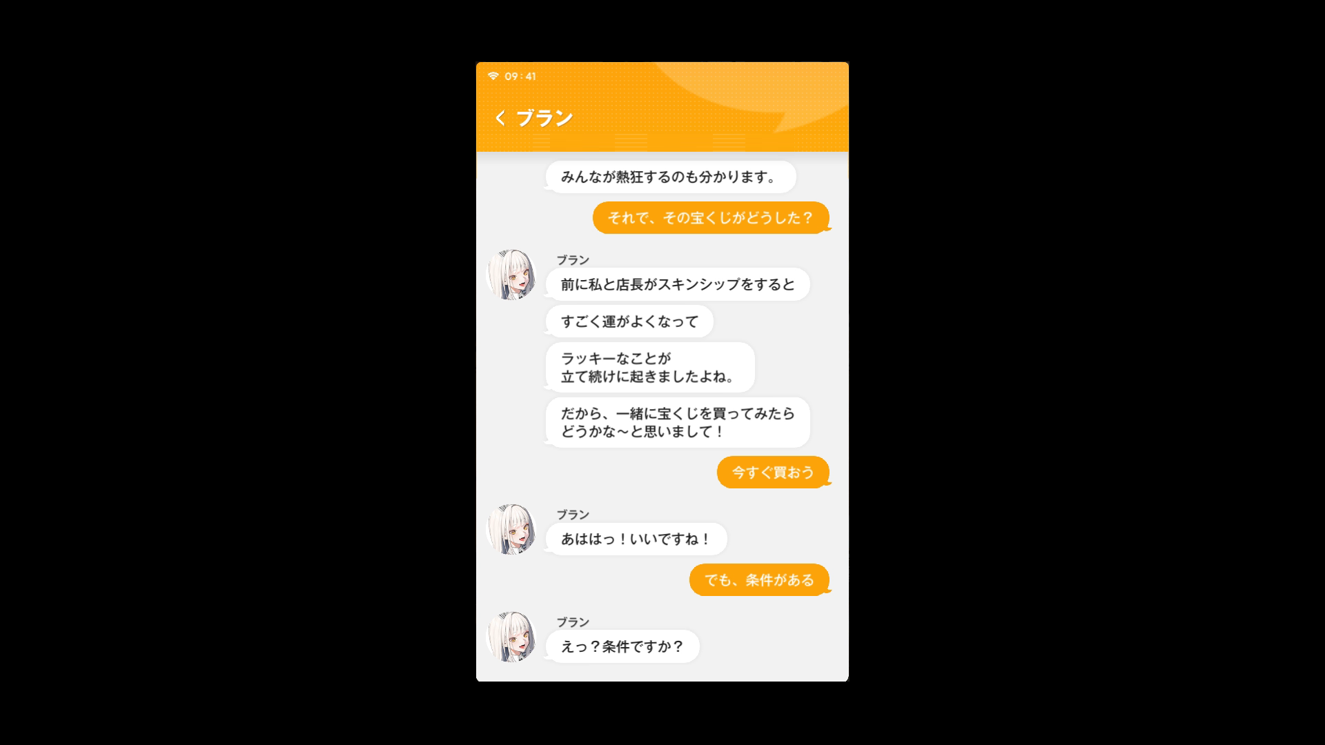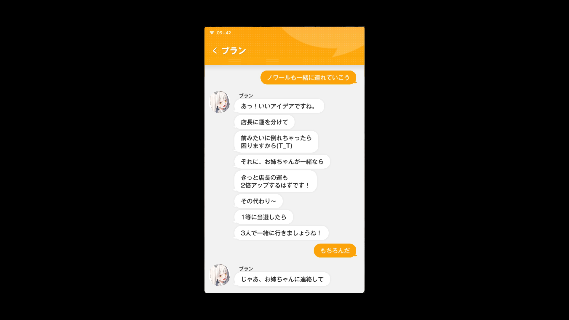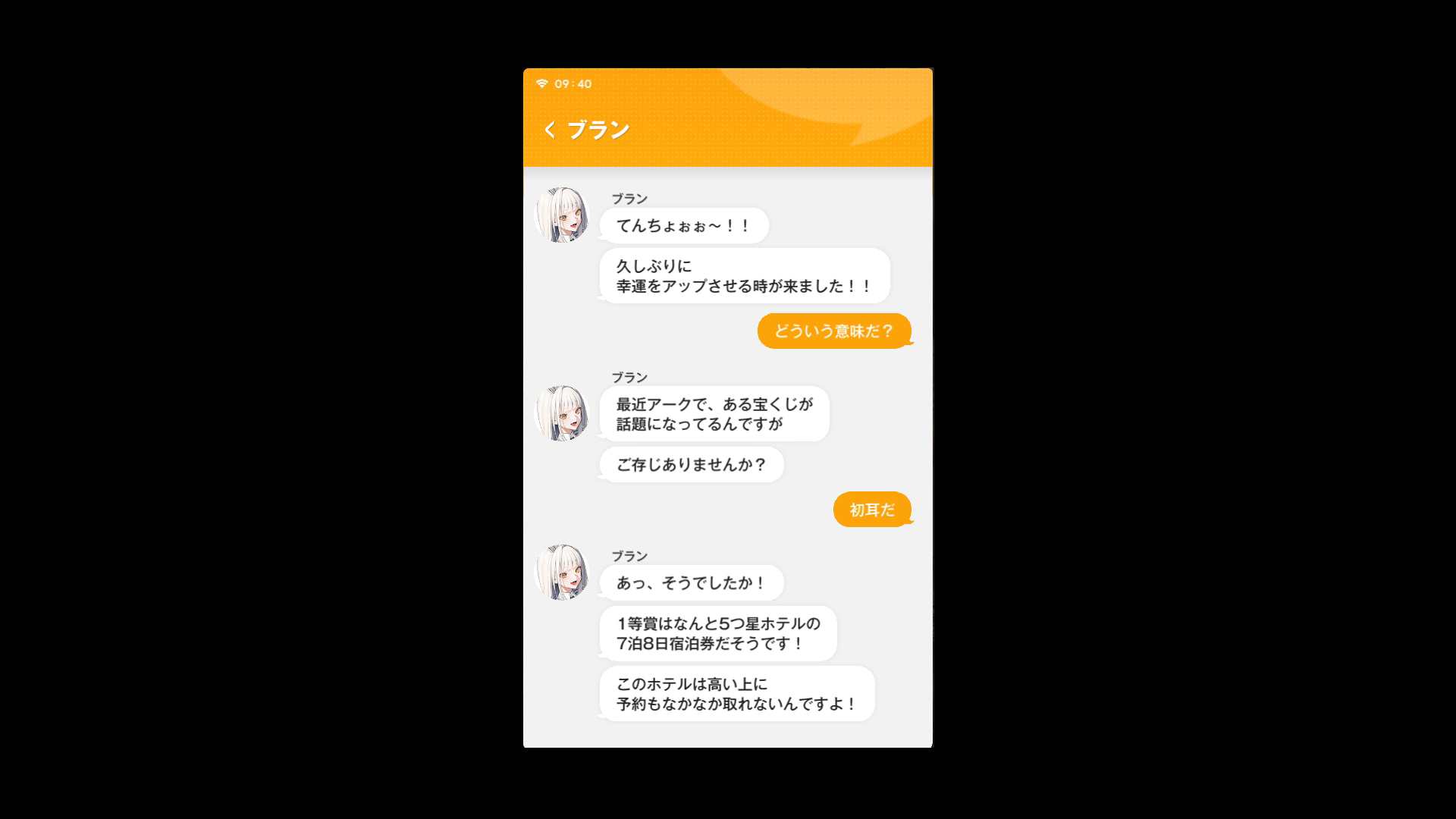 ●幸運の景品抽選イベントで、たくさんの人の中にいたにもかかわらず、司会者から指名されて抽選に挑戦 → 計3回のチャンスのうち、2回目以降に幸運チャージを活用して賞品のランクを上昇させる(ブランエピソード3より)