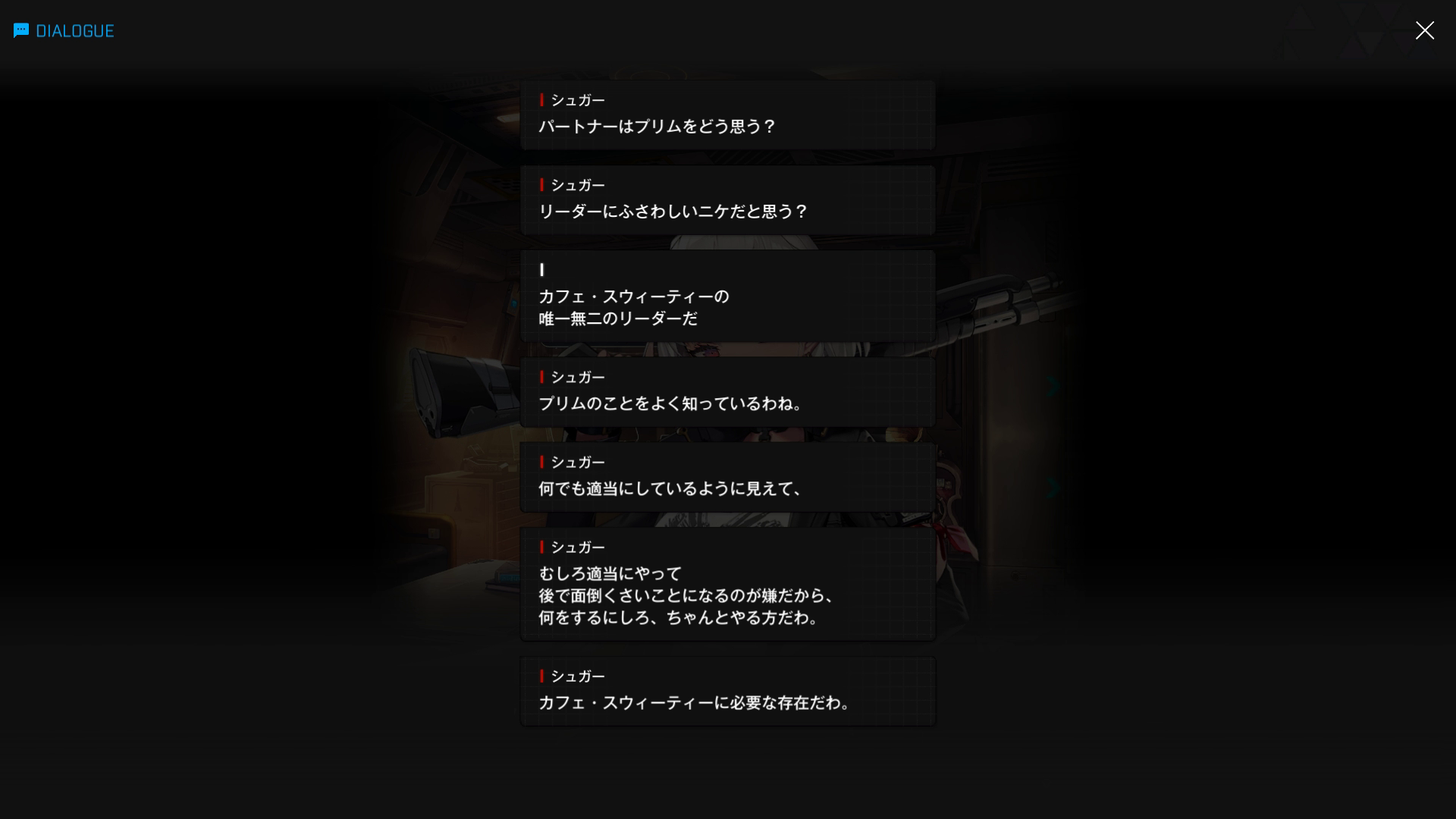 ・「依頼が来て面倒」と言うものの、「依頼人が困る & やりがいがあるから、万屋の仕事を好きでやっている」と明言 → 後述のシュガーも述べているように、『やる時はきっちりやる』のが信条(プリム面談:07より)