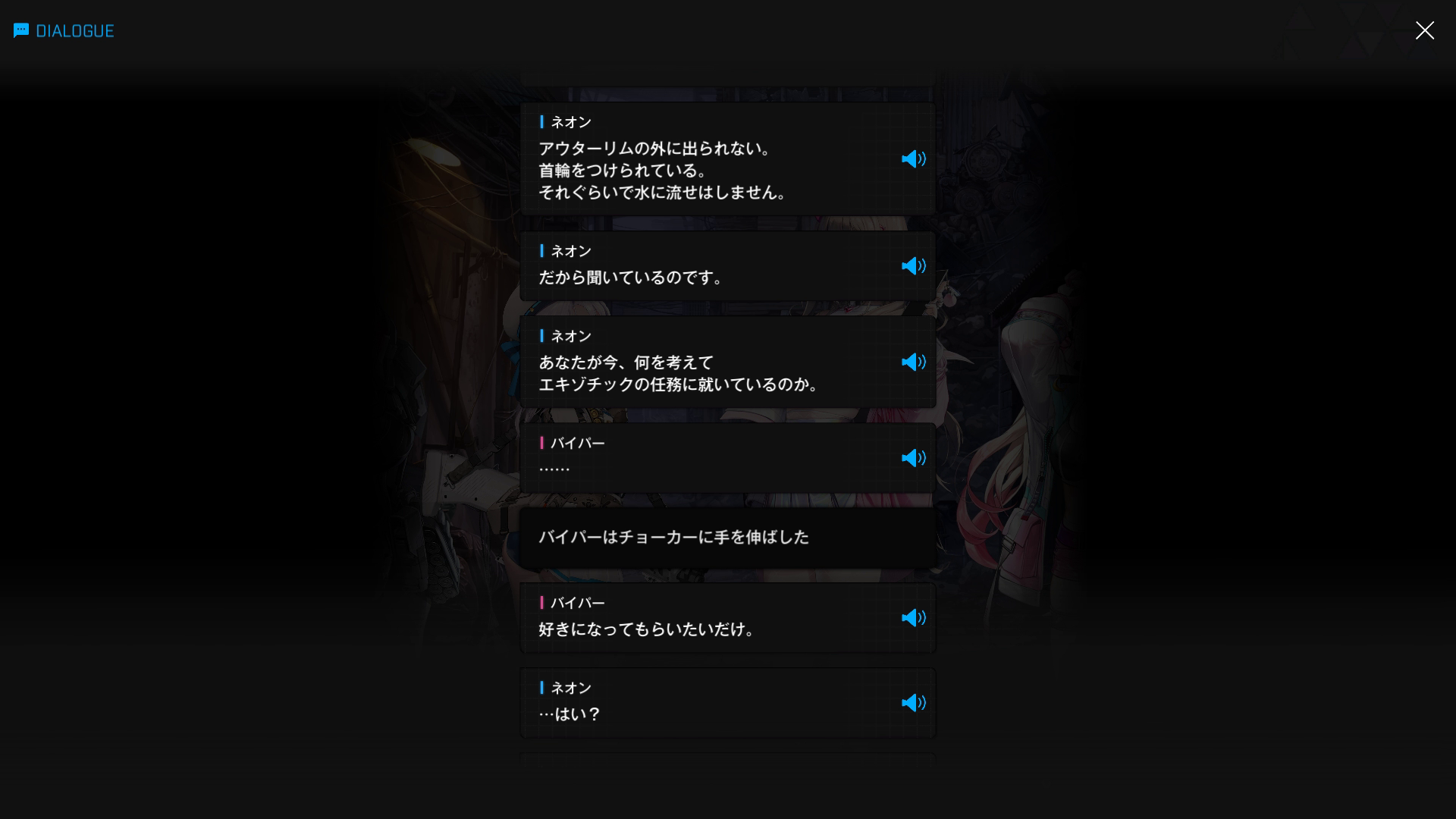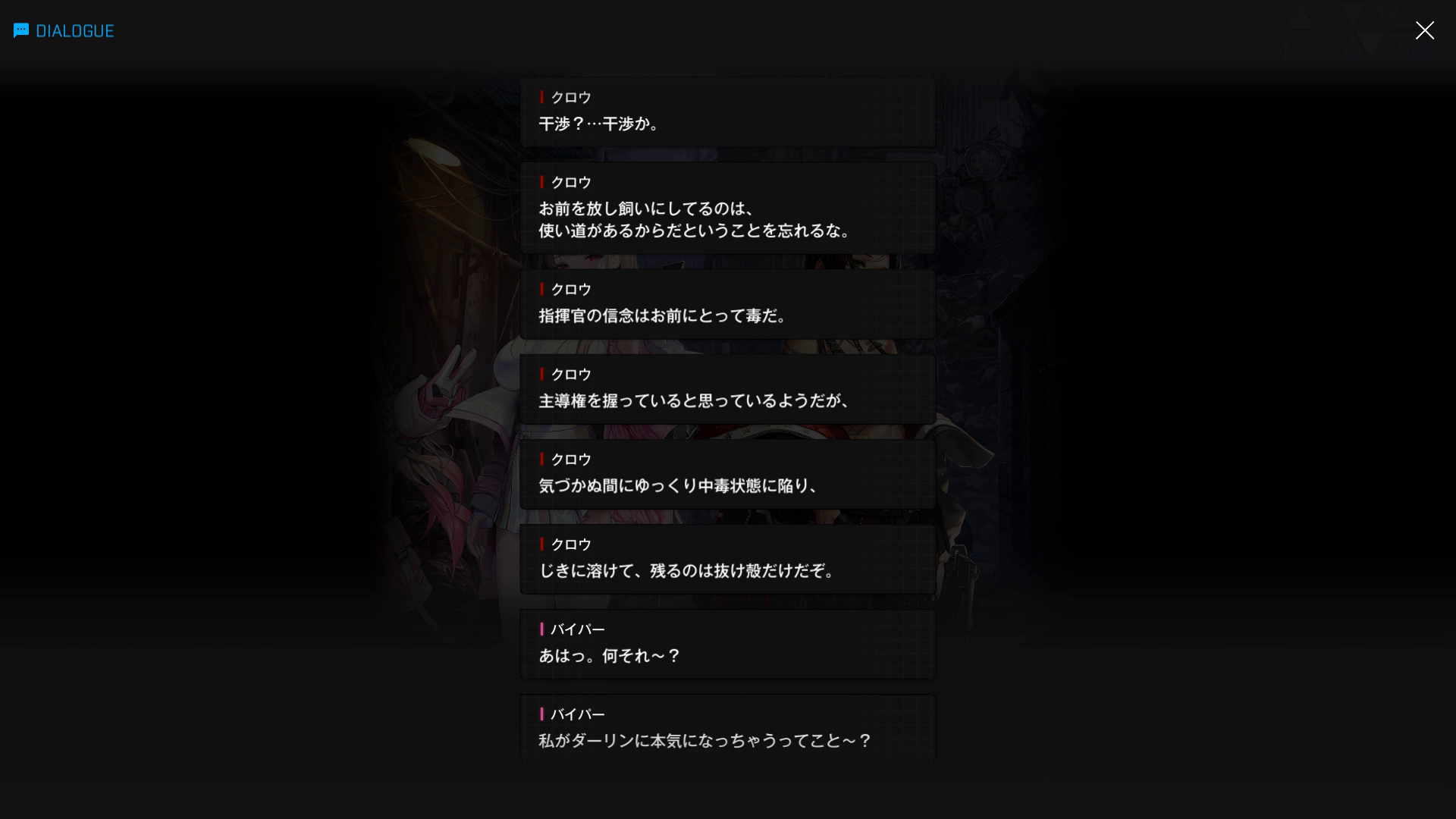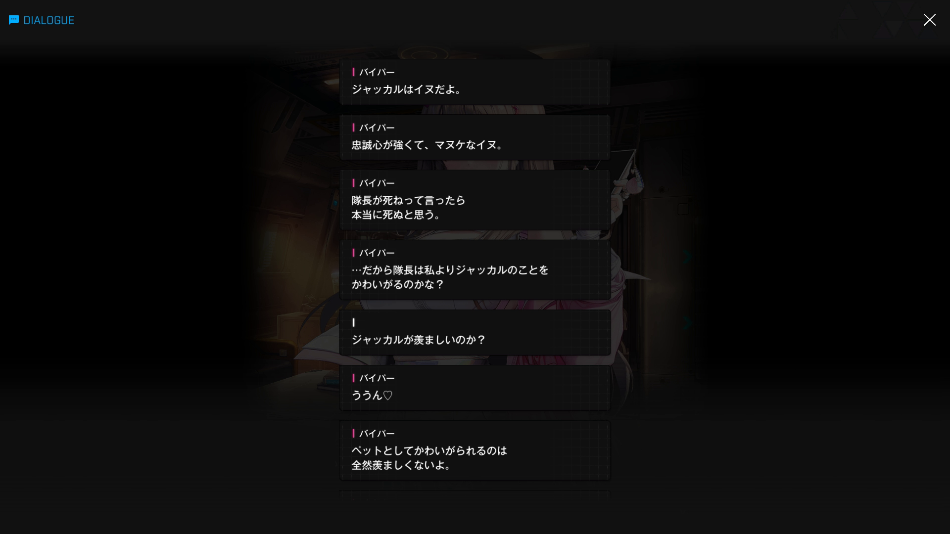 ・自身を以下SSのように認識している反面、アウターリムの過酷極まる環境で鍛えられた謀略能力は、『毒蛇』という彼女の名に相応しく、ニケの中でも1 or 2を争うほど高い(バイパーエピソード2より)