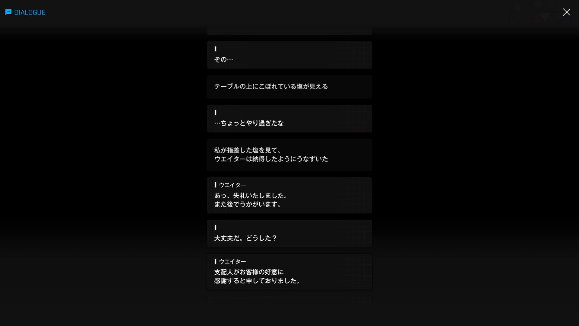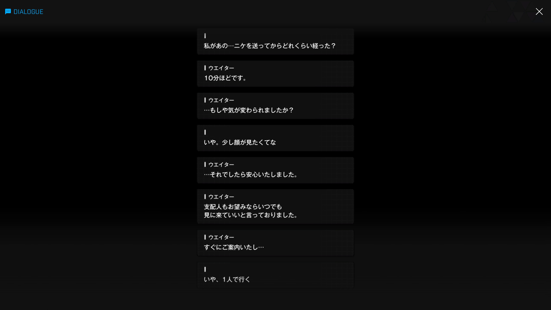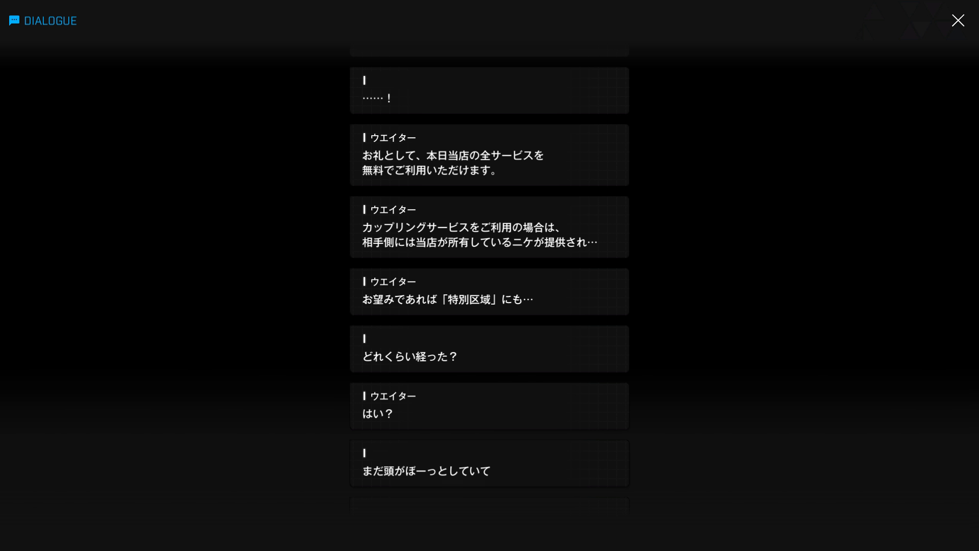 ①入店者がニケを同伴している場合、おそらく入口の監視カメラで容姿などをチェック → 担当者から連絡を受けた支配人が実際に映像を確認し、彼の好みに応じて客をランク付けする(主人公の場合、『資源採集部隊の指揮官』という偽の身分に加え、抜群のスタイル & 美貌のバイパーが一緒だったため、以下SSのようなおもてなしを受けた)