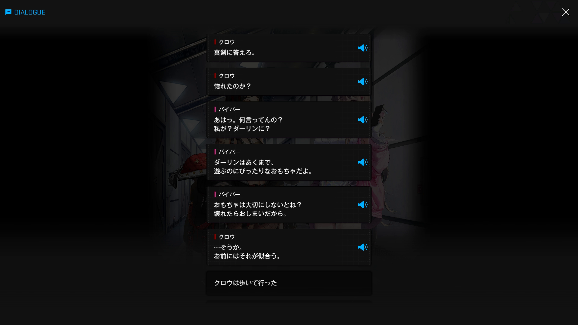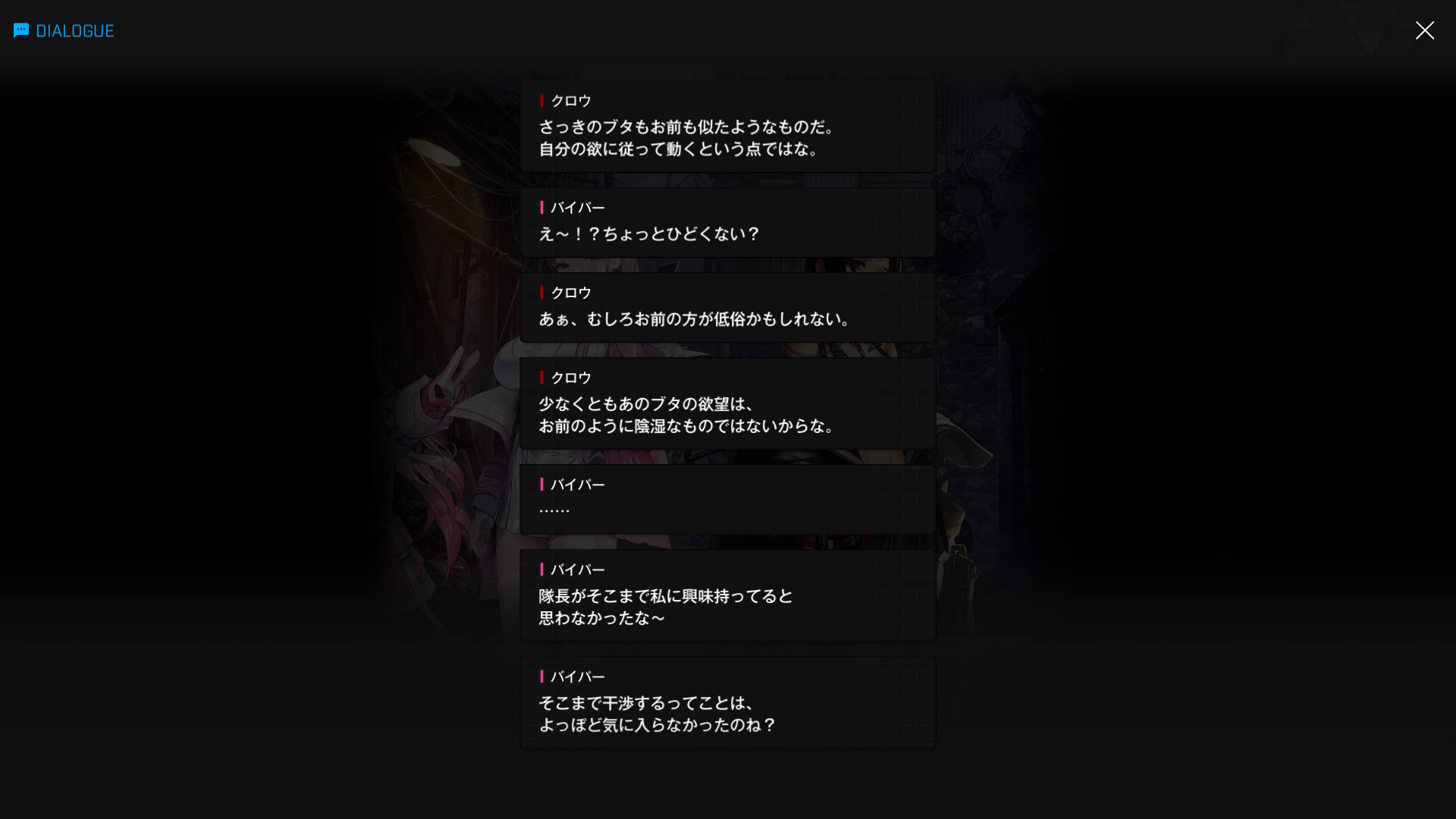 ちなみに、ジャッカルが「私達、結局やらなきゃいけないことは変わらない(ってバイパーが言ってた)」と語っているため、このイベントはこちらでクロウが更生館にブチ込まれて以降の内容と確定(『交わらない2人』より)