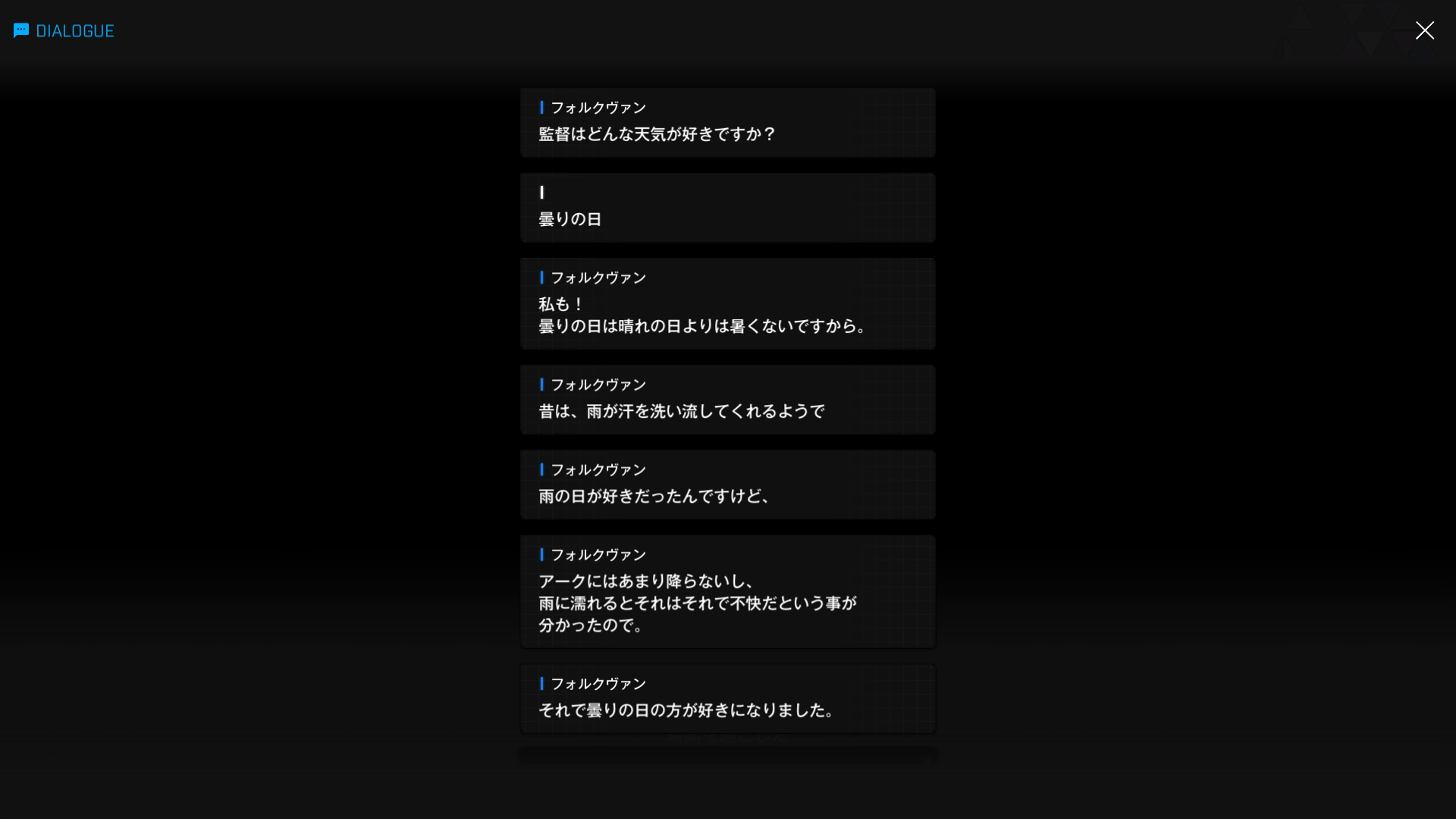 ・晴れの日は「暑すぎて大嫌い」だが、他の天気については以下SSのとおり(フォルクヴァン面談:05より)