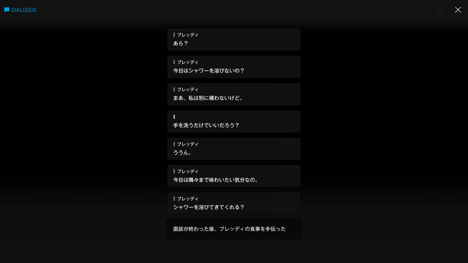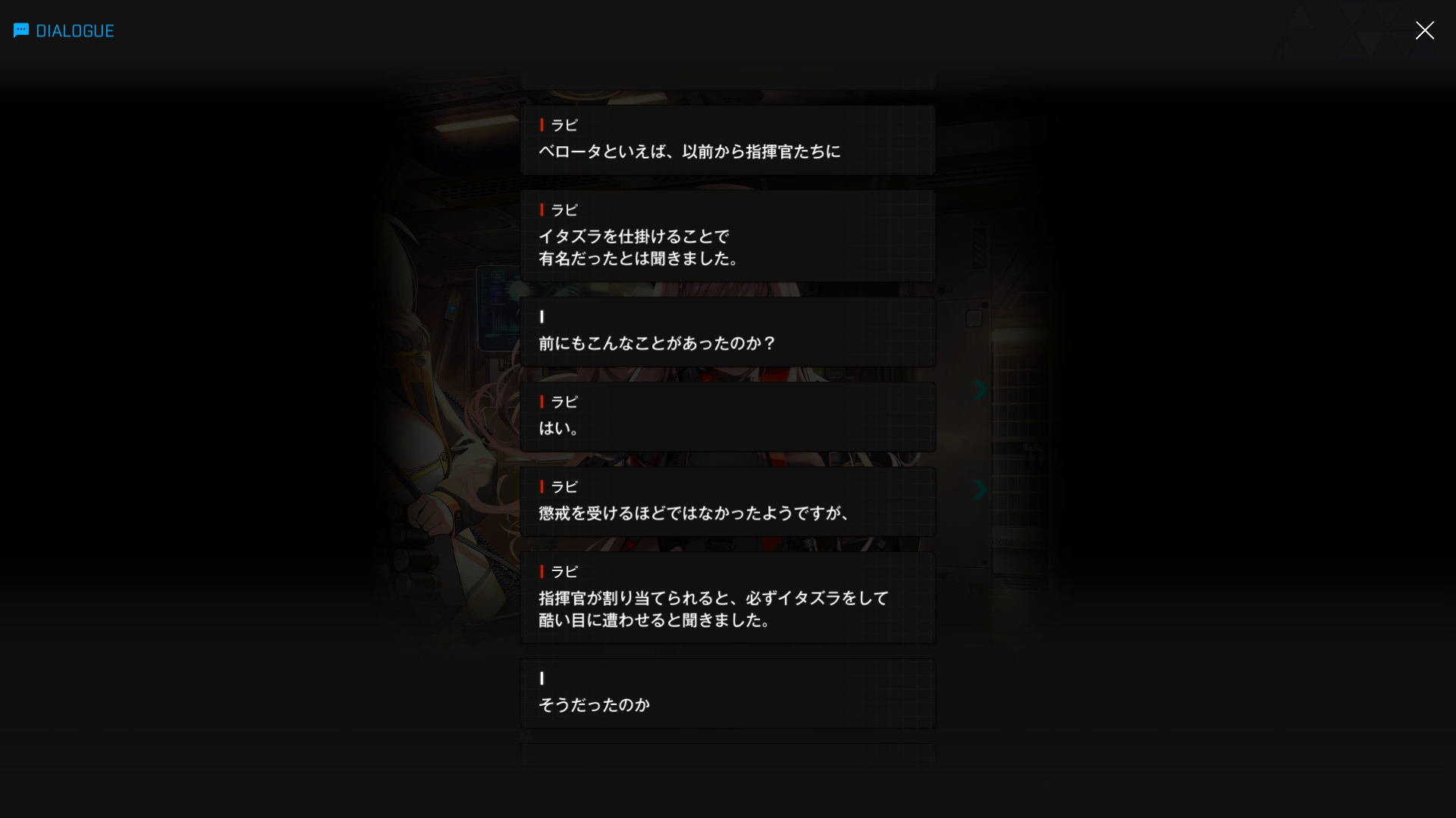・指揮官室の床に落ちていたラピの髪の毛を拾い上げて「ペロッ」としてしまう → 人間の常識を当てはめてはいけないのだろうが、1つ前の内容で「衛生面が云々~」と言ってたよねキミ⋯⋯?(ブレッディ面談:12 & 13より)