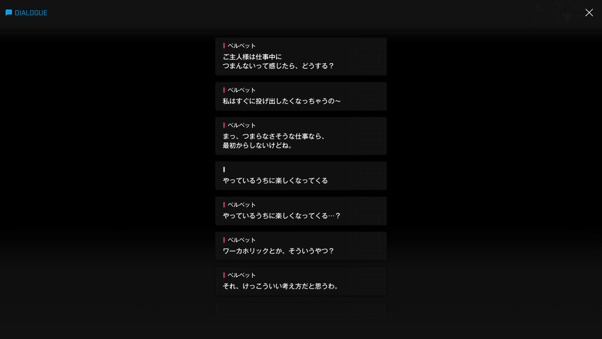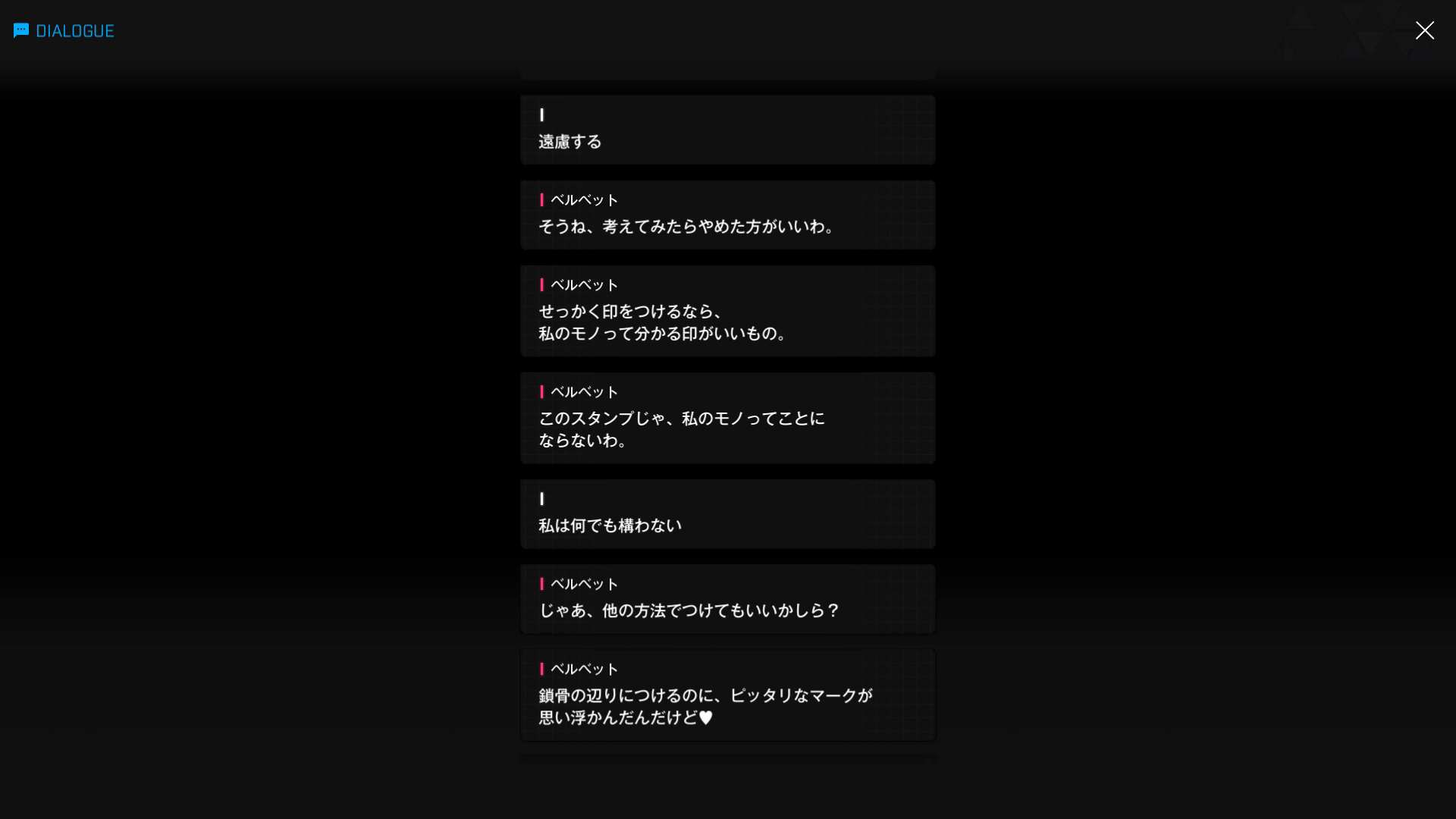 ・彼女曰く「私の本気のセクシーな姿を見たら、一生記憶から消えなくなるくらいスゴい」とのこと → ⋯⋯いや、逆バニー姿の某ゲームマスター & エロバニー姿の某女医+エグイ水着の某裏組織ボスに加え、アナタの職場にいる某メイドの破廉恥極まる姿など、すでに錚々たる面子が主人公を誘惑済みなんですが⋯⋯?(ベルベット面談:10より)