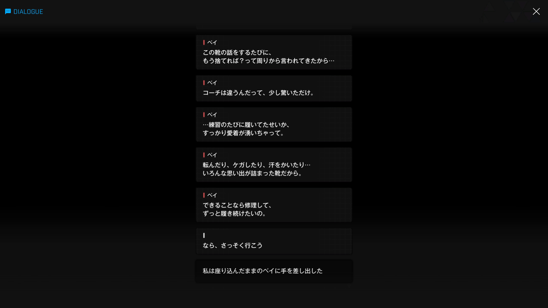 ・彼女が練習に使用する靴は、チアリーディングを始めた時から履いているものらしく、以下SSのような理由により捨てられずにいた → さらに、クレイから「1ヶ月以上前から靴底が剥がれていたので、いつも見てて不安だった」などの事実も明かされる(『転ぶ』&『見つめる』より)