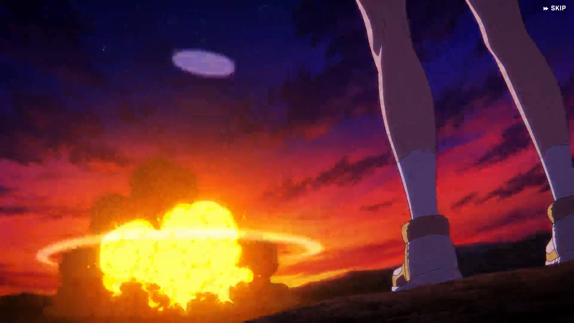 ㉓なぜか無傷:㉒の3枚でもお分かりのとおり、かなりの爆発 & 衝撃波が発生していますが、よっぽどアニスが重⋯⋯もとい頑丈なのでしょう、棒立ちのまま巨大な花火?を眺めています →『巨塔 & ステージがどれだけ離れていたのか』という問題はもはやどーでもよく、『衝撃波が可視化している』事実もさることながら、狂犬は一向に逃げ隠れしていません