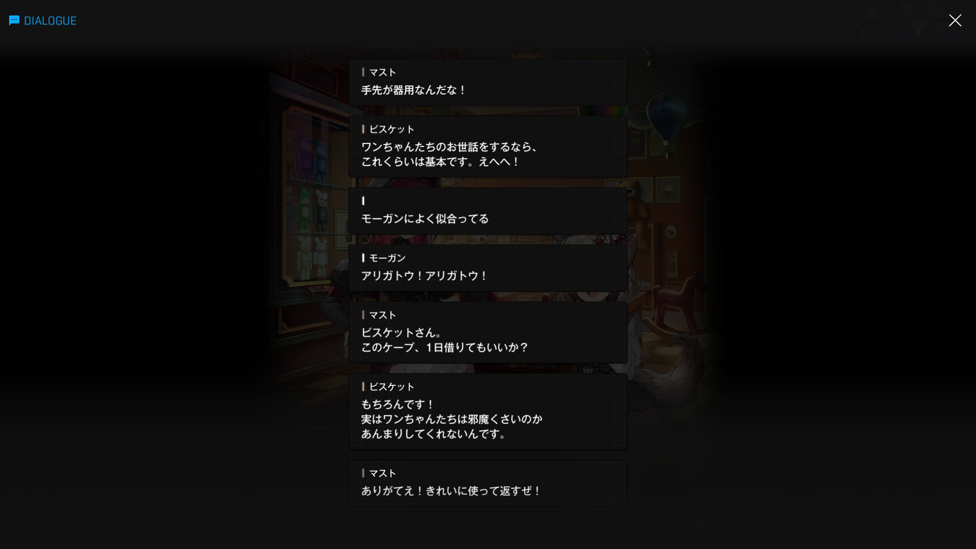 ・自ら状況を判断 & その場に応じた返答しているあたり、人語の理解はもちろん、空気を読めることもほぼ間違いないだろう(突発イベント『おもちゃショップ』の『持ちつ持たれつ』より)