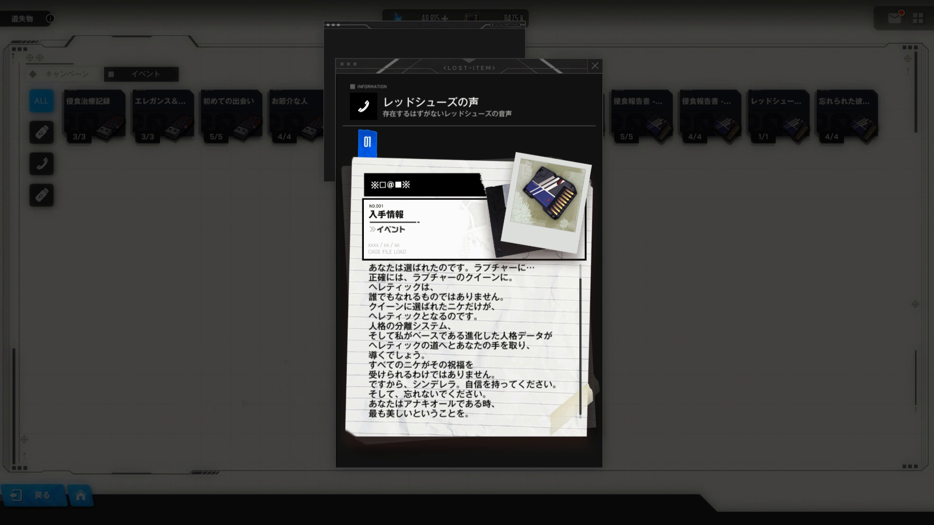 ・上記のとおり、オリジナルのような長ったらしい話 & 上から目線な物言い+いちいち似たような言葉を繰り返す癖もそのままだが、『一体誰が残りかすを作ったのか』という話は明かされていなかった → しかし、他所で以下SSのような証拠が残っているため、ほぼ間違いなくこの『人格データ』がコイツのはず(遺失物『イベント』より)