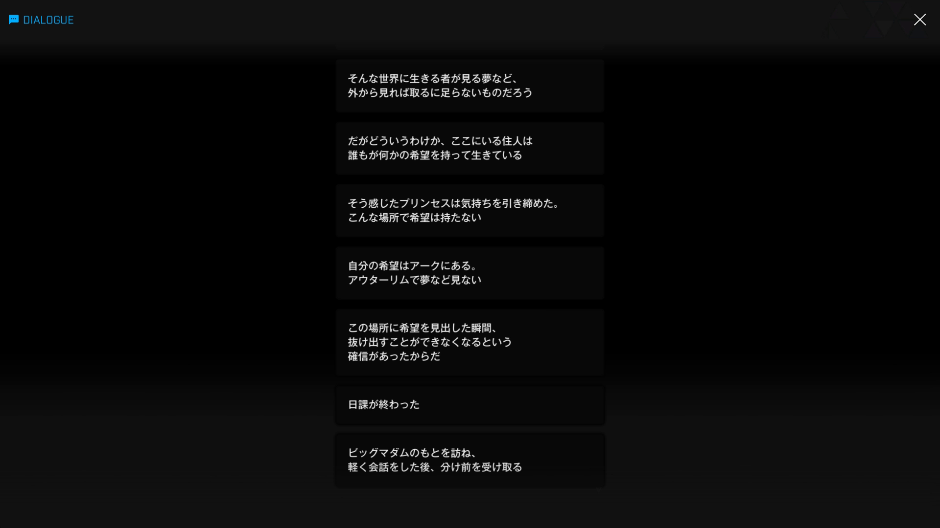 上記は第2部10話までの内容だが、この担当者はプレイヤーを曇らせる(精神的に奈落のドン底へ突き落す)ことが大好きなため、管理人は『エレベーターに乗り込んだものの、扉が閉まる寸前に外へ脱出 & オスワルドが当初言っていた「第5次にアークへ行く」話を信じて最悪の結末を迎える』ような気がしてならない