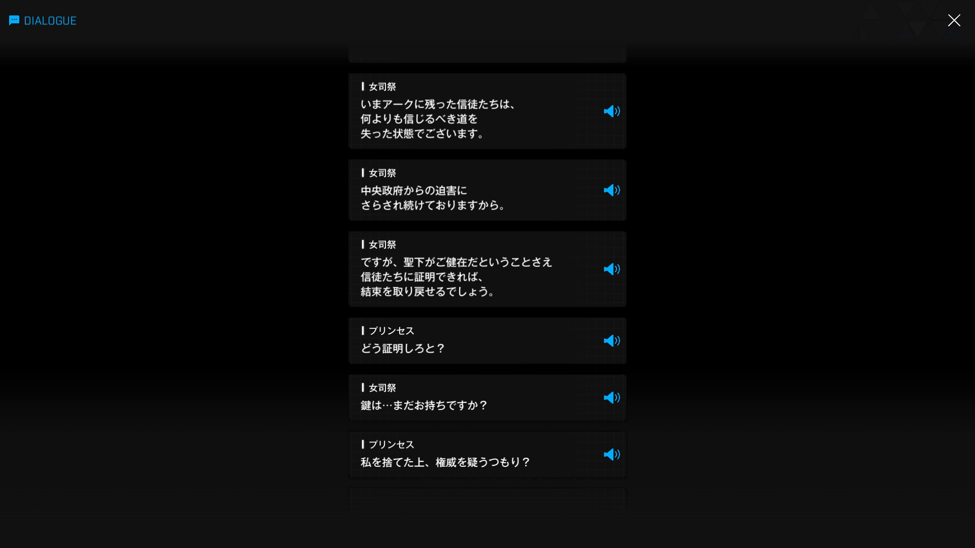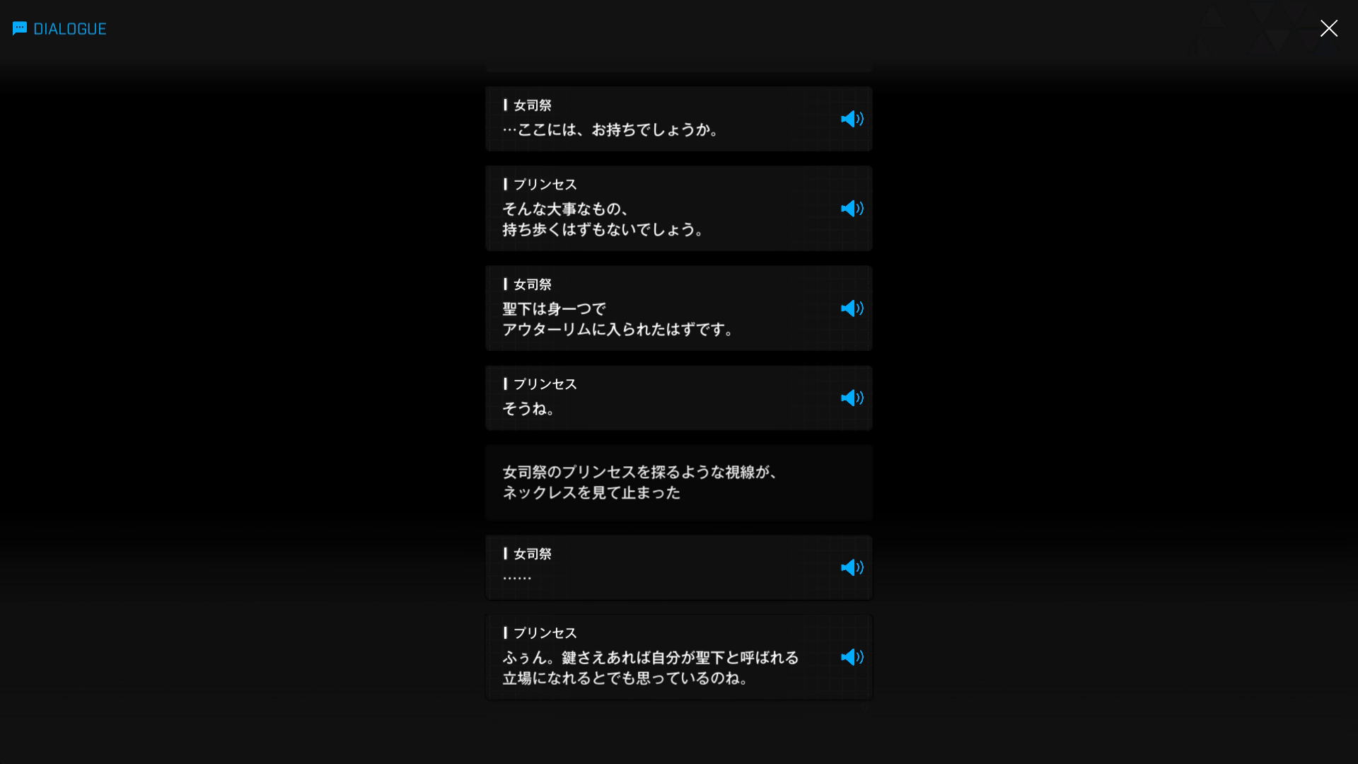 実は最初の密会時、鍵がネックレスであるような芝居をしており、見事に騙された女司祭は文字どおり『衣服だけを残して跡形もなく消滅』する → この謎技術のカラクリは不明だが、発動条件はおそらく『ネックレスを引っ張る or プリンセスの血に反応して一定時間が経過』すれば、肉体のみを消し去る仕組みになっていたのだろう(つまり、万が一聖下に身の危険が迫った際、一切の痕跡を残さず『V.T.C.の叡智の集大成とも言うべき頭脳を闇に葬る』ための最終手段と推測)