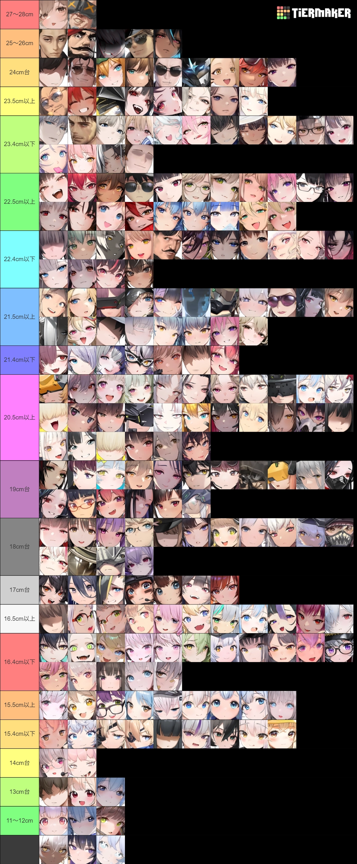 ※ニケ & 人間+実装状態に関係なく、数値的に高い方から50音順で並べました → 基本的に2~3cm刻みが目安なものの、1列分(11名以下)で収まらない場合はその人数分以下になるよう小分けし、よりわかりやすく調整しています。