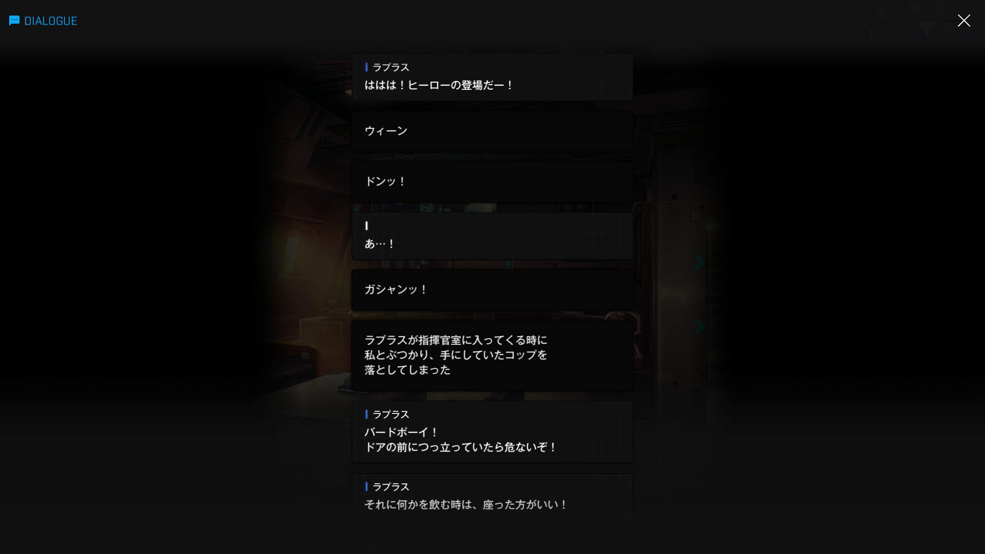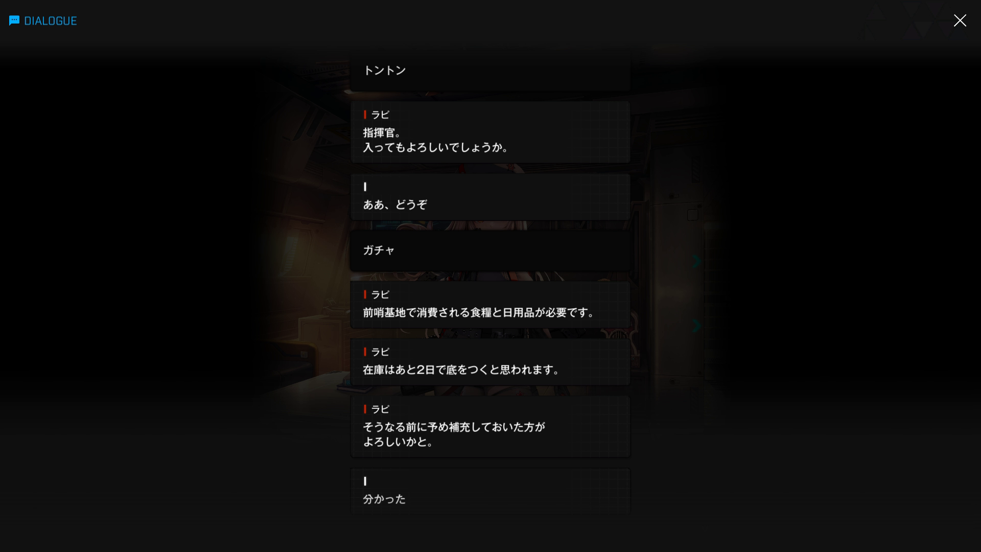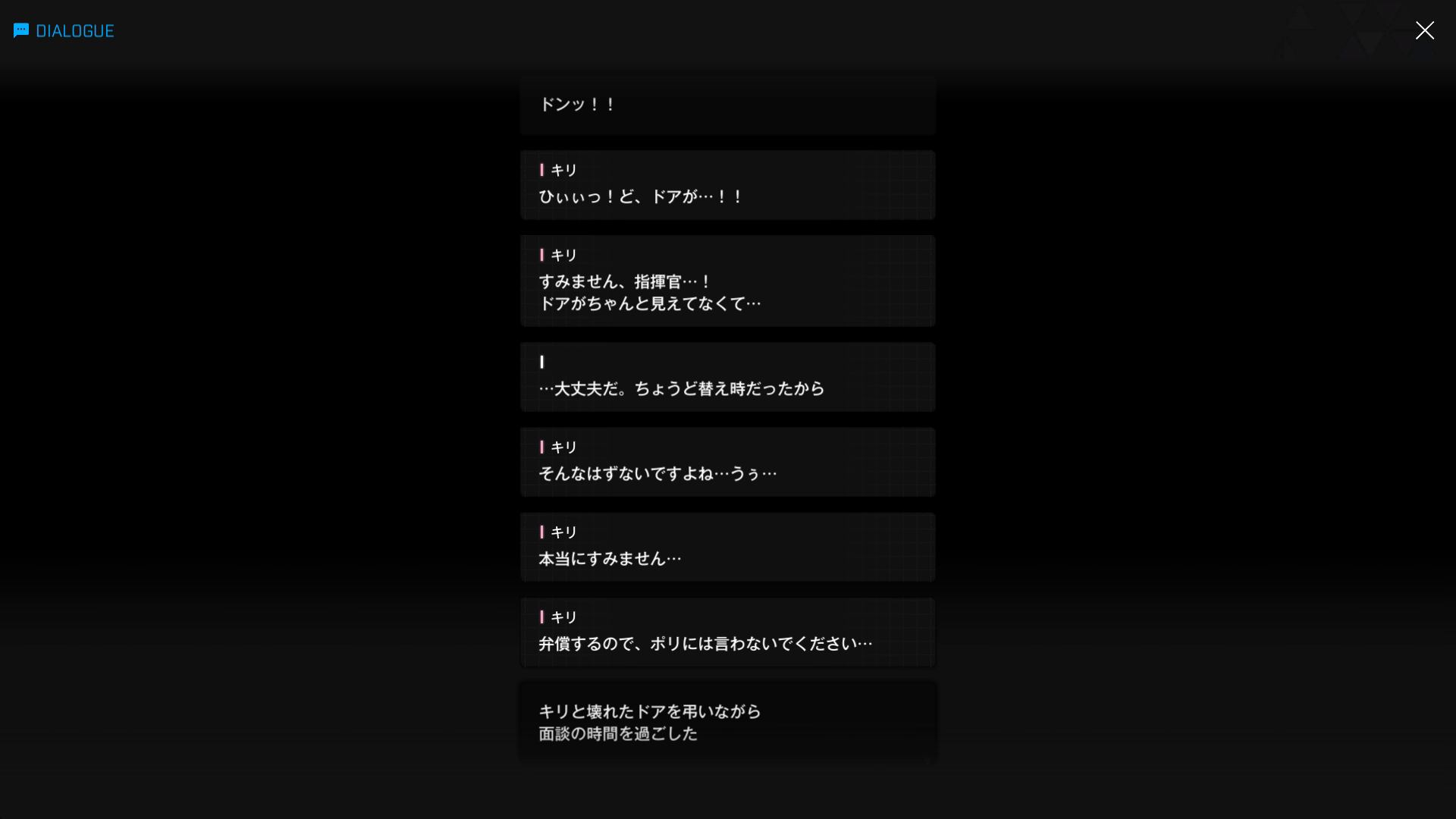 ③入口:サービス開始直後(コマンドセンターに左遷直後)は、以下SSのように手動式だったが、CHAPTER.24『その後』以降指揮官室に戻った描写がない → その間にキリが実装 & 彼女が面談時にドアを破壊しているため、どこかのタイミングで「ウィーン」と開く自動 or センサー反応式のドアに交換したのだろう(ラピエピソード1 & キリ面談:05より)
