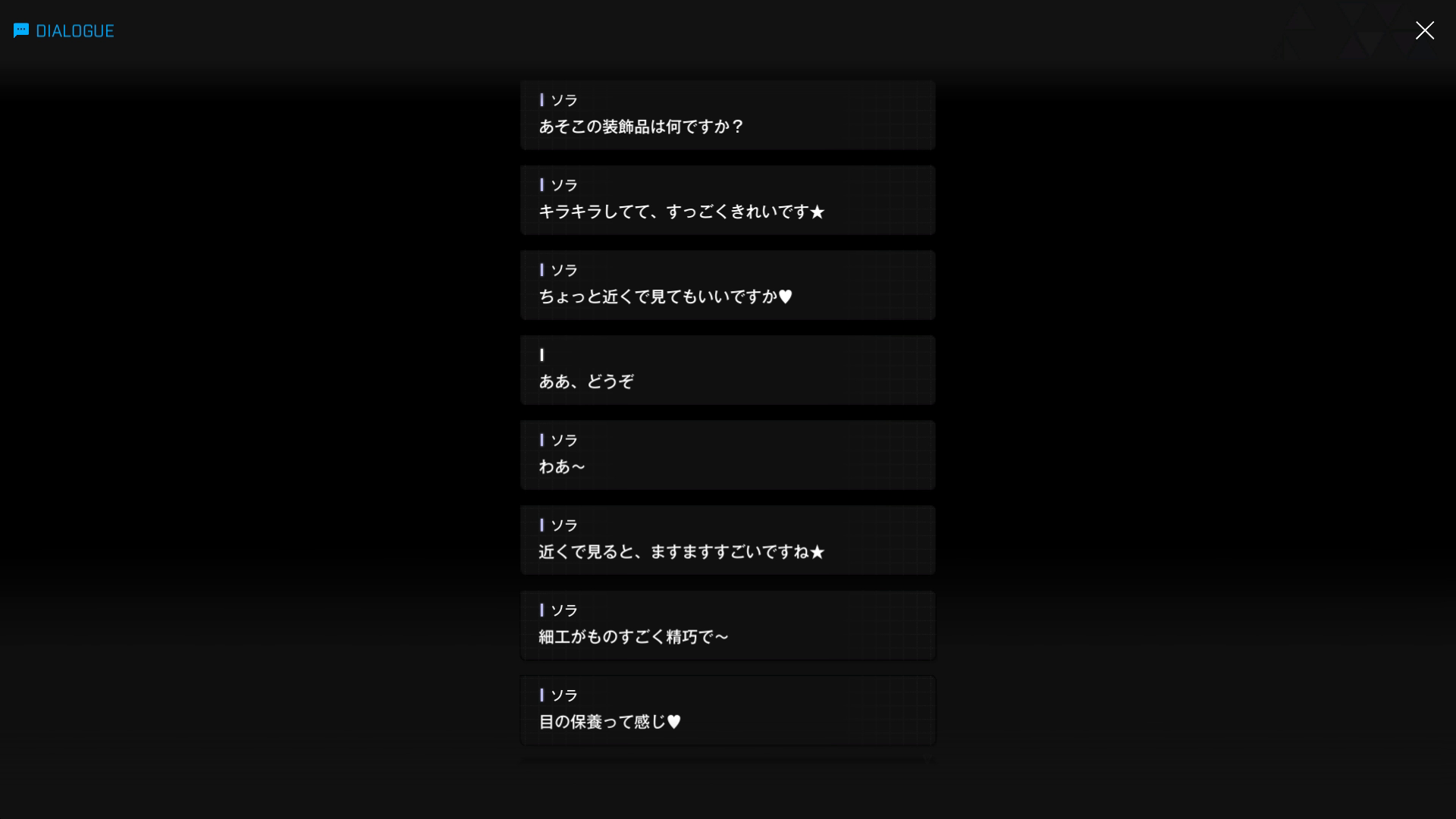 ●装飾品 → 具体的な品名 & 入手先などは不明だが、以下SSのとおり、ソラのお眼鏡にも適うほど(ソラ面談:06より)