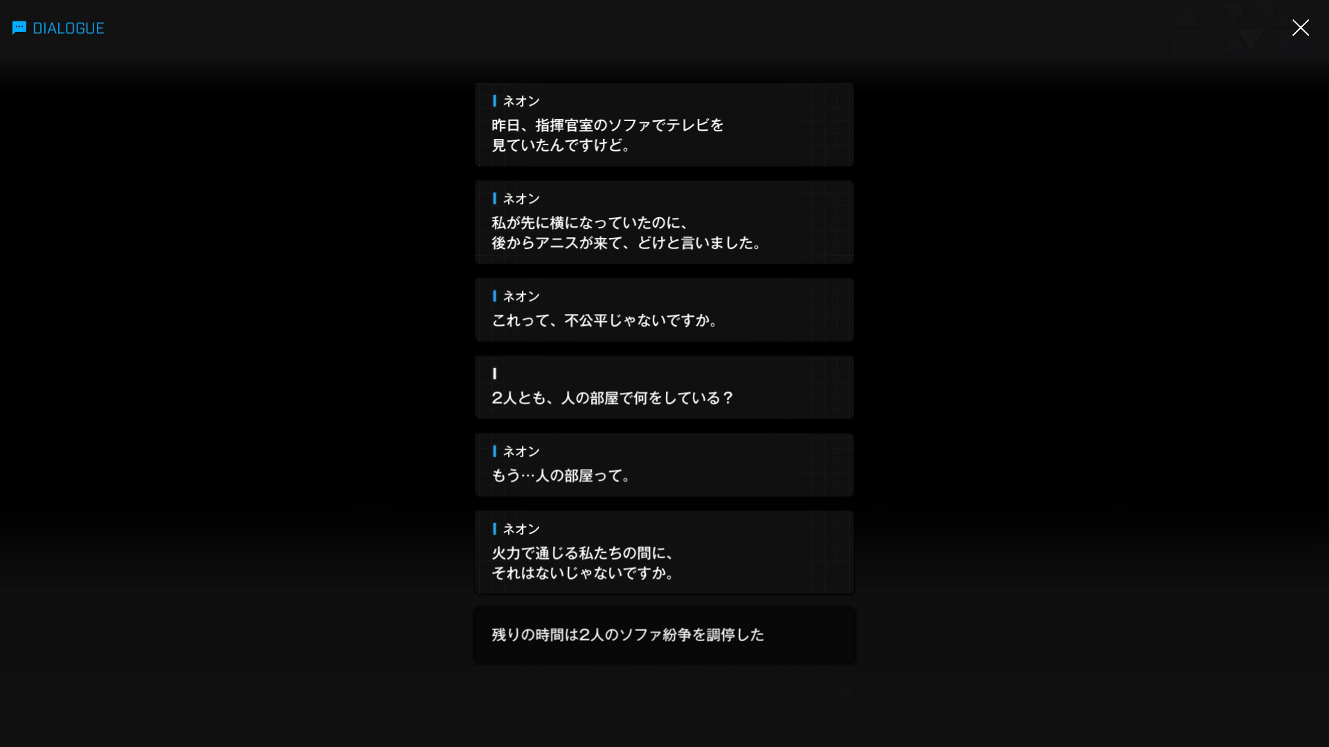ニケ9名が自分達の荷物込みで一気に来室した場合も実際にあるため、このくらいの広さがあったとしても何ら不思議ではない(イベント『SEA, YOU AGAIN』の『海への再帰:B』より)