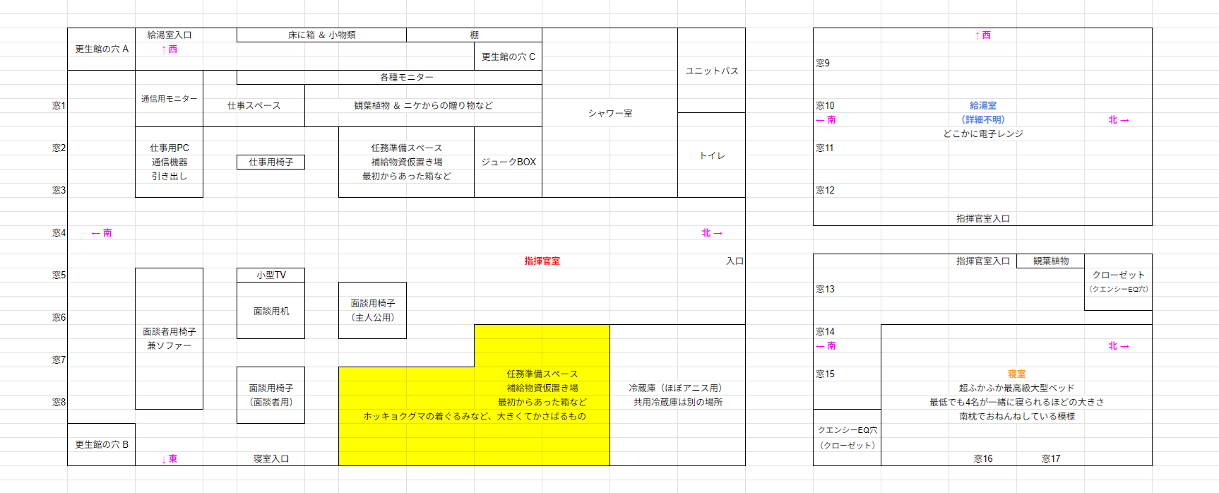⑧冷蔵庫南側のスペース:指揮官という職業柄、地上任務に行く前の準備物資を置く場所は必須なため、特に明記されていなかったここを有効利用する形で、各種内容から3つほど用途を挙げてみた → 詳細 & 出典先は以下のとおり(見取図で黄色く塗った部分が該当エリアで、特に仕切りなどはない)