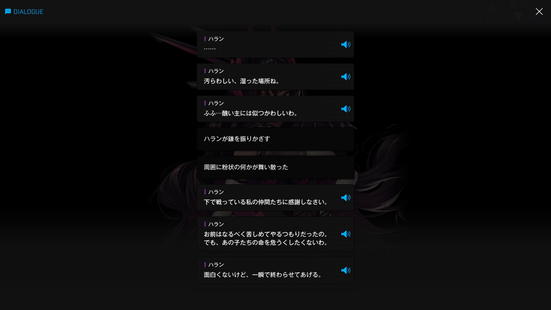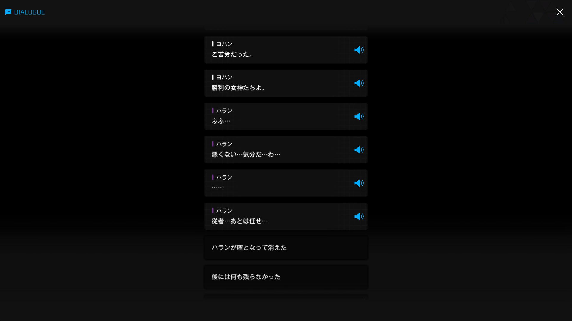 つまり、彼らの会話内容をまとめると、『ハランが他ニケとイチャついている主人公を発見 & お仕置き?のために鎌を持ち直したのを見て、彼女が勘違いしていることをすぐに察知した彼は、「⋯⋯あっ! これはこれはハラン様、今日も非常にお美しい & ご機嫌麗しゅう♡」などと頭を垂れて恭しく挨拶後、即トンズラしてその場を切り抜けた』という感じ