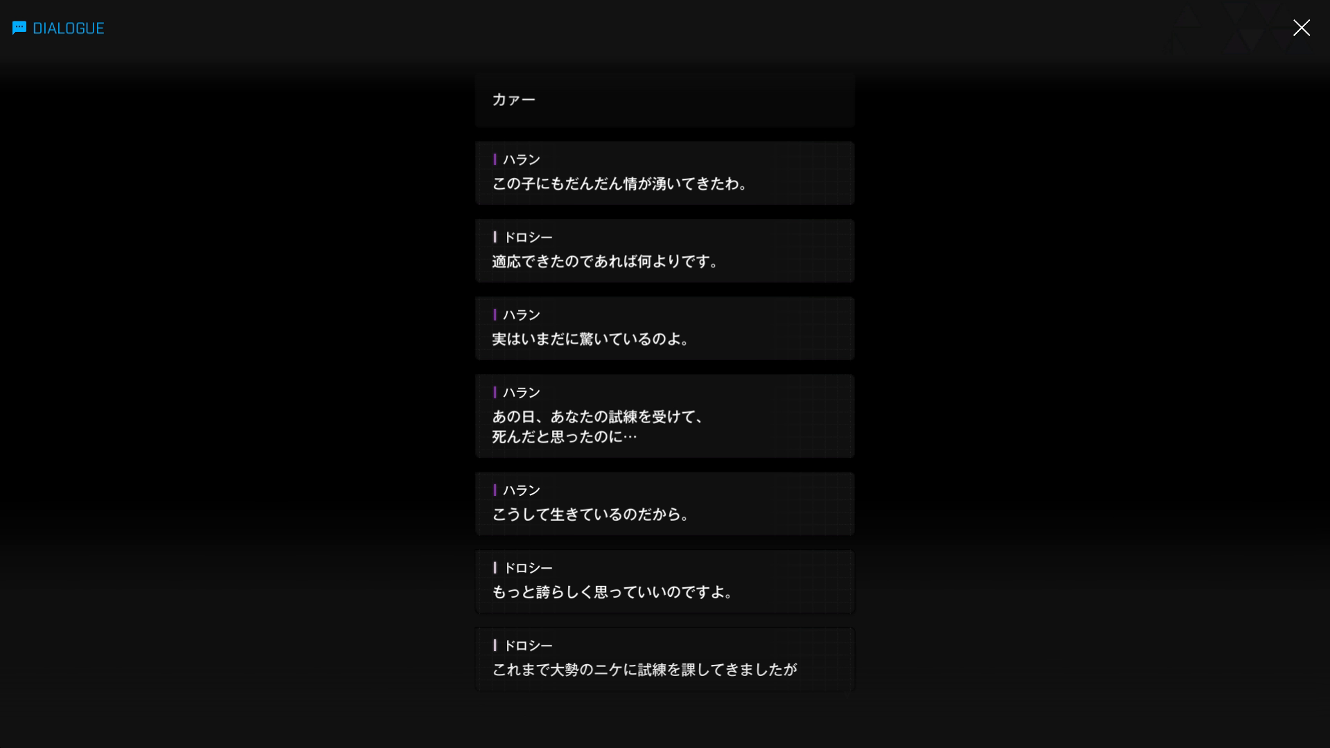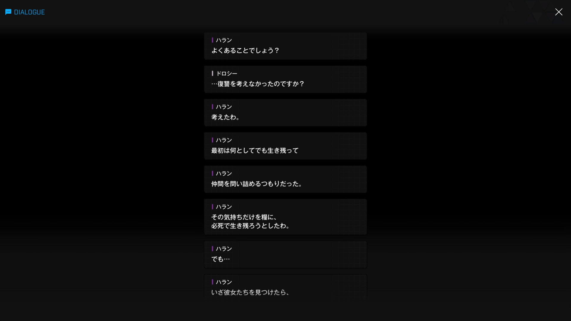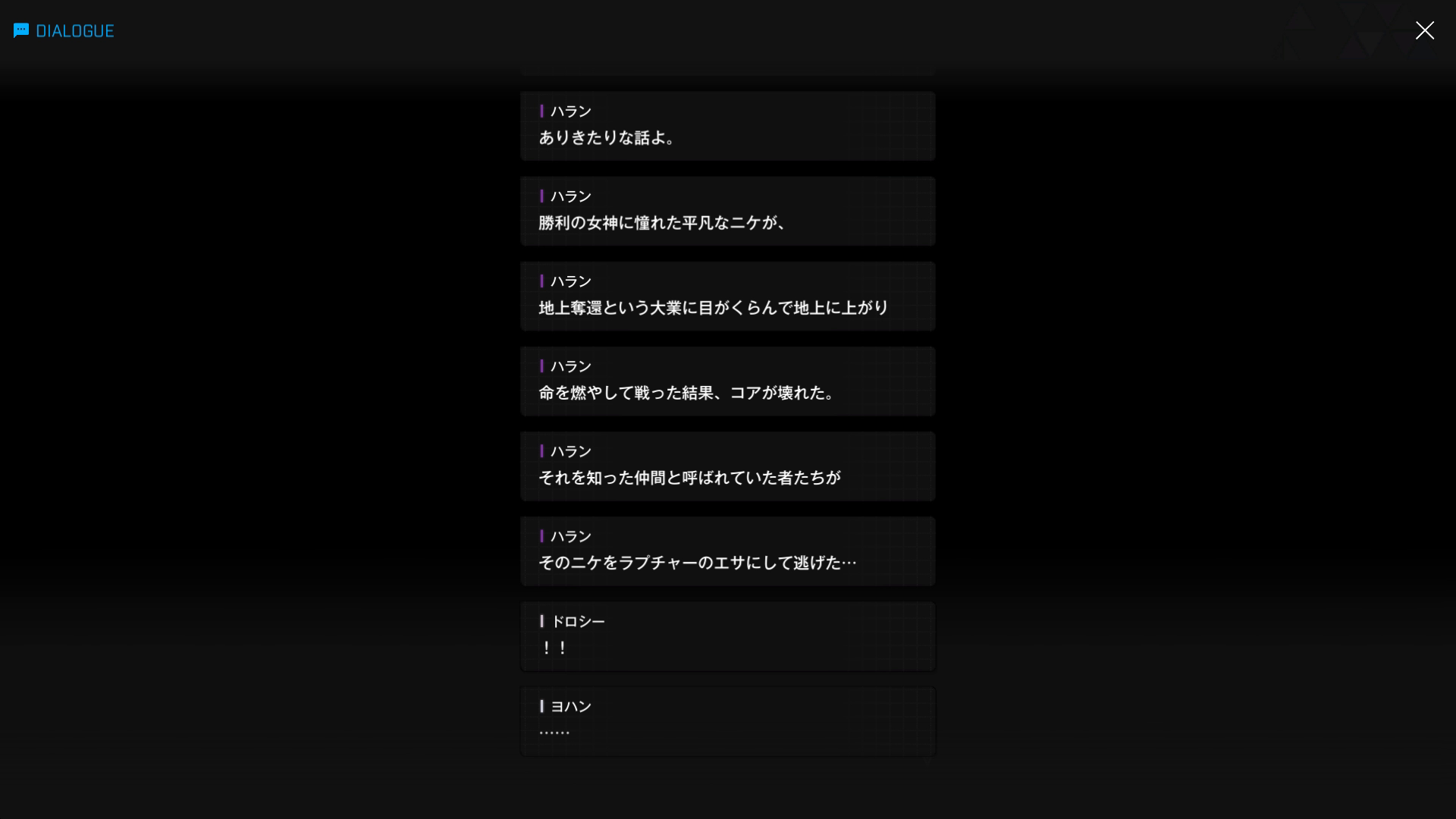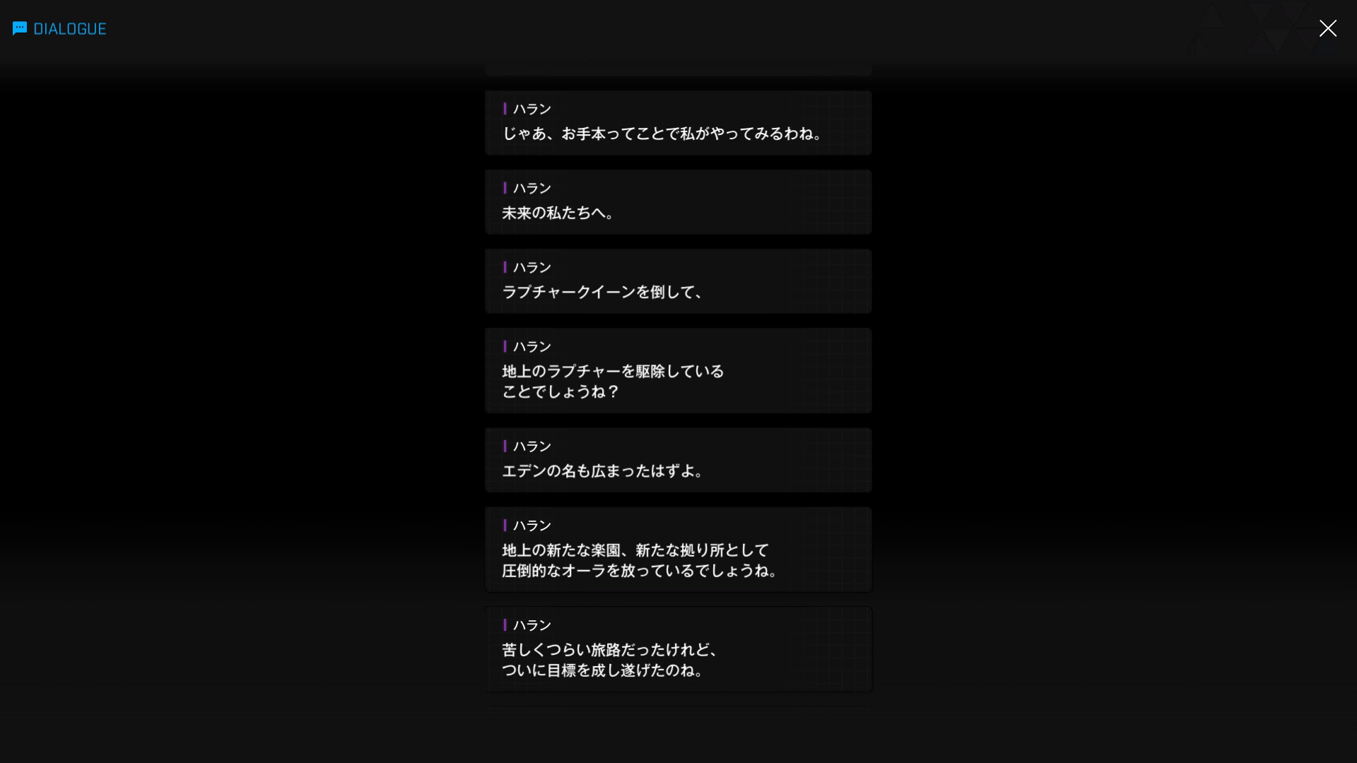・彼が自分のために集めた素材で作った最高級エッセンスでお色直ししたあと、エレベーター前にたむろするラプチャー達を華麗に殲滅して道を切り開く → 別れ際の選択肢によって彼への対応が若干異なるため、気になる諸兄はぜひゲーム内で直接確認されたし(ハランエピソード5より)