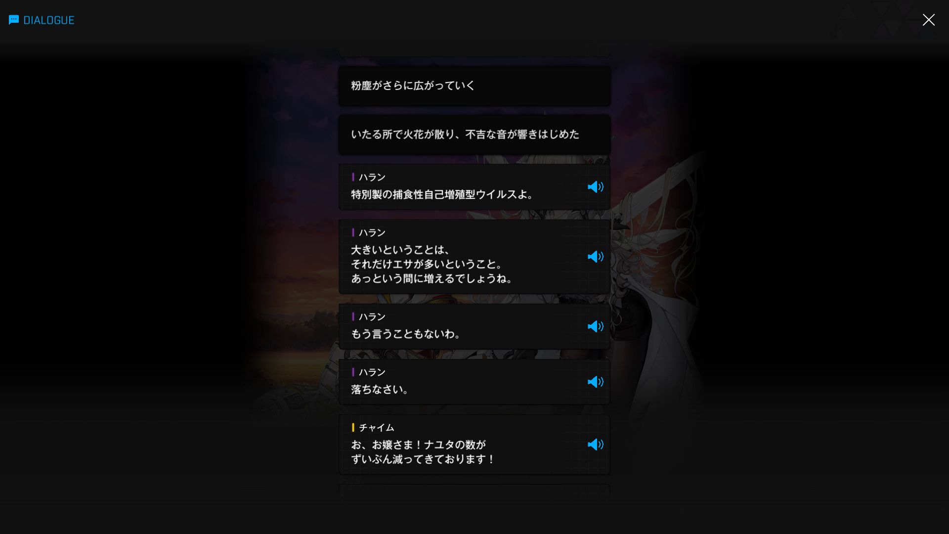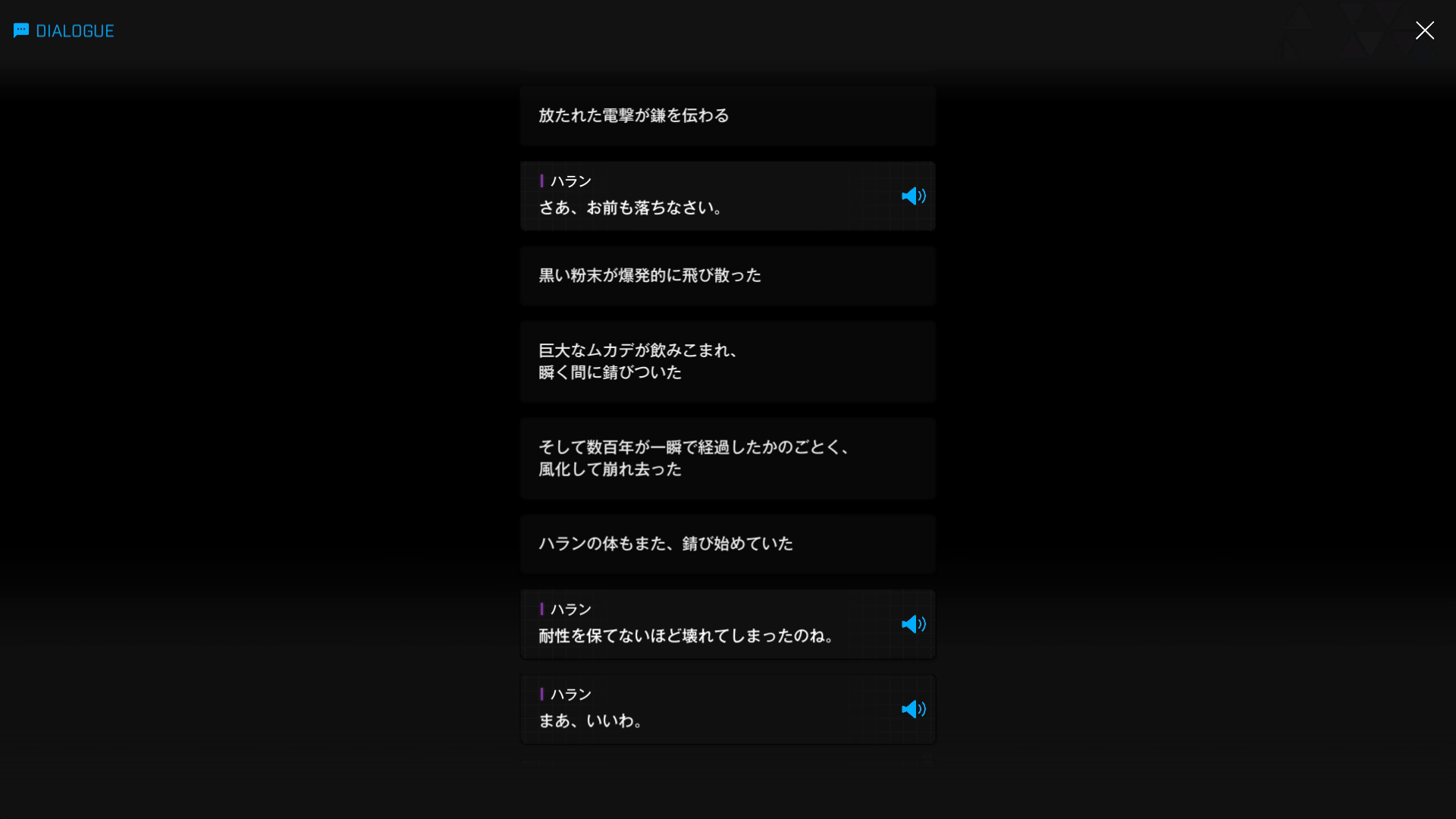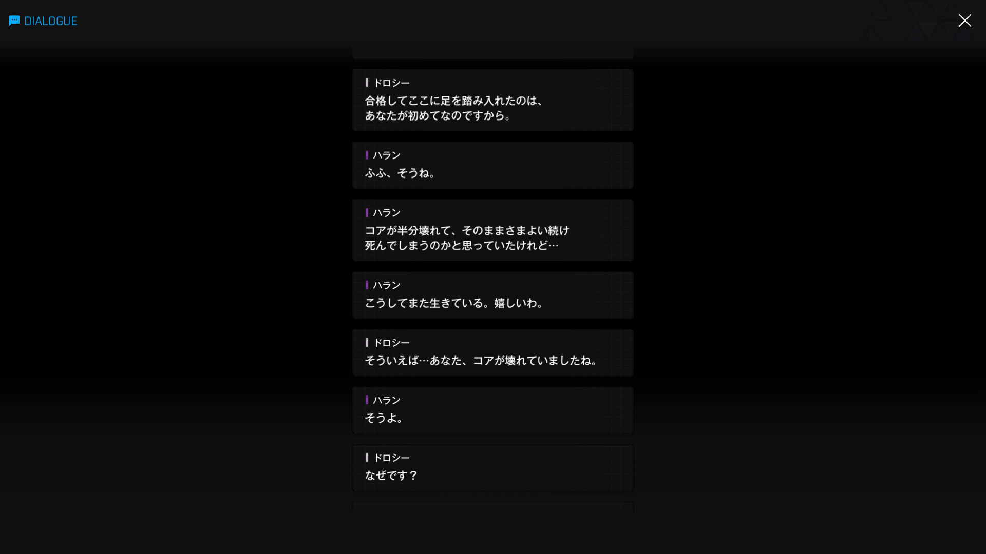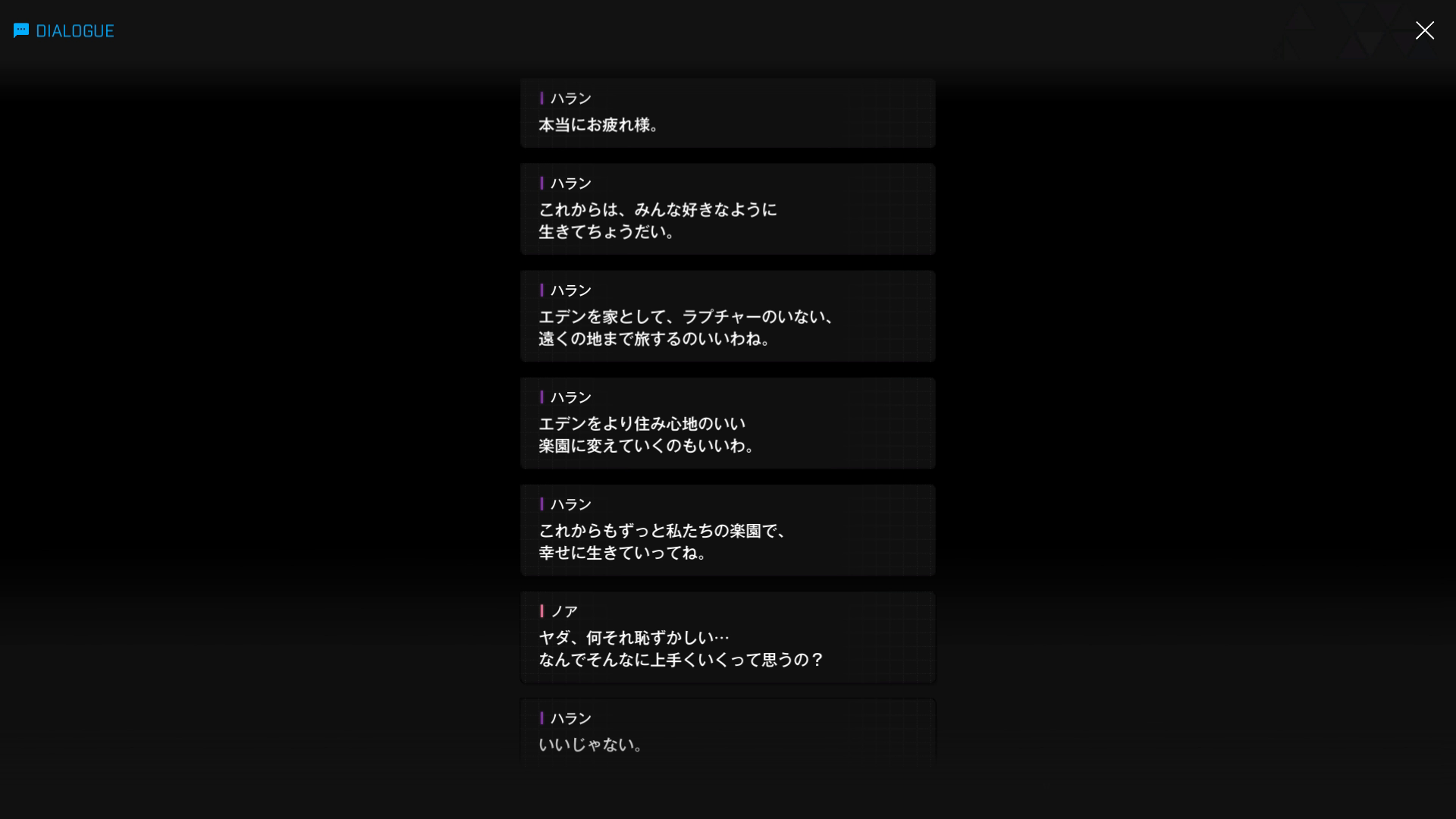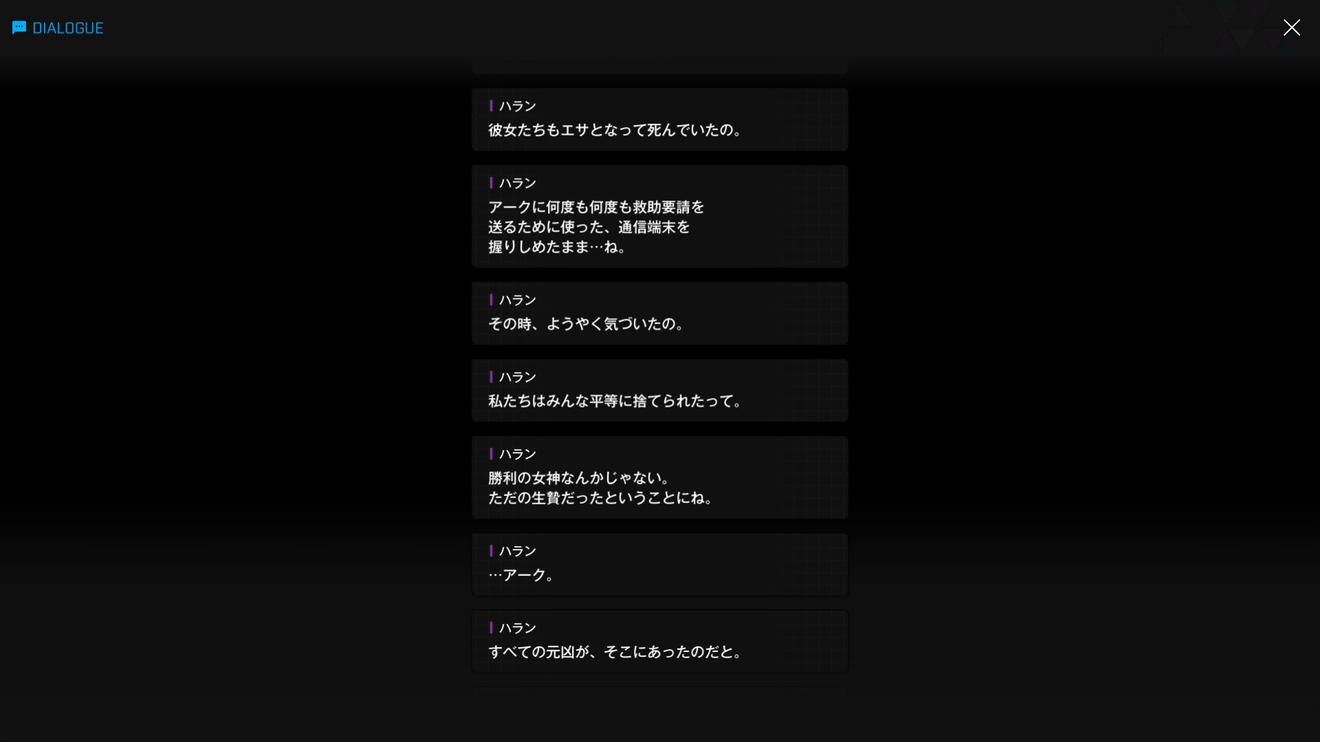 ・彼が自分のために集めた素材で作った最高級エッセンスでお色直ししたあと、エレベーター前にたむろするラプチャー達を華麗に殲滅して道を切り開く → 別れ際の選択肢によって彼への対応が若干異なるため、気になる諸兄はぜひゲーム内で直接確認されたし(ハランエピソード5より)