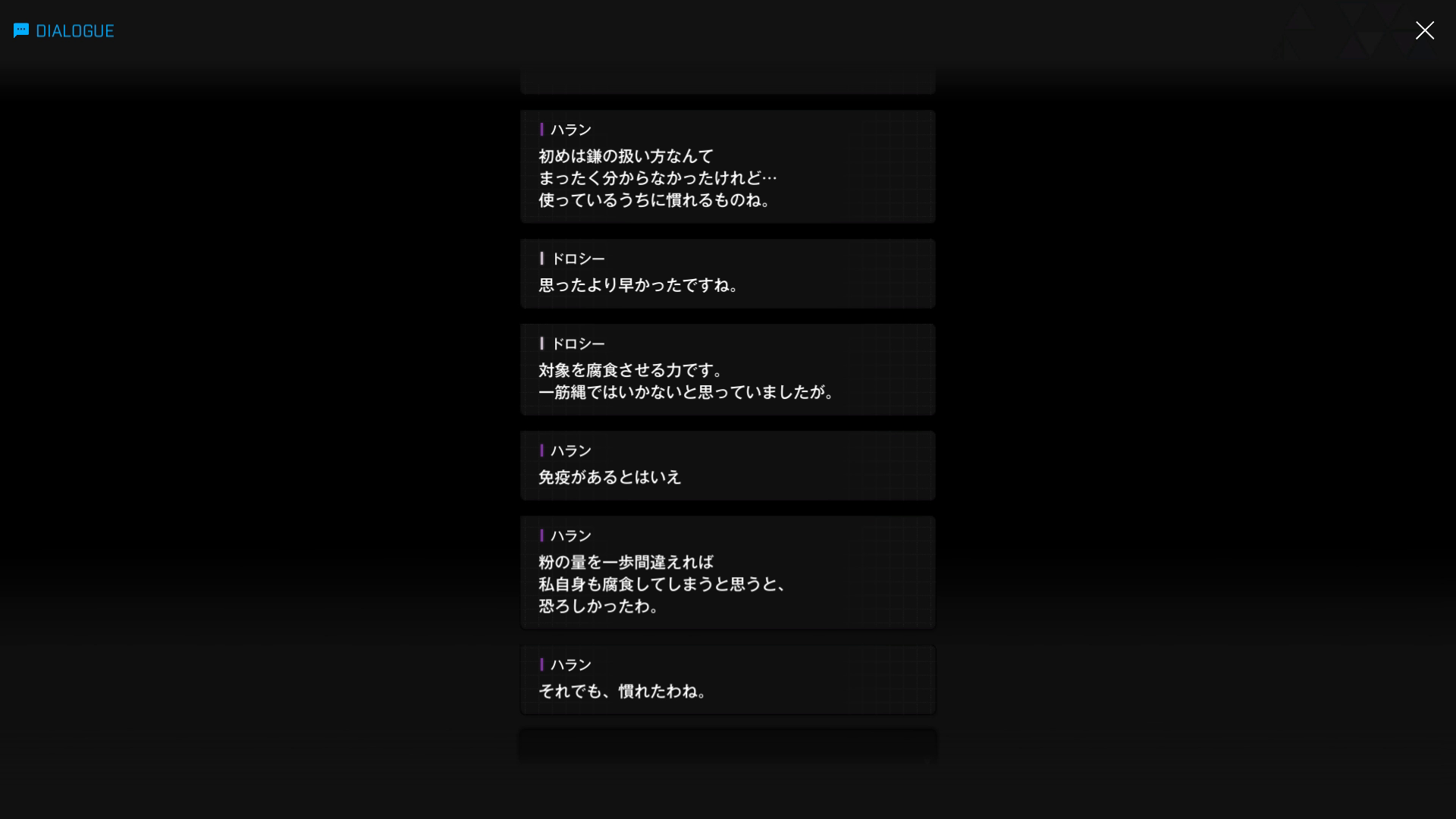 特に戦闘などしていないにもかかわらず、すでにこの時『満身創痍』だったが、管理人は『彼女の特製ウイルスが原因』と推測している → 理由は2枚目の7段落目で語っているとおり、おそらく『あまりにも強力過ぎるため、彼女が持っていた耐性すら凌駕してしまい、その結果自身も少しずつ侵食されてしまった』ためではないかと