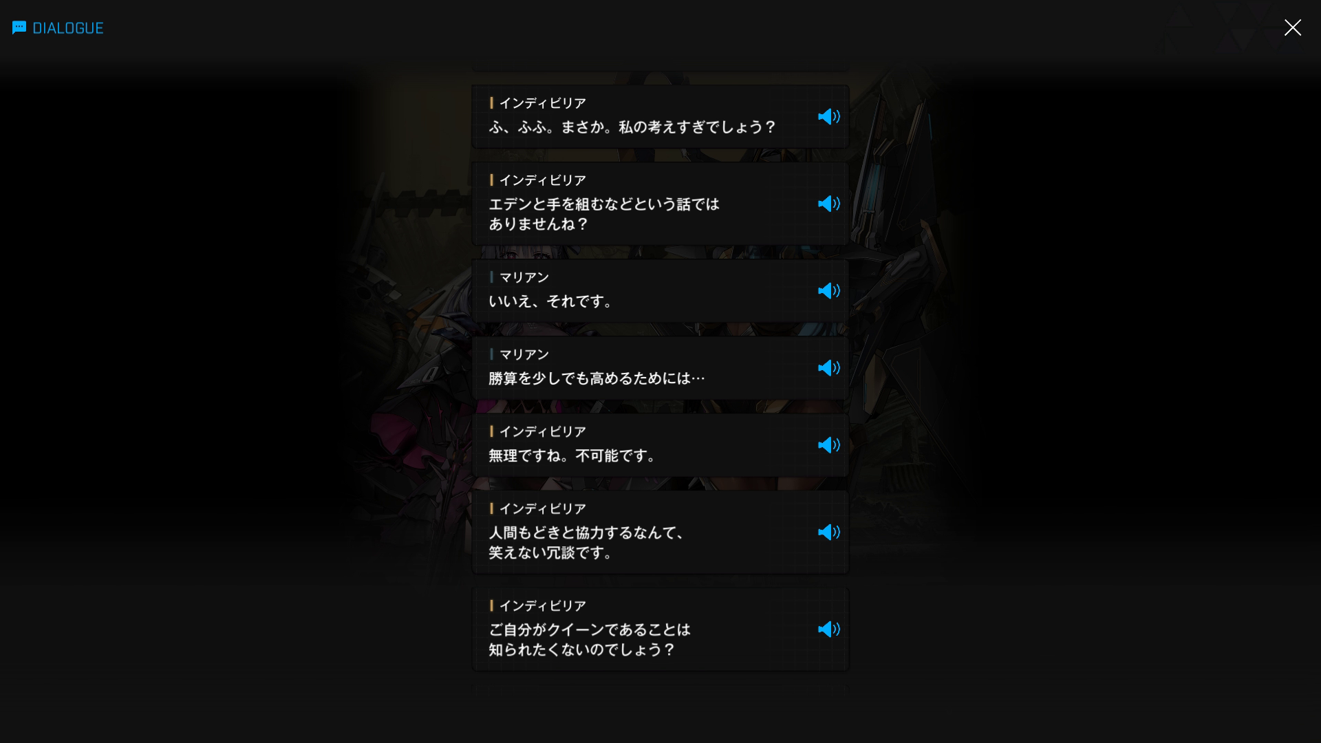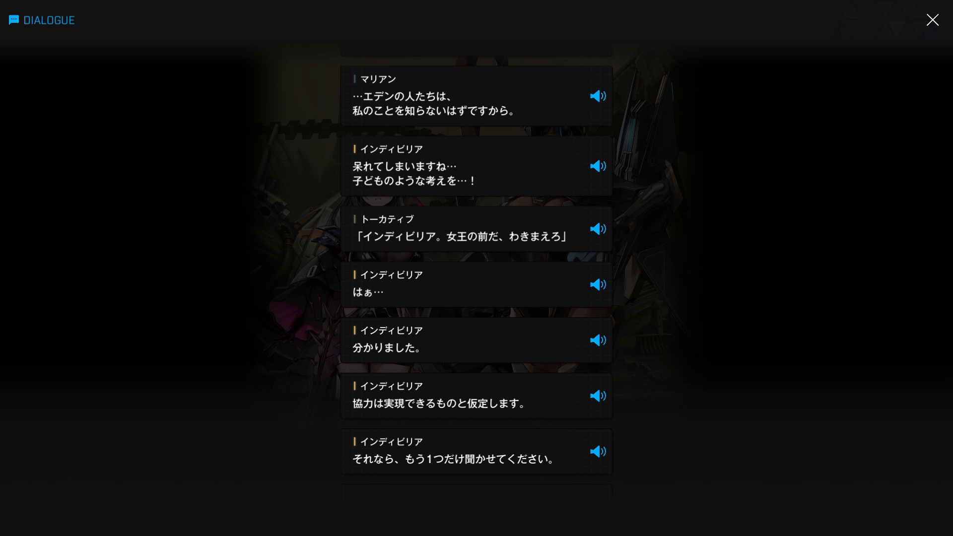 ・エデン近くに到着後、インディビリアからクイーン攻略の具体的な説明を求められる(『支配力:B』より)