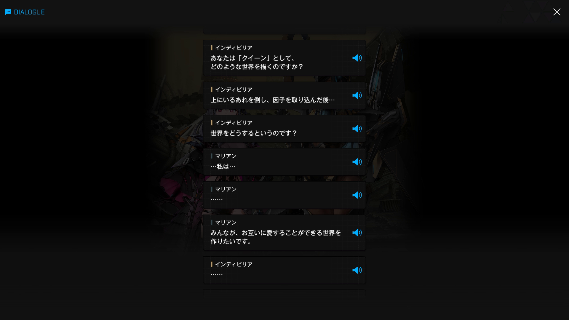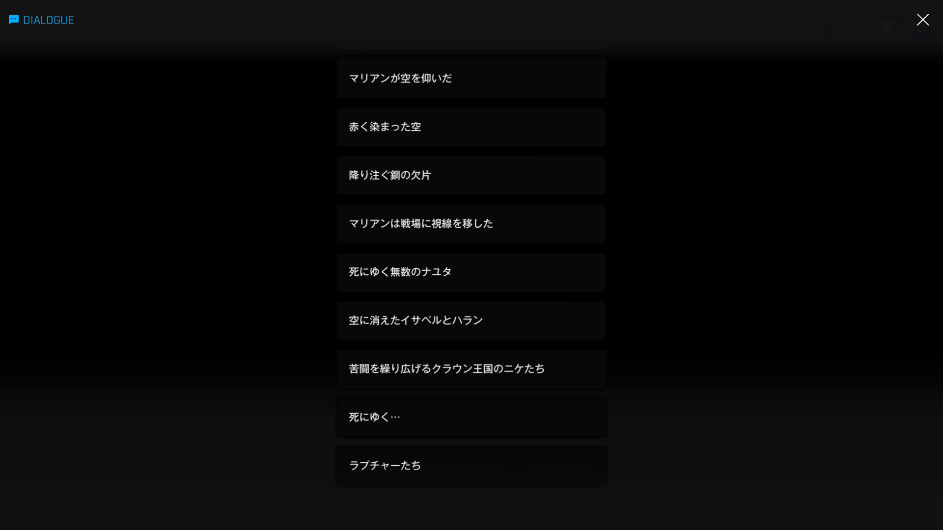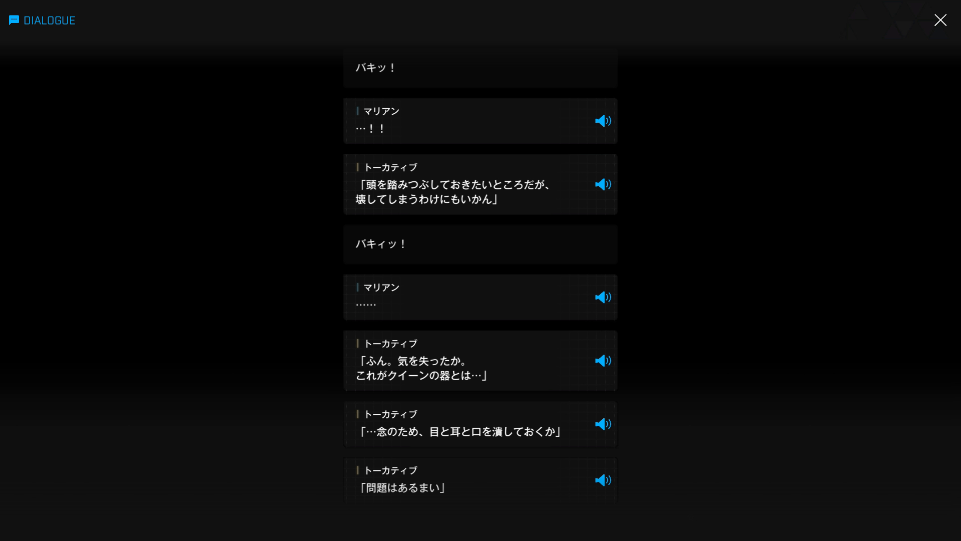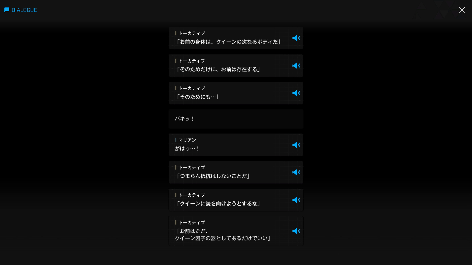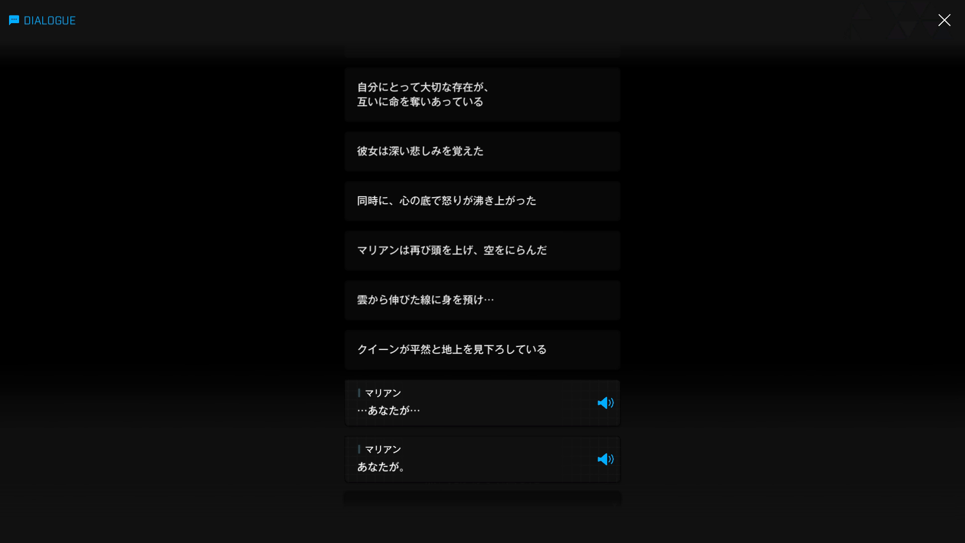 ・一段落ついたところで目標をクイーンに変更するも、今まで相手からの攻撃がなかったことに気付く → 話の内容をまとめると『半数を優に超えるラプチャーを破壊後している間、クイーンは巨体を一刀両断可能なほどのビームを極限まで圧縮しつつ、どこに本体のマリアンがいるかを注視していた』のだろう(『命の価値:B』より)