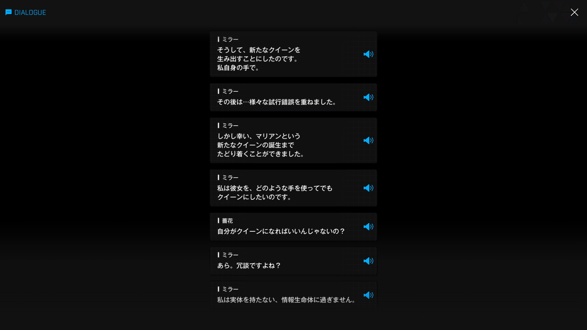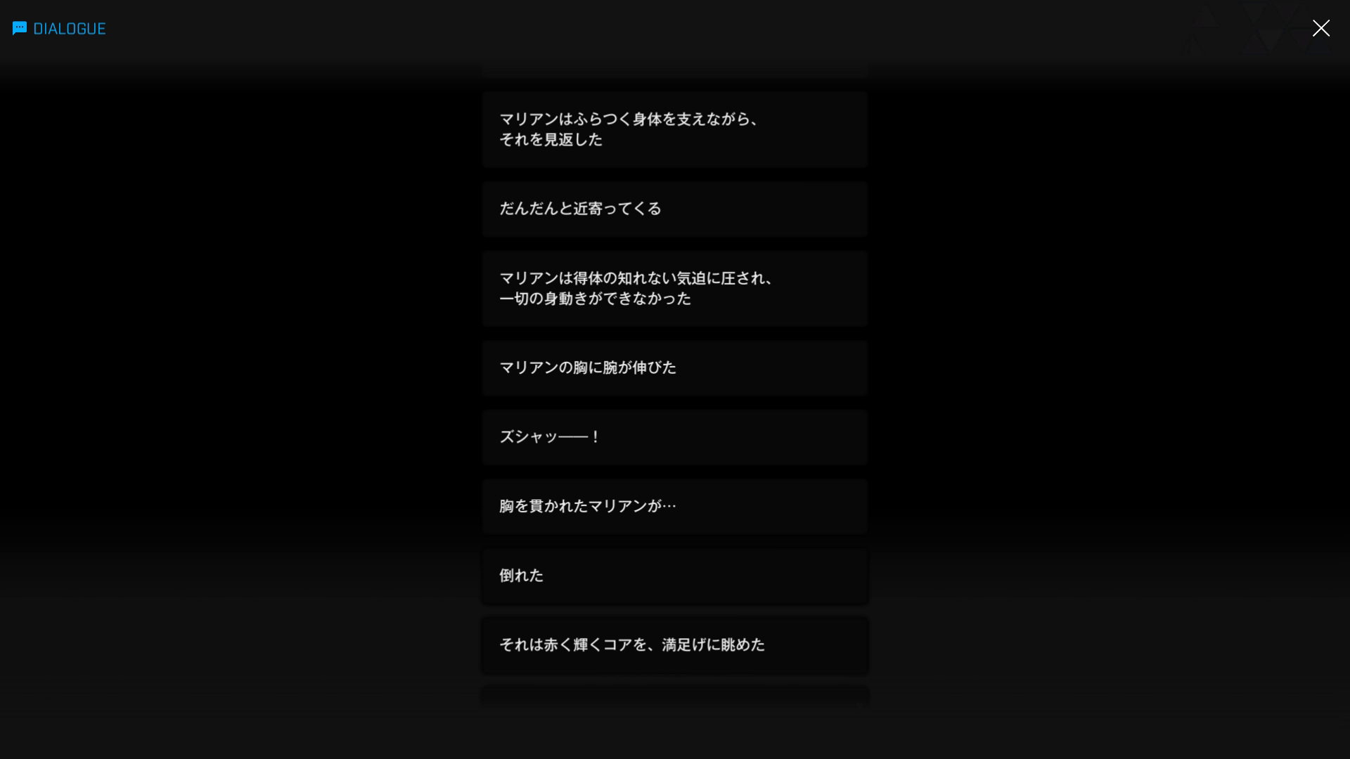 ・以下SSの内容を見る限り、こちらで永久離脱したはずのマリアンが復活した理由は、どうやらミラーの仕業だった模様 → つまり、主人公が射殺を躊躇っていた際の一部始終を「あら、これは非常に珍しい⋯⋯いえ、かなり貴重な光景ですね。私の計画にうってつけの素材として使えるかもしれませんし、とりあえず確保しておきましょう」などと言いながらどこかで観察 & 彼らが立ち去ったあと、何らかの処置を施したのだろう(『戴冠:B』より)