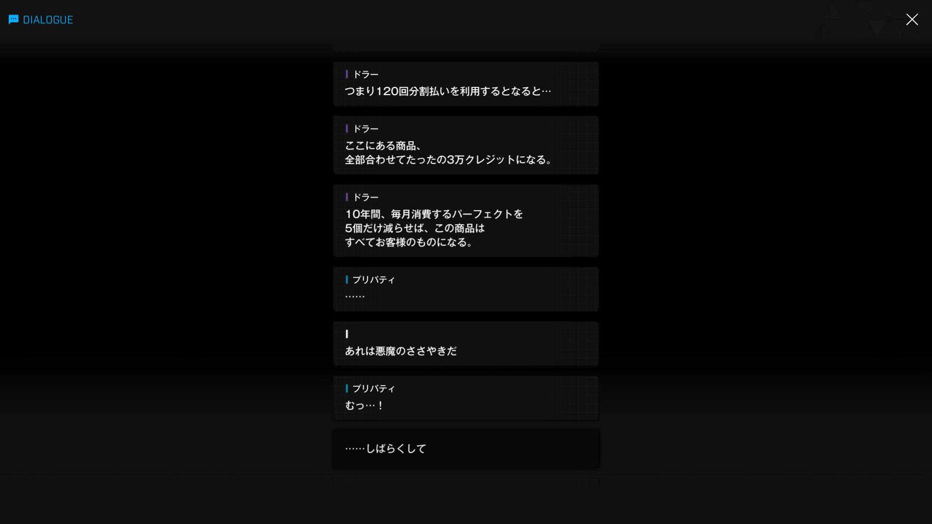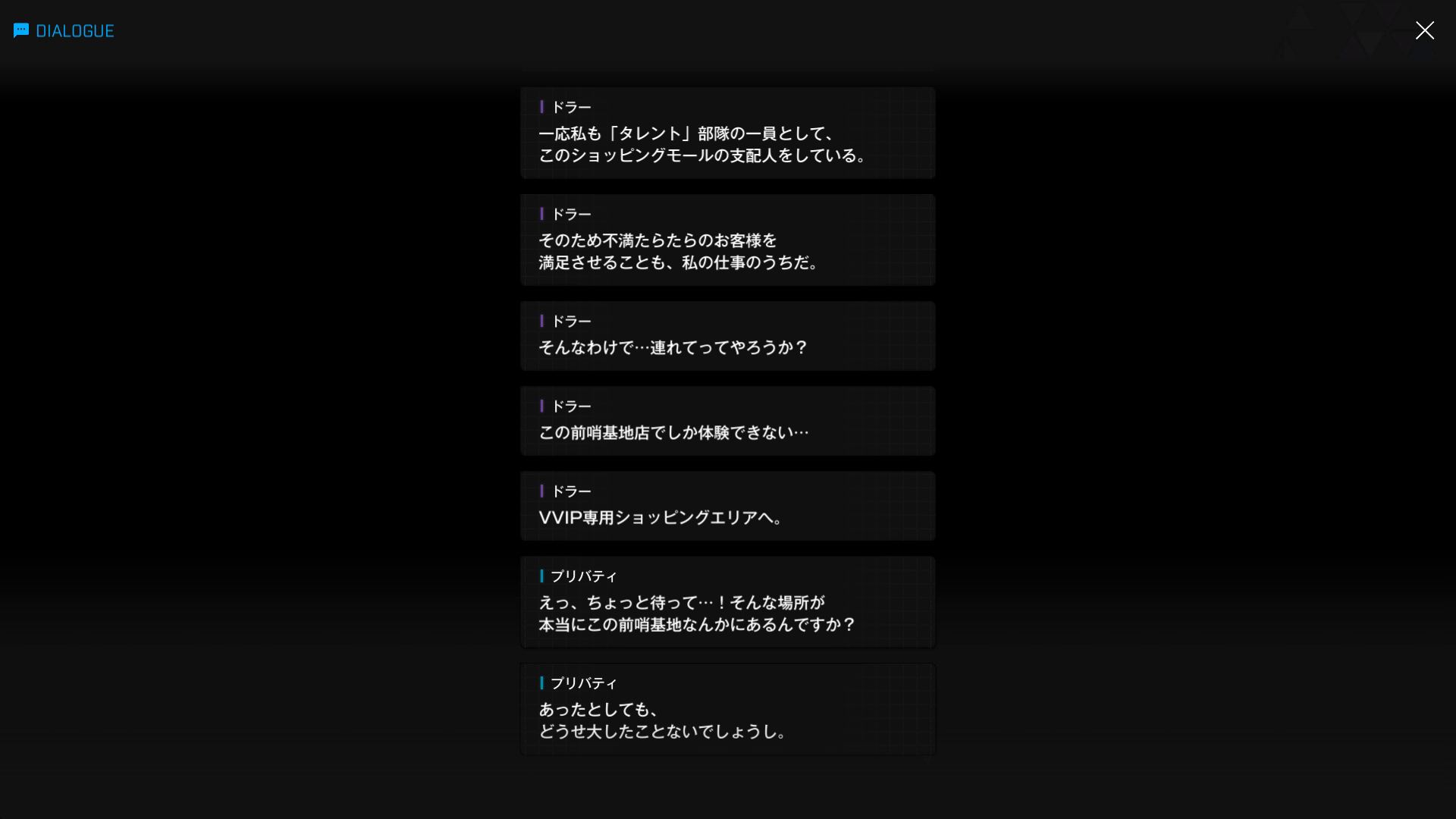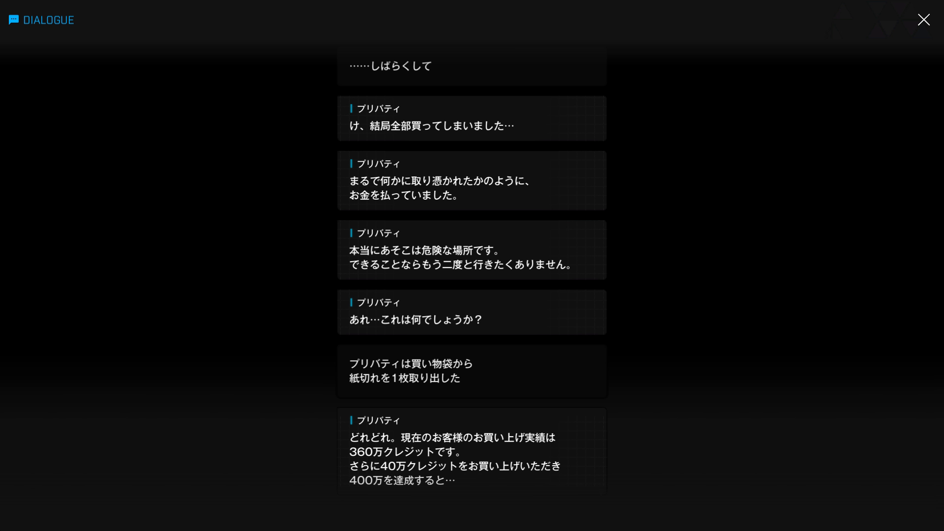 ・ニケしかいない前哨基地店を見て、最初から「大したことない」と見下すプリバティに対し、以下SSのような流れで話が進む(突発イベント『ショッピングモール』の『お得なショッピング』より)