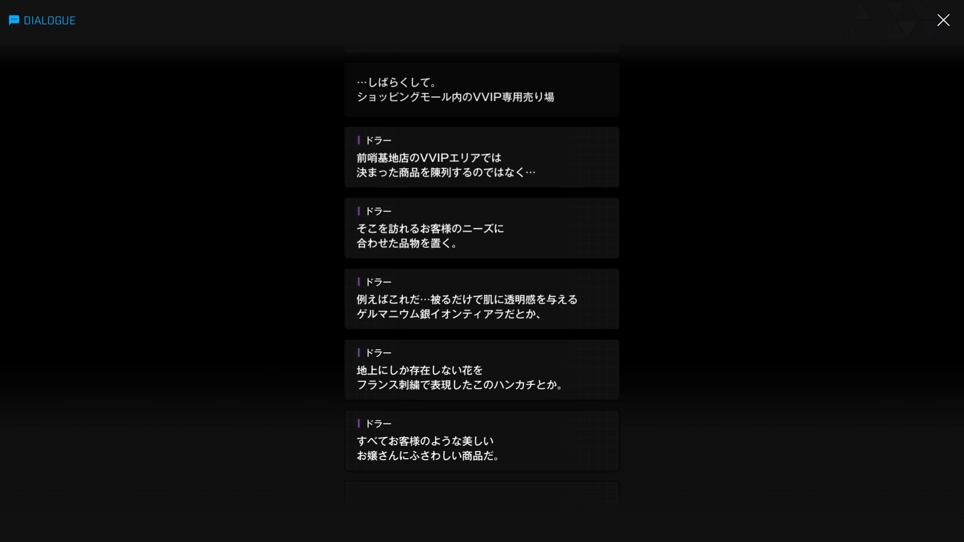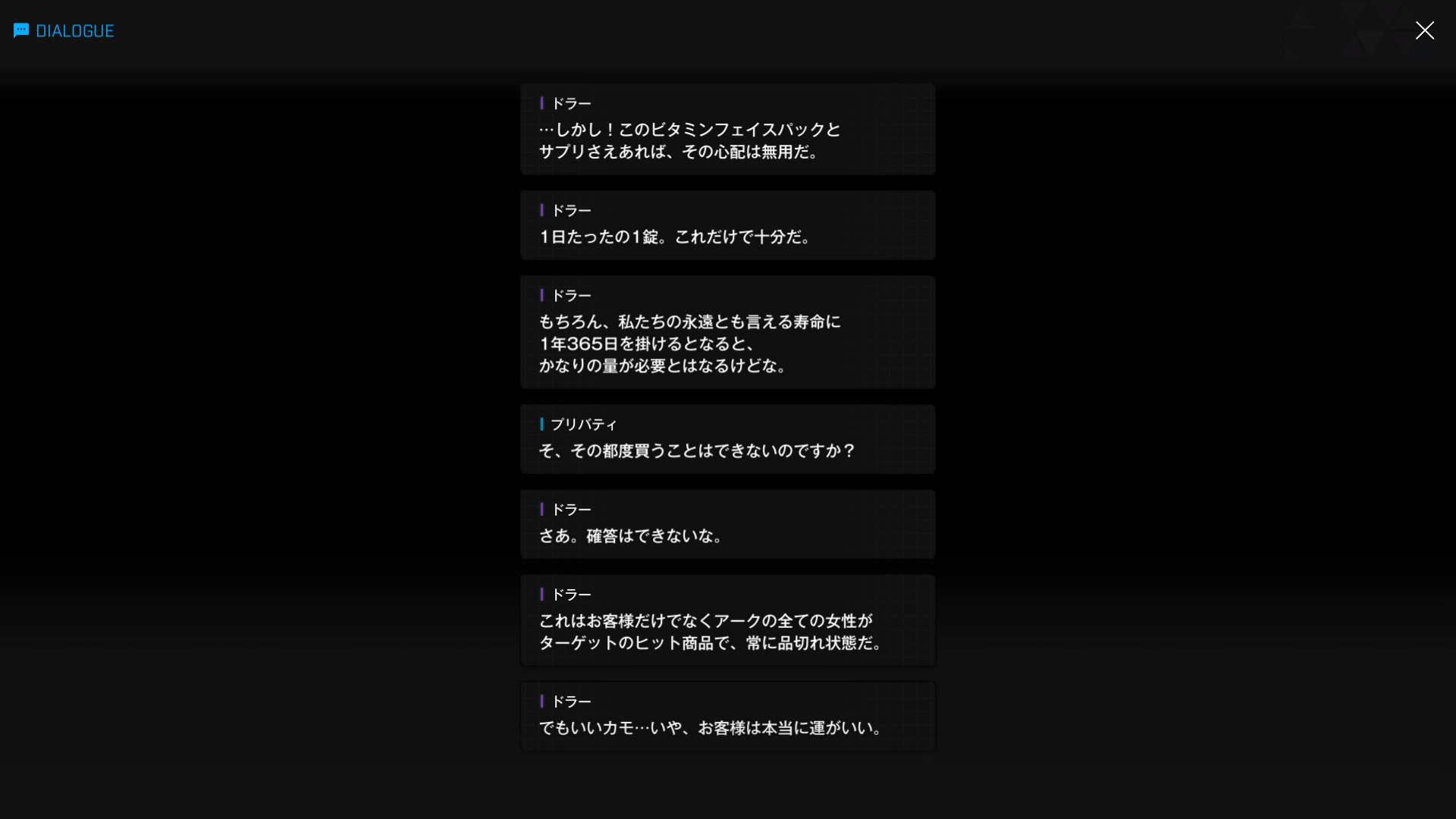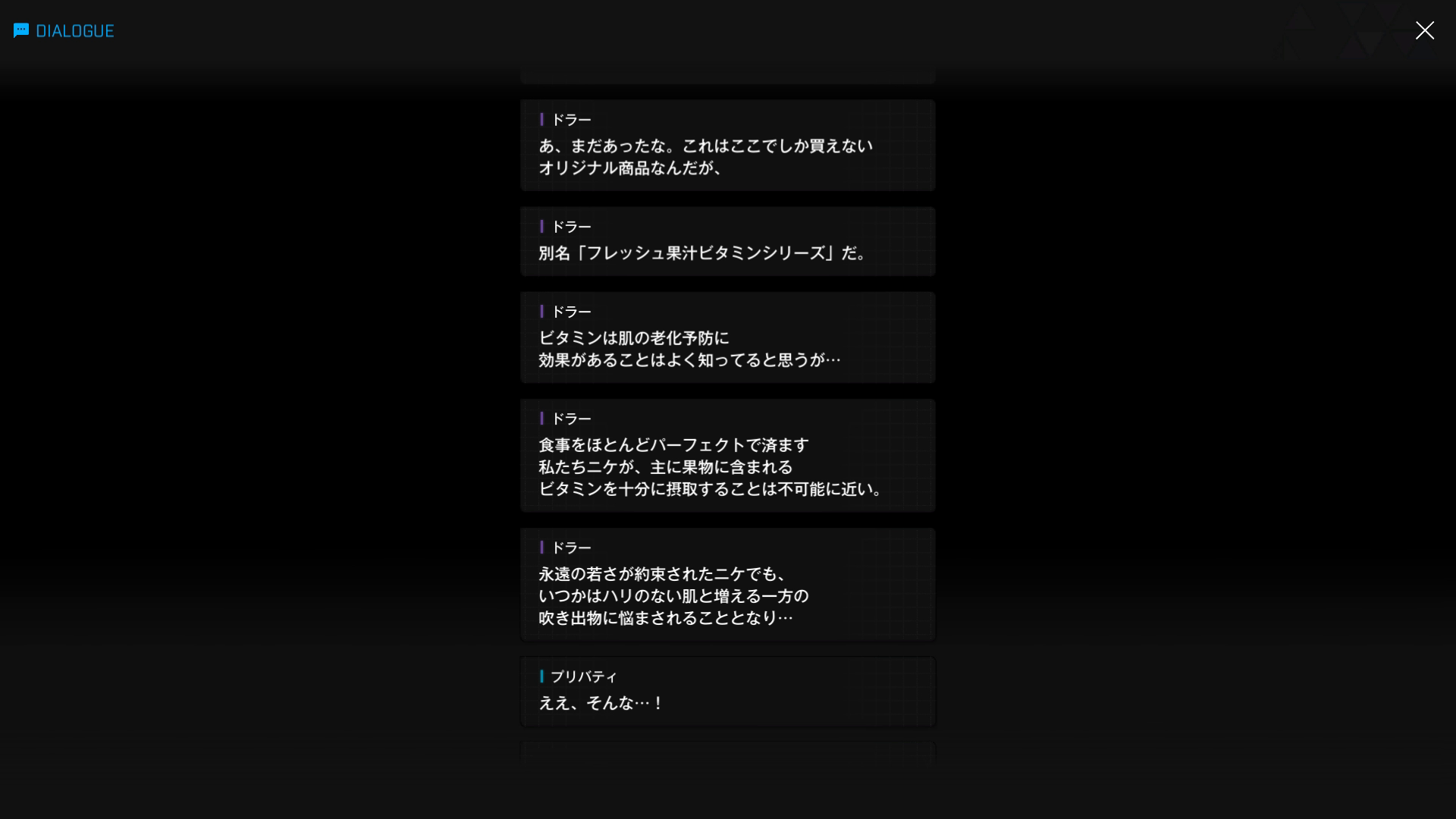 ・ニケしかいない前哨基地店を見て、最初から「大したことない」と見下すプリバティに対し、以下SSのような流れで話が進む(突発イベント『ショッピングモール』の『お得なショッピング』より)