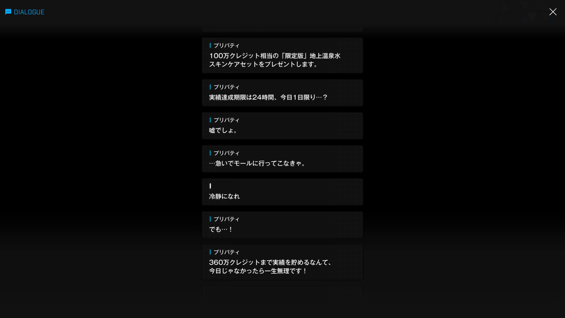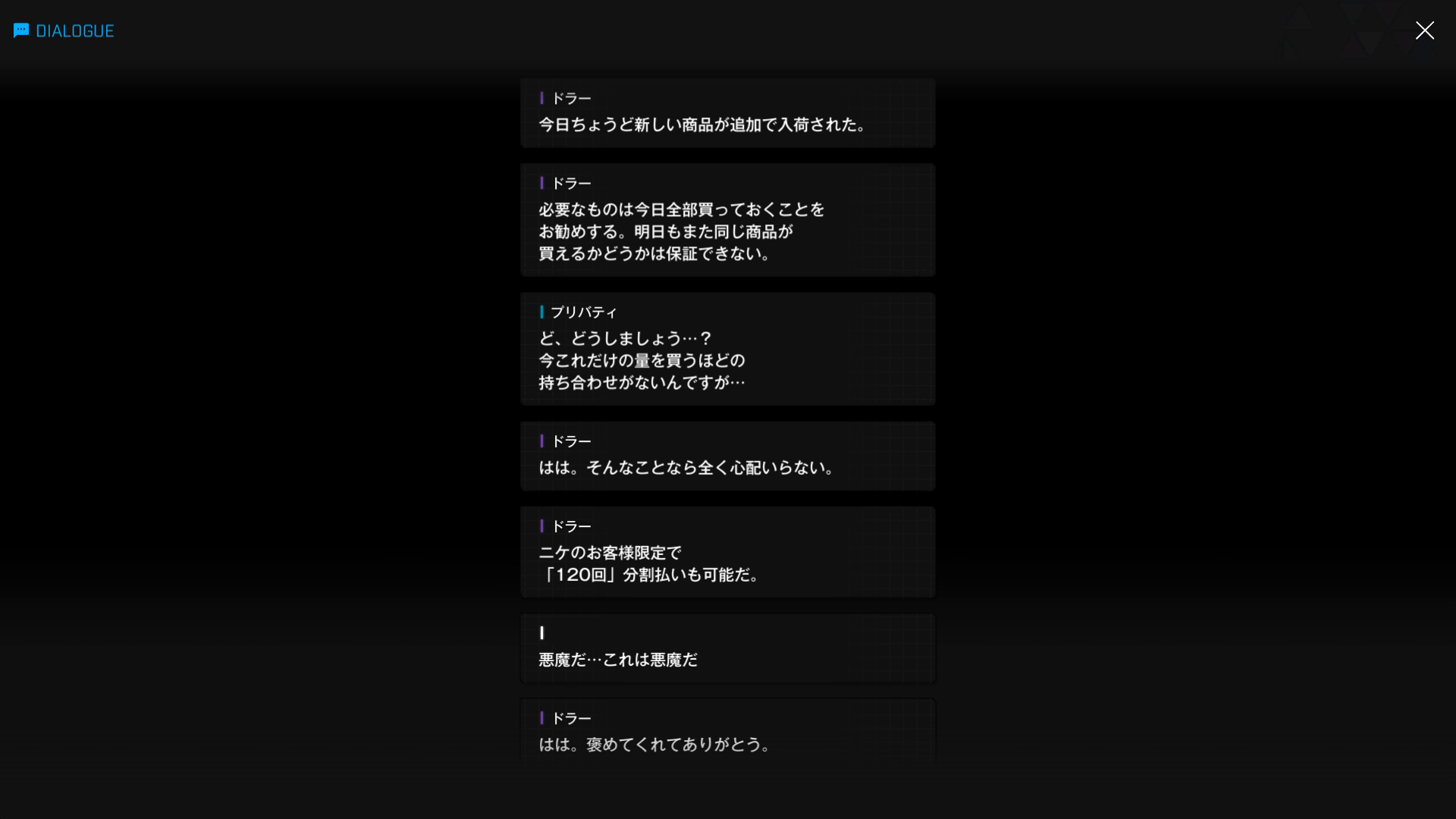 ・その後、見事に360万クレジットのカモが爆誕⋯⋯で終わるわけがない → ドラーの『我々のモールをコケにした報いがこの程度で終わると思うなよ?』という意気込みがヒシヒシと感じられるメッセージにより、さらに40万のネギを自ら背負いこむプリバティであった(諸兄も『表情が一変 or 上半身をよけいな衣服で覆ったニケ』などを購入する際は、『エロさ』&『期間限定』という名の謳い文句に釣られ、余計な散財をしないように)