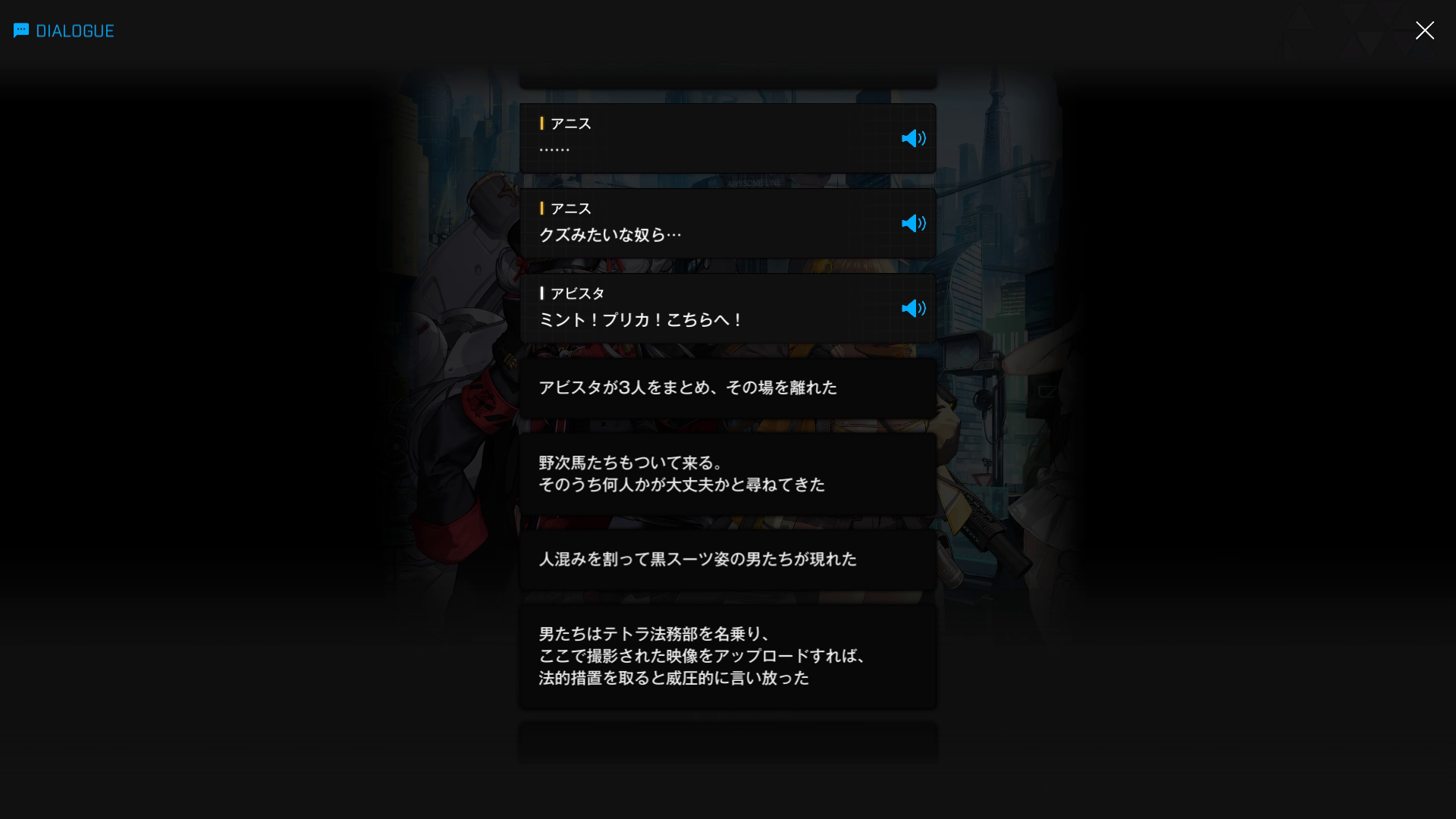 ・ロジーが『E2クリスタル入りのガラスケース』を投げる少し前、アニス達はプリカ達4名と一緒にかき氷でカロリー摂取中 → アニスに胸ぐらを掴まれビビって逃げたアホ男が4名ほどの仲間を呼ぶ(いつも不思議に思うのだが、弱い者いじめを含め、なぜこういうバカ共は徒党を組まないと何もできないのだろうか⋯⋯?)