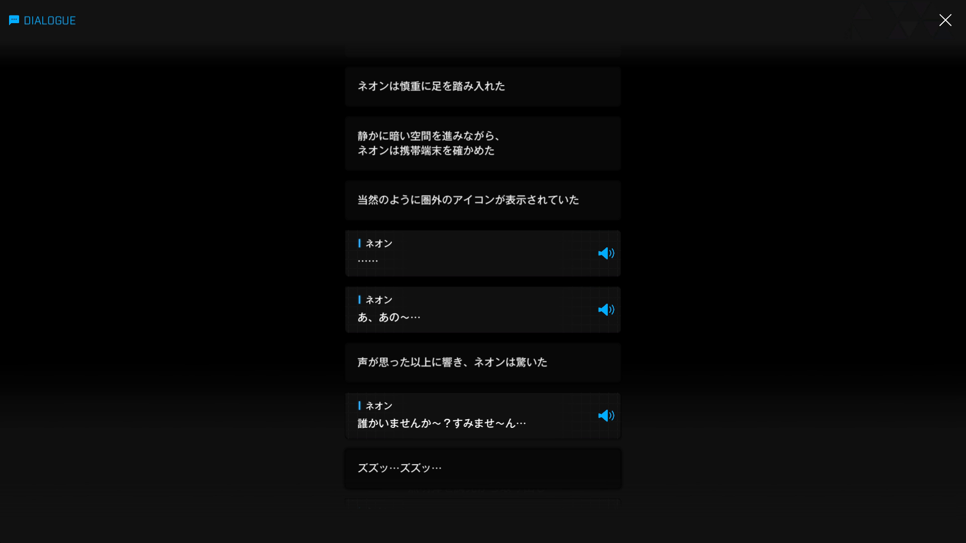 ・ネオンがE.H.から受け取った照明弾を発射 & 空間が明るくなったと同時に、彼女に群がっていたD.E.E.P.も、いわゆる『壁の下側に開いたネズミの穴のような場所』へ姿を消す → 突然ジエンが登場 & イベント『WISDOM SPRING』で語られていたとおり、この時点でここがM.M.R.深層に繋がっていると判明