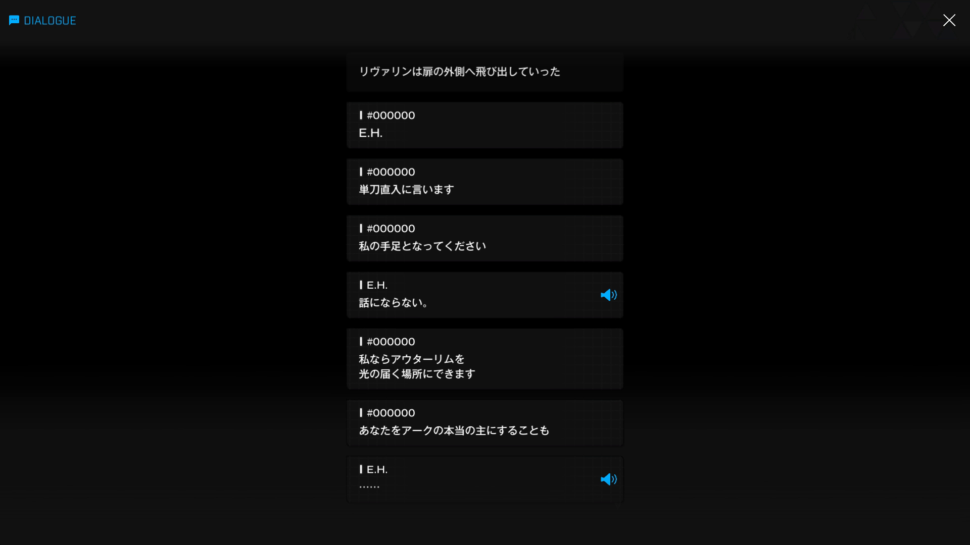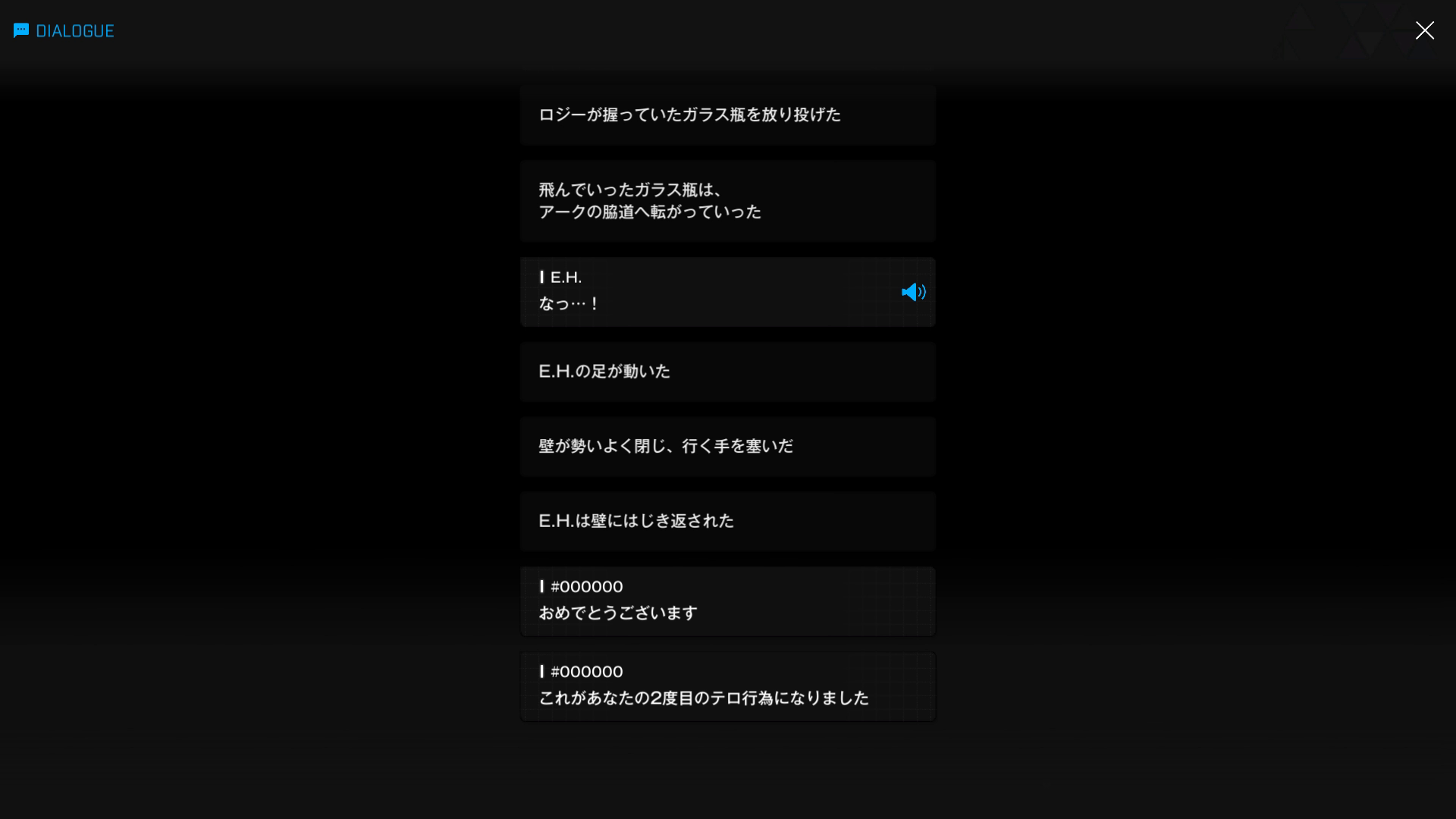 ・E.H.がリヴァリンの逃げた正解ルートを、蛍光棒を落としながら追跡 & 単独でトンネルの中に侵入する → しばらくして、半開きの小さな扉から漏れる光を発見 & 聞き耳を立てて内部の様子を窺う(もはや記憶消去はおろか、廃棄処分になってもおかしくない悪行を積み重ねているにもかかわらず、このアホ女はいまだに「デモデモダッテ」を繰り返す有様)