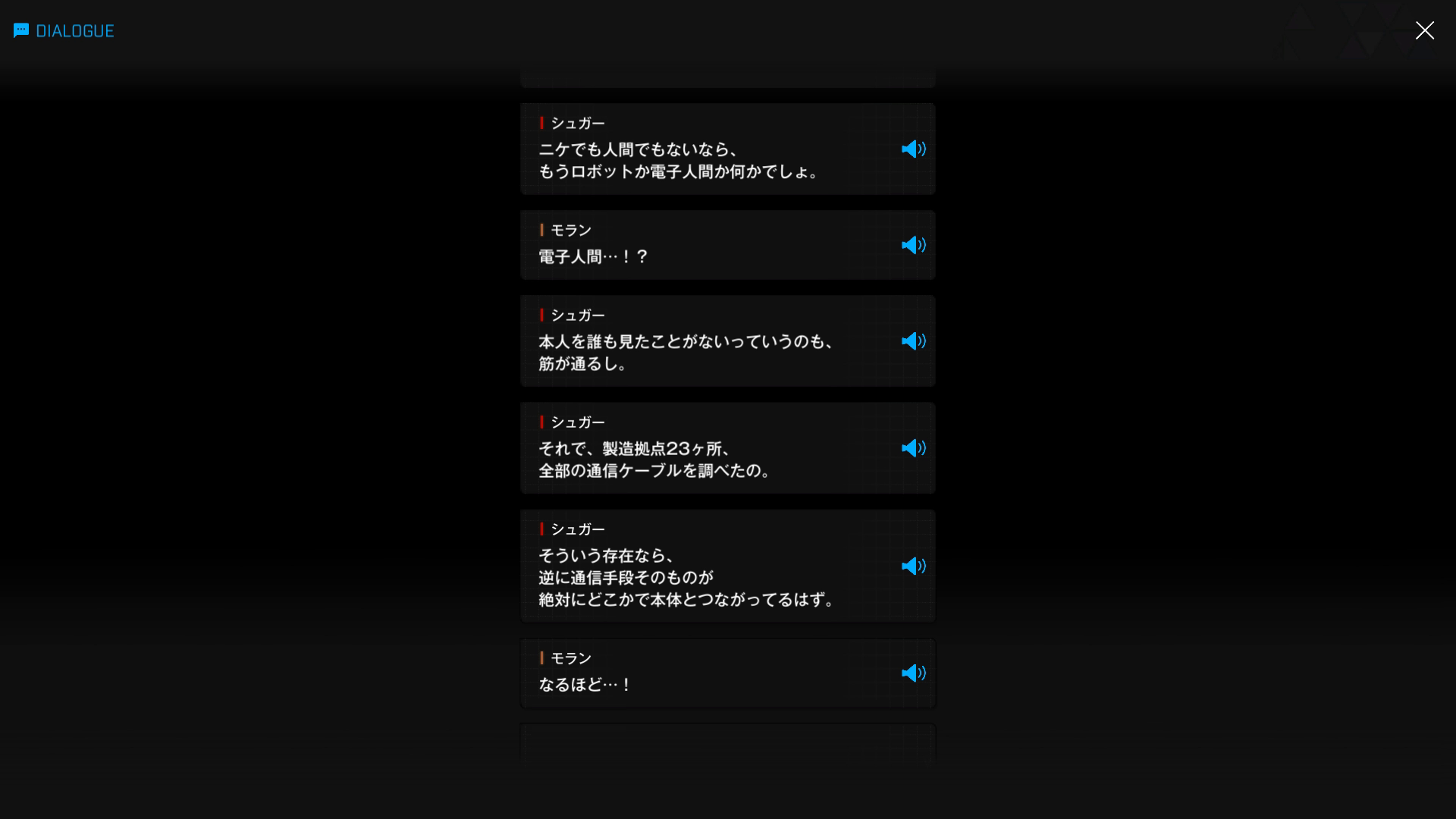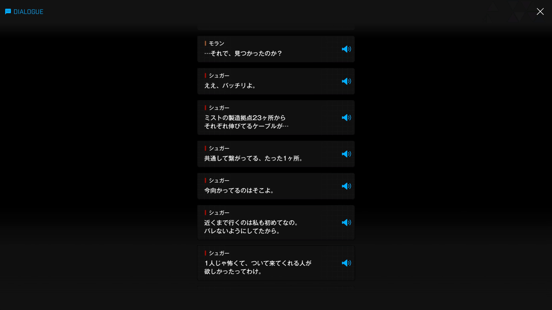 ・某所に隠れていたリヴァリンを主人公達が半ば強制連行している間、アウターリムではモランもシックスオー撲滅のために行動を開始 → その途中、イベント『DIRTY BACKYARD』で一悶着あったシュガーに再度行く手を阻まれるが、実は彼女も独自に手掛かりを探しており、仁義おバカと戦闘しているように見せかけつつ、そのままメインフレームの場所へ疾走する