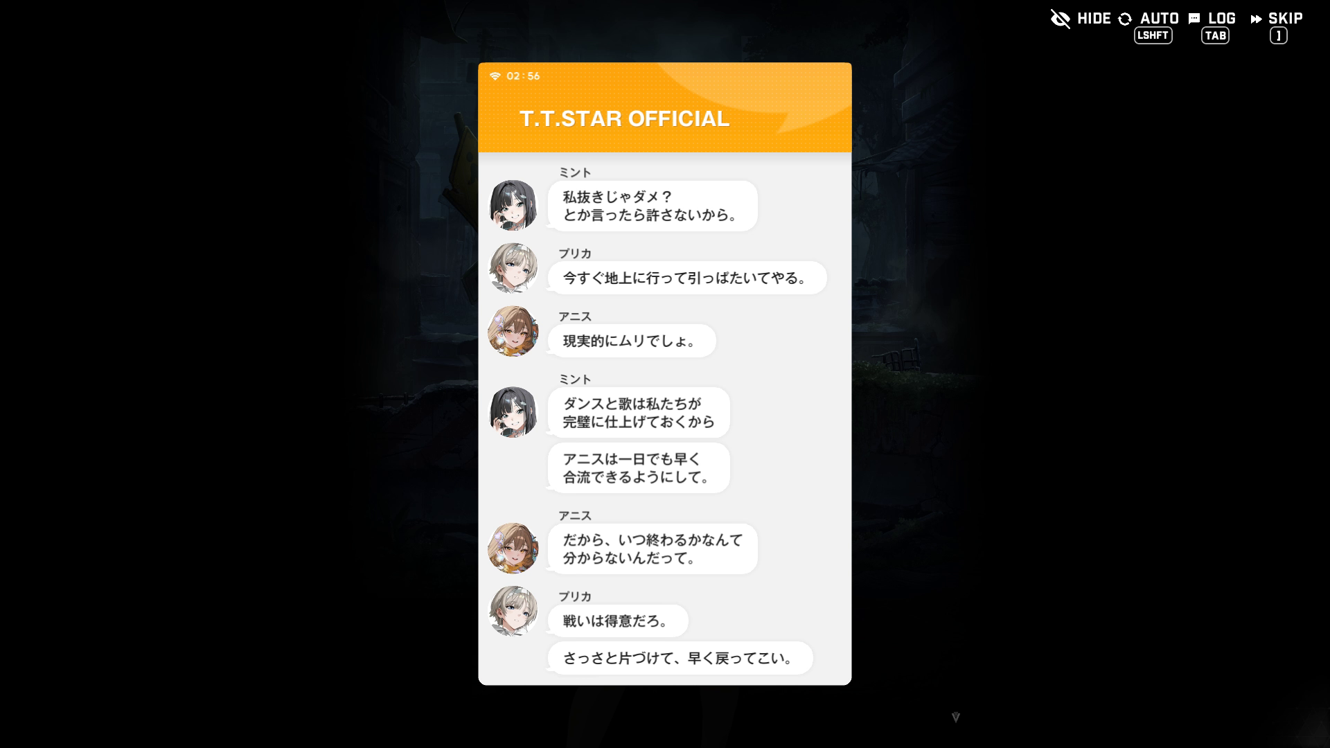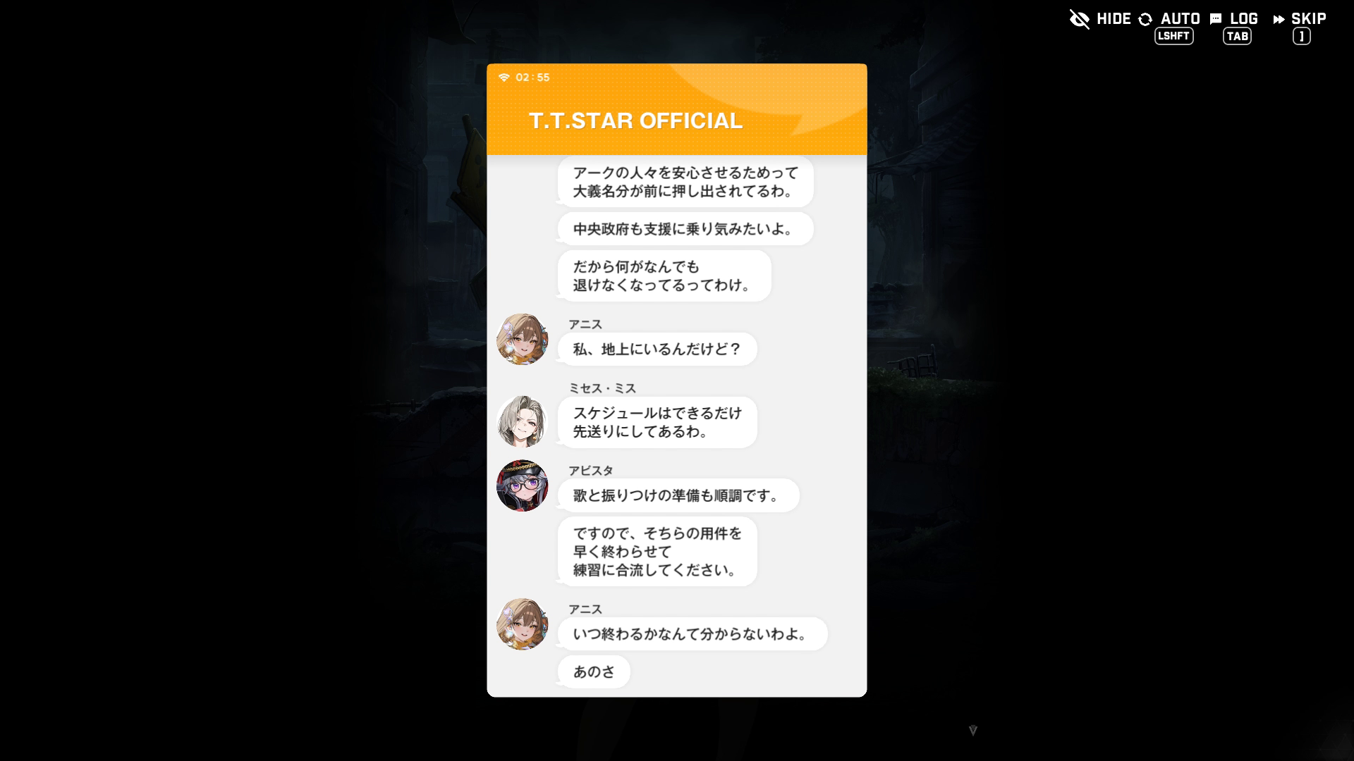 ・アニスSSRが野営の見張りをしながら、blablaでT.T.STARのメンバー達と以下SSのようなやりとりをする