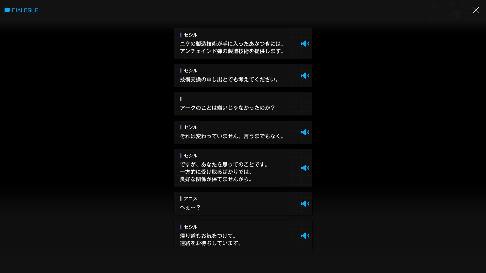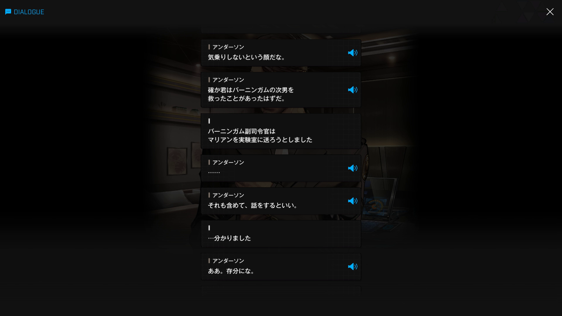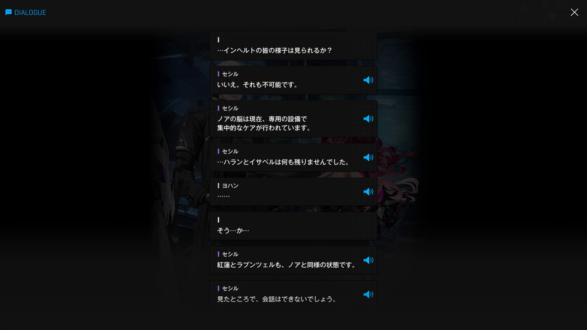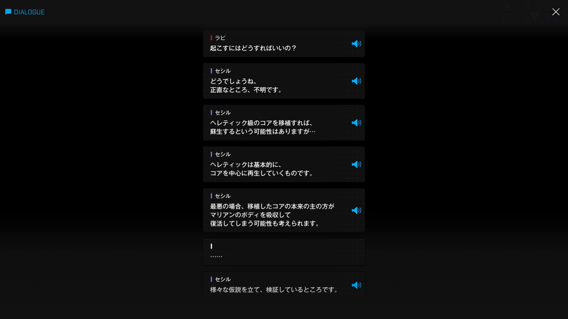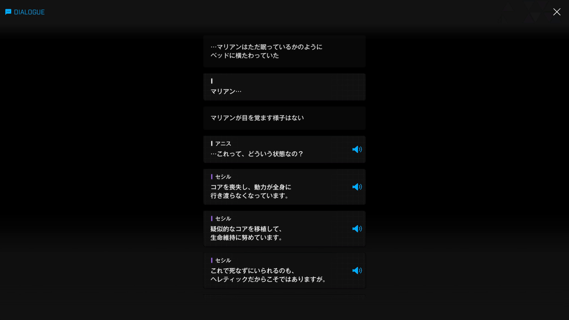 ・主人公が退室前にマリアンの頭をなで、ブレインシェルターに保管されたままの3名も助けると心に誓う → 帰路に就く前、セシルと以下SSのような会話を交わす