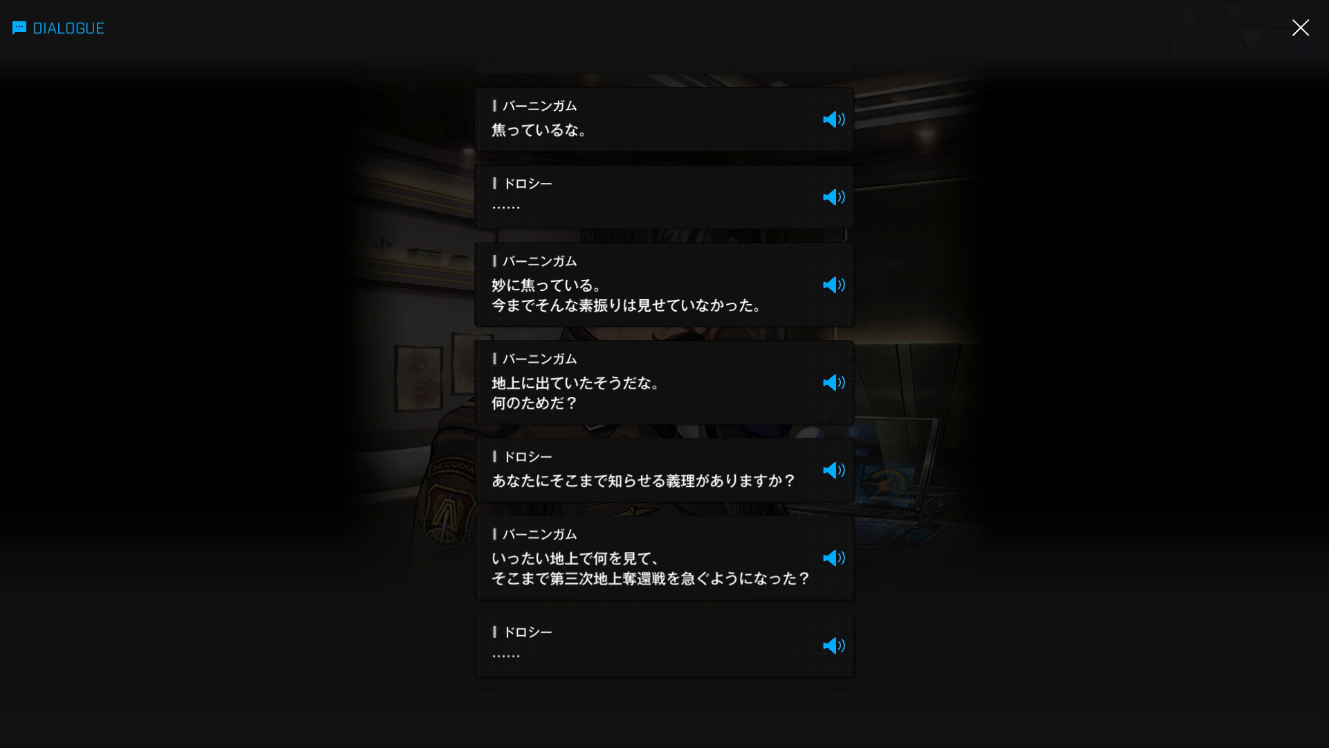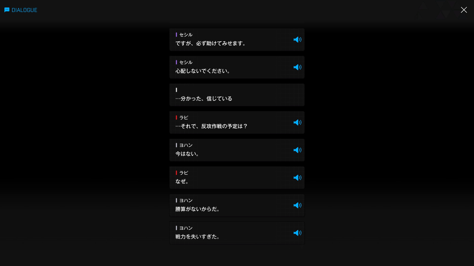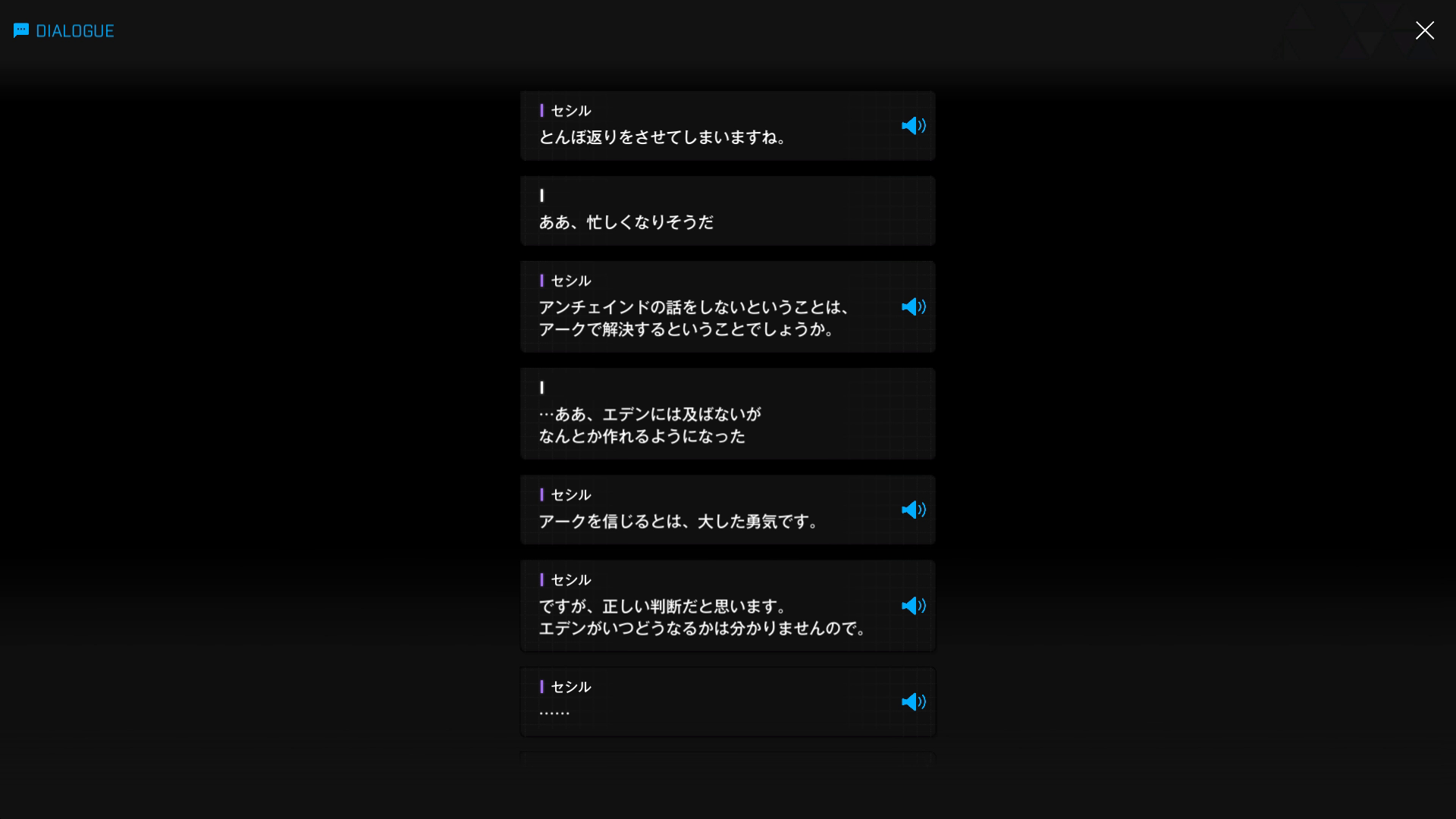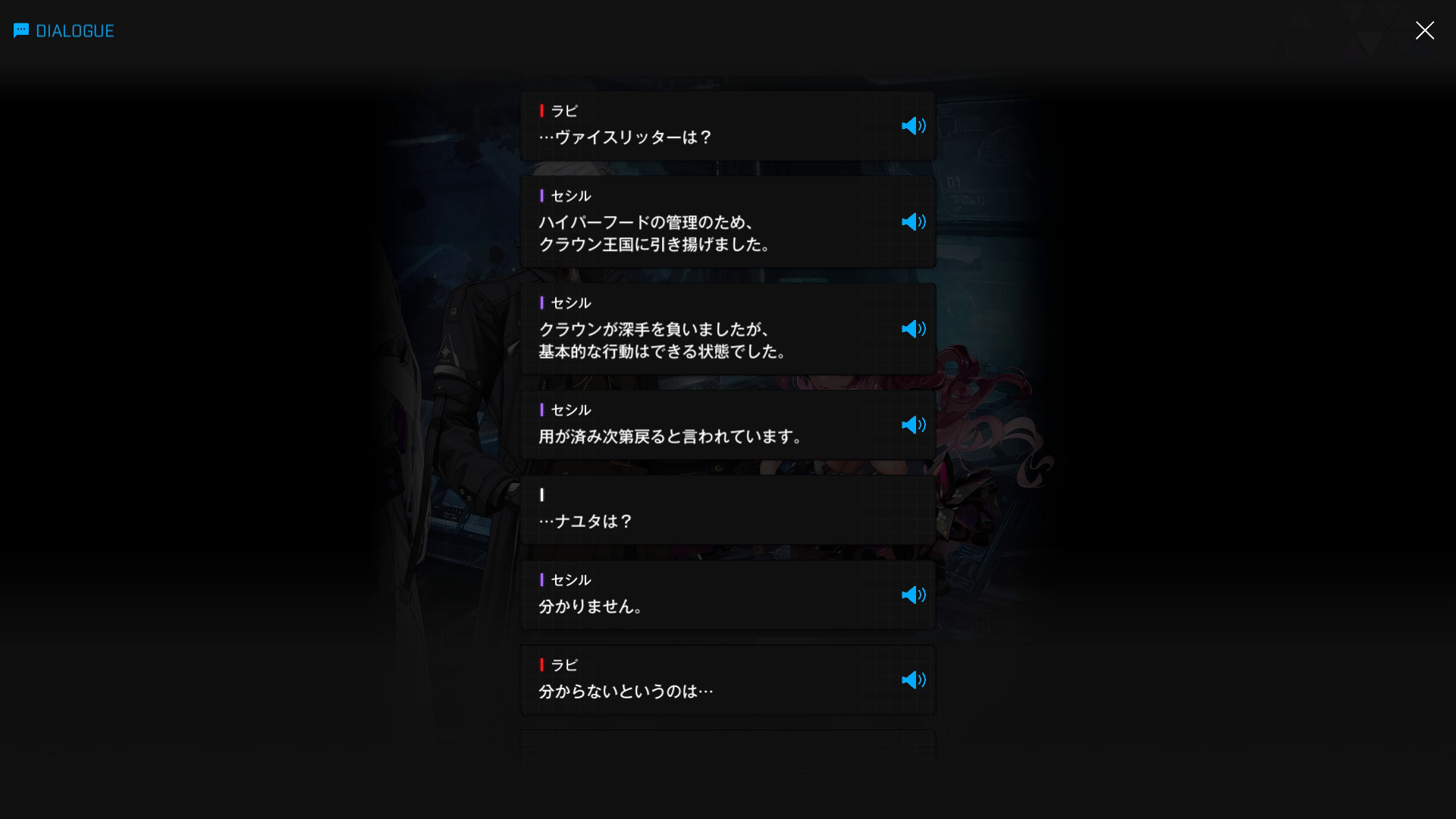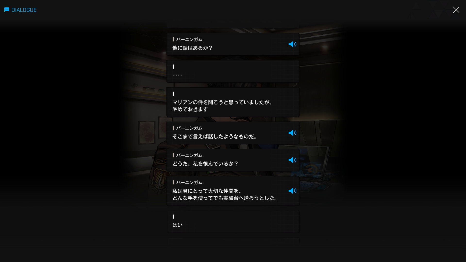 ・主人公が退室前にマリアンの頭をなで、ブレインシェルターに保管されたままの3名も助けると心に誓う → 帰路に就く前、セシルと以下SSのような会話を交わす