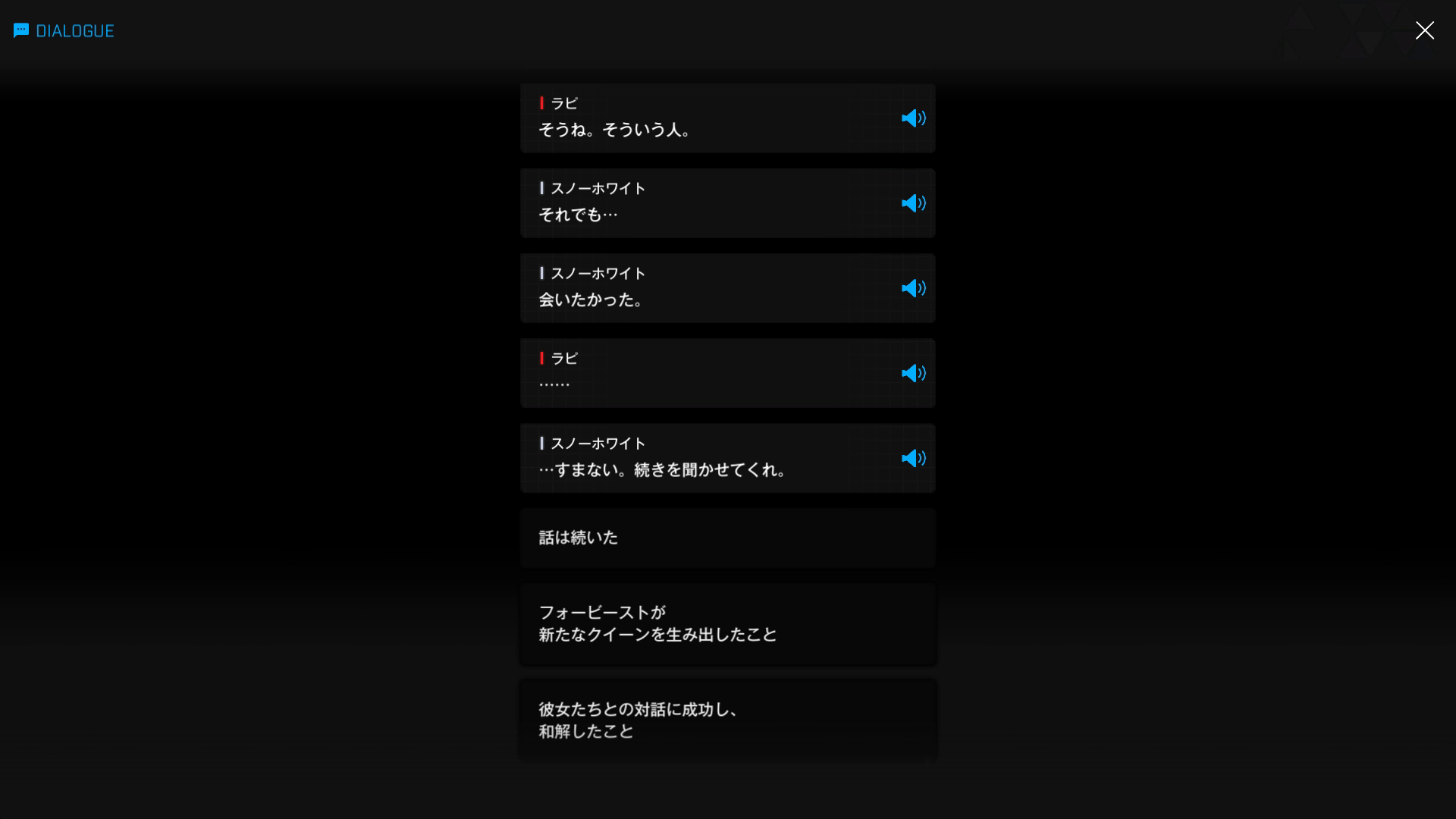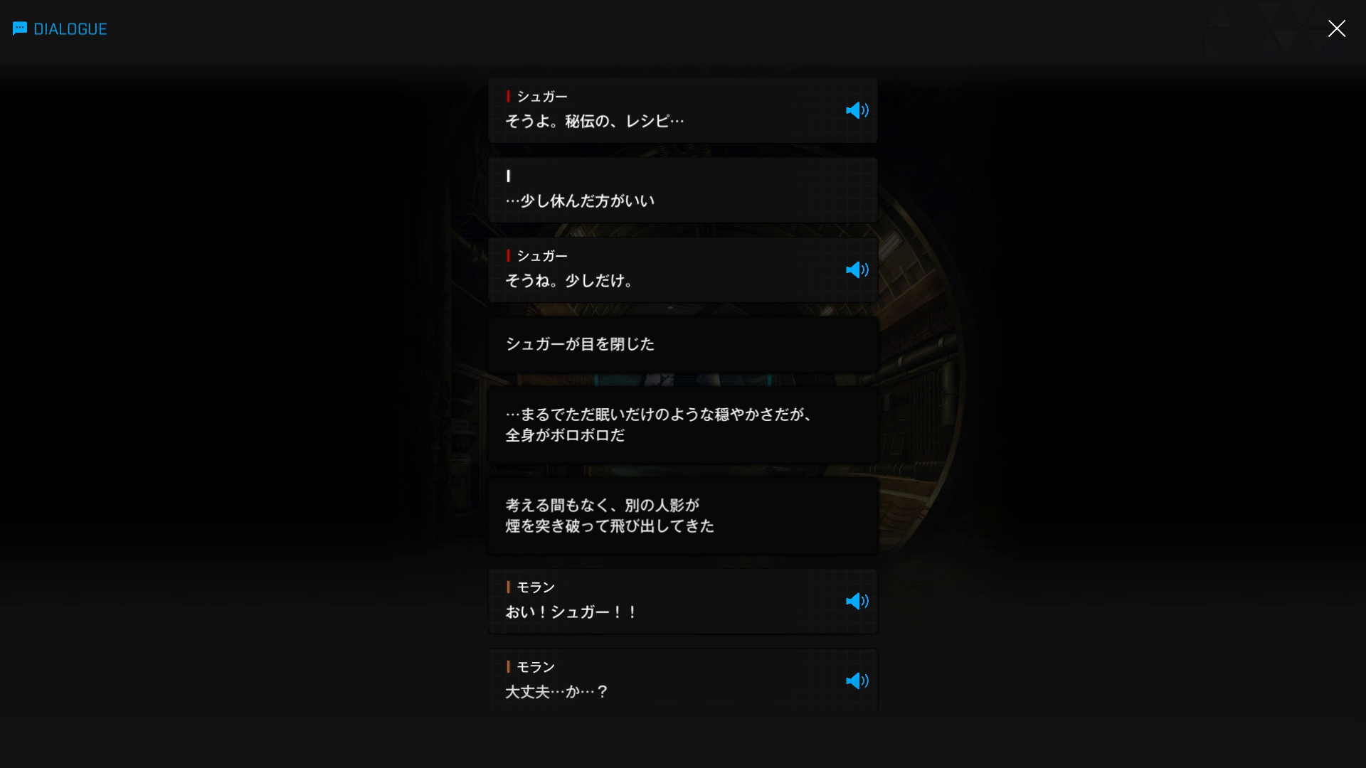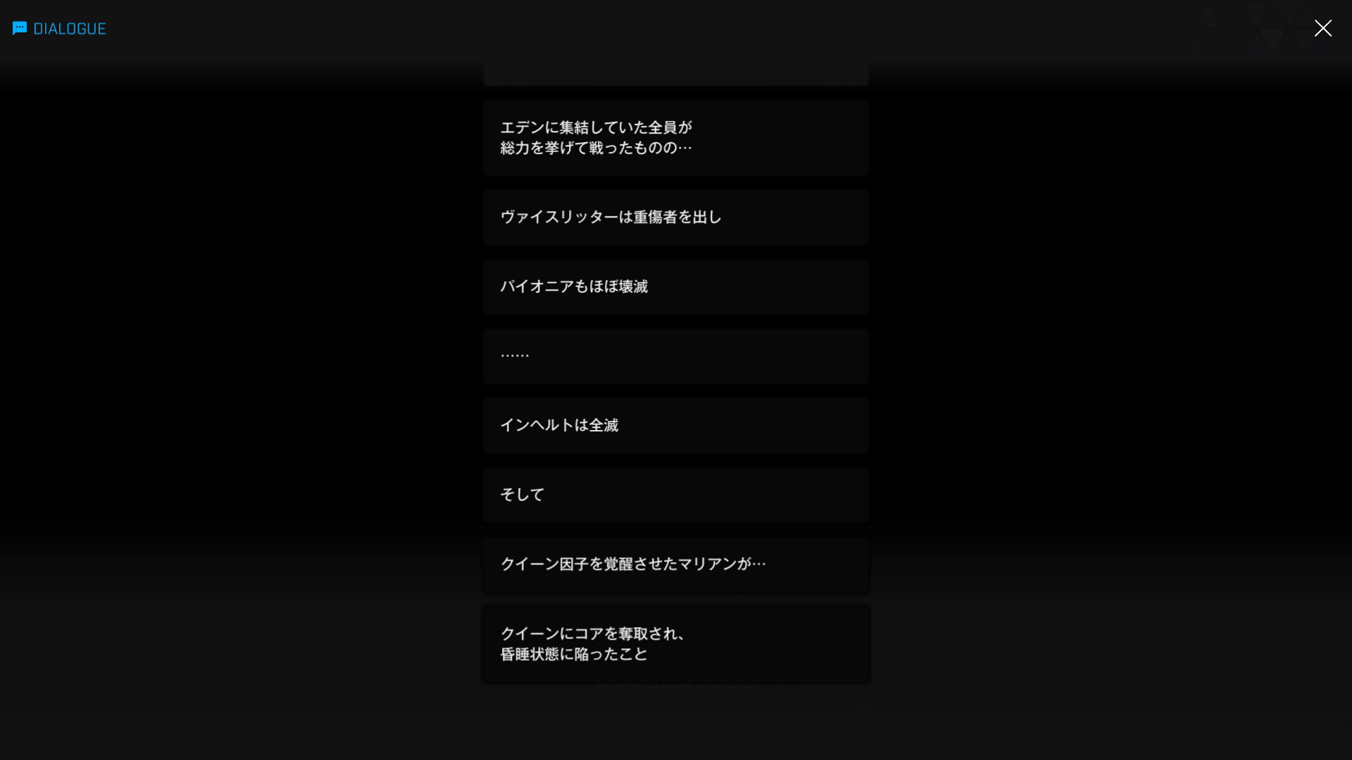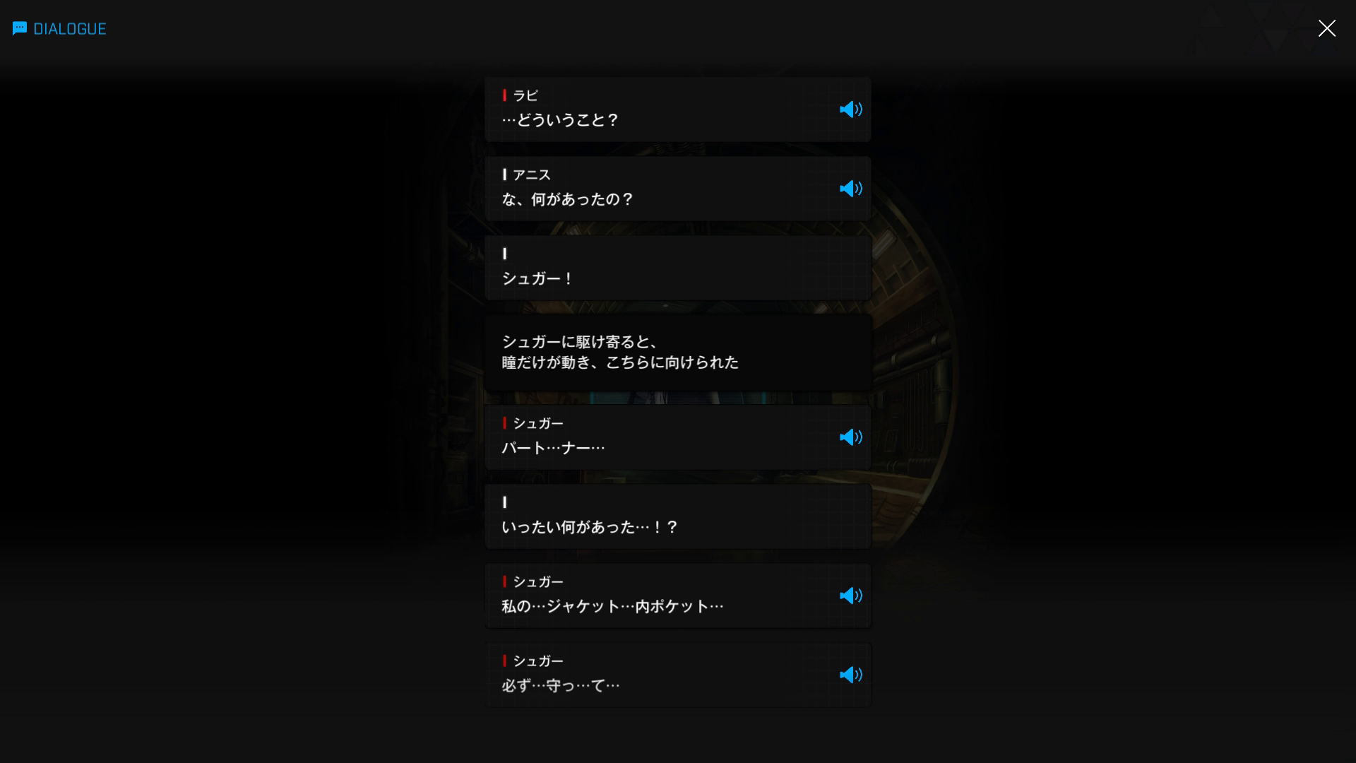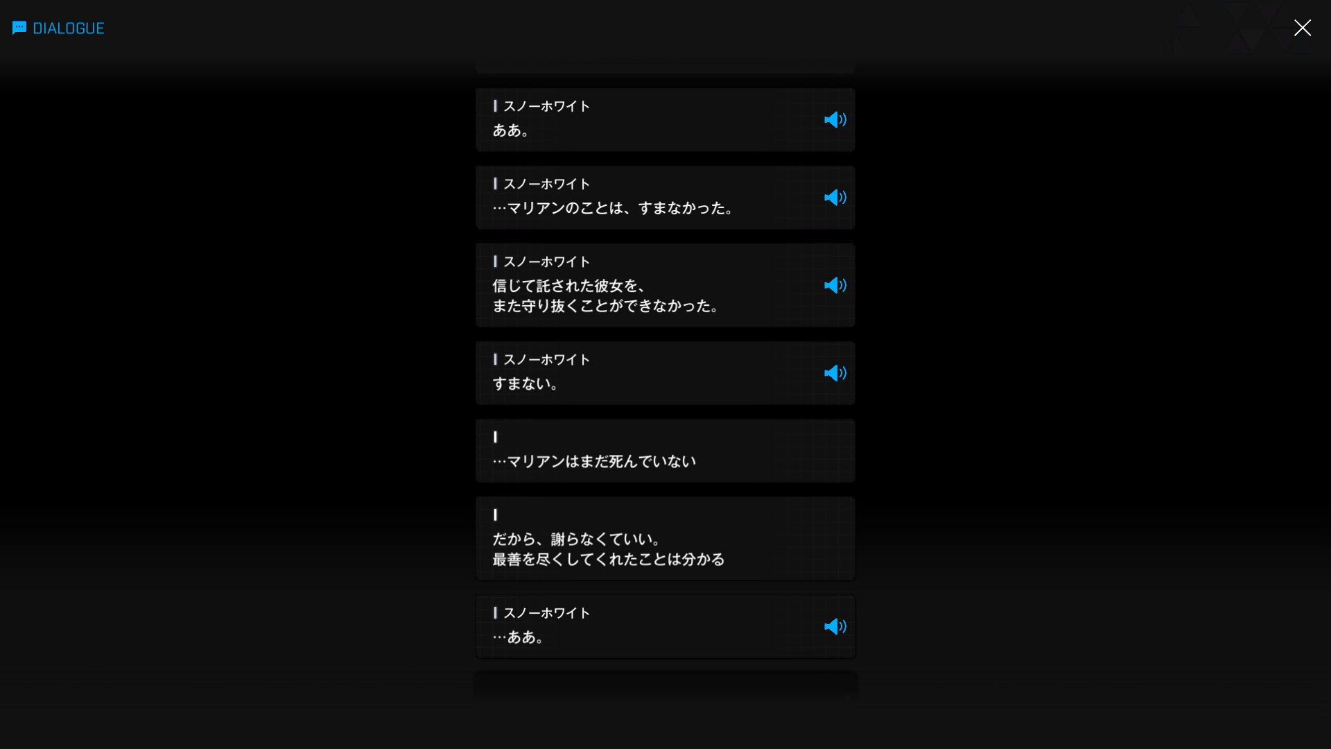 ・主人公が退室前にマリアンの頭をなで、ブレインシェルターに保管されたままの3名も助けると心に誓う → 帰路に就く前、セシルと以下SSのような会話を交わす