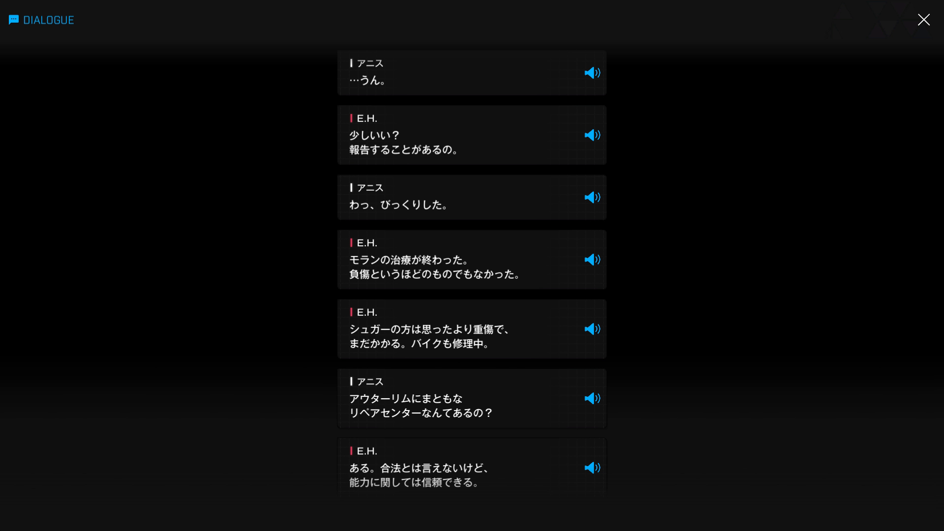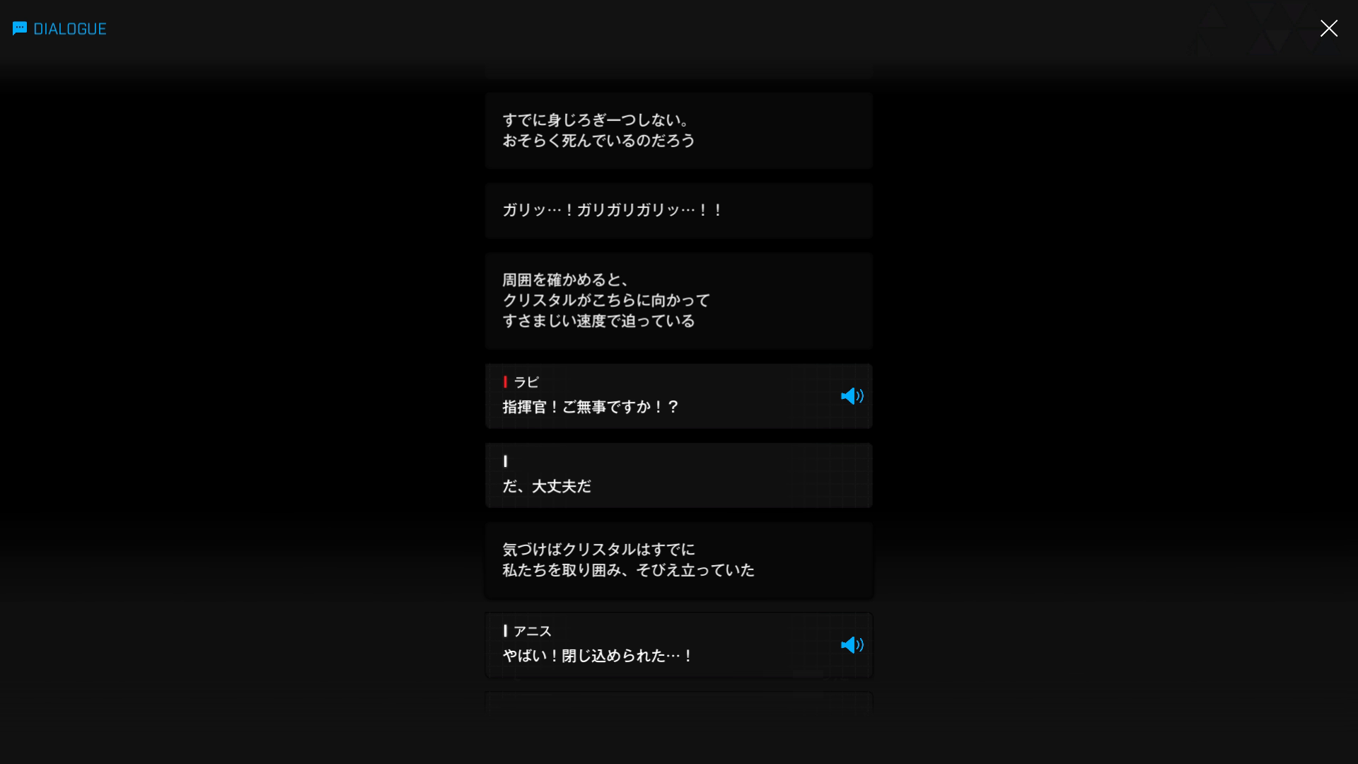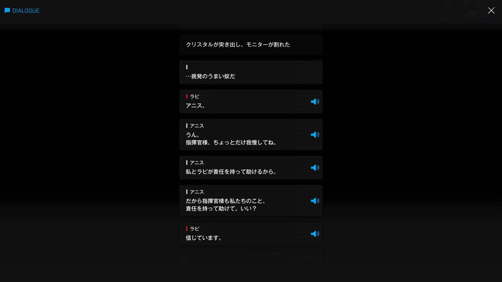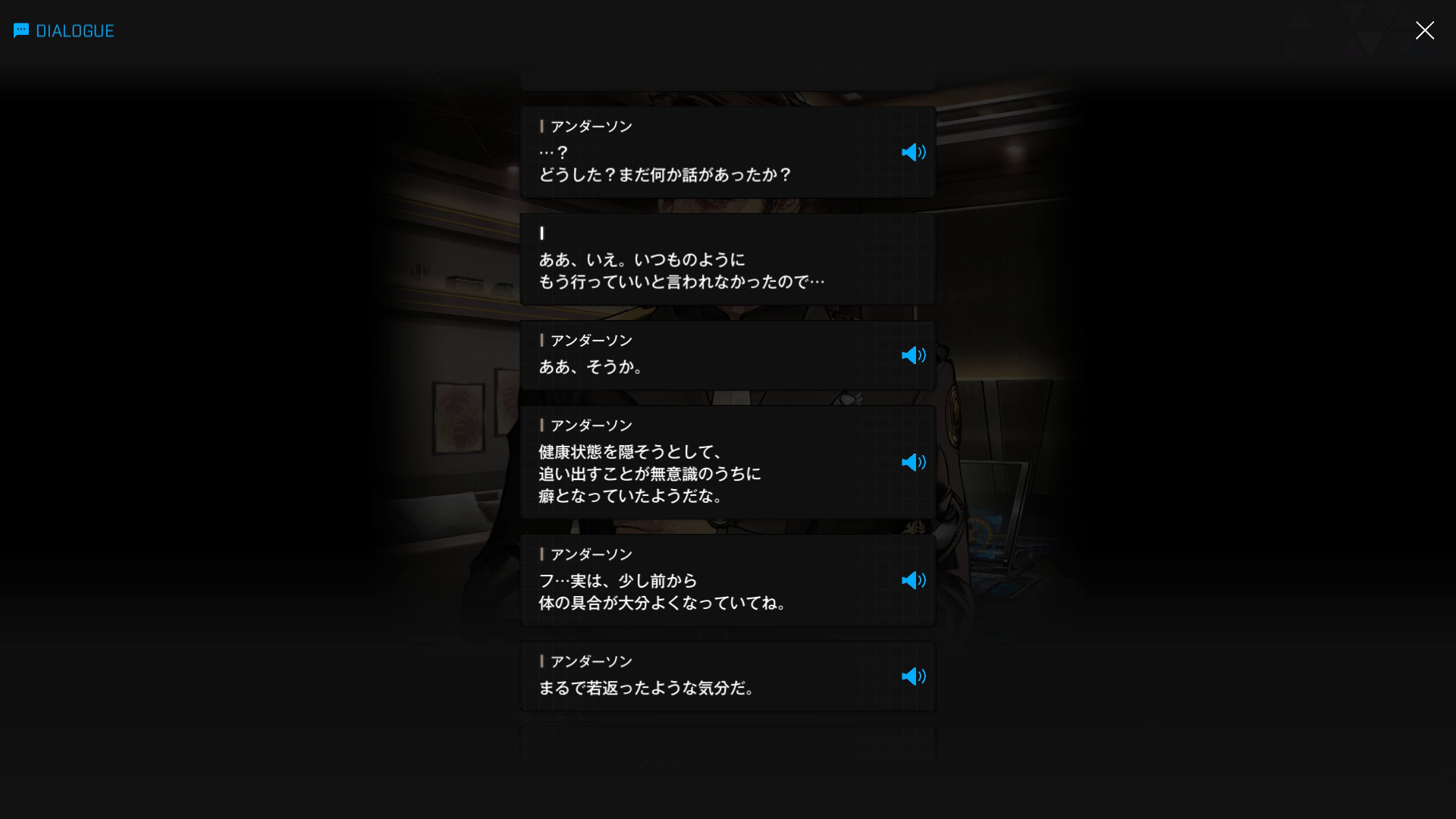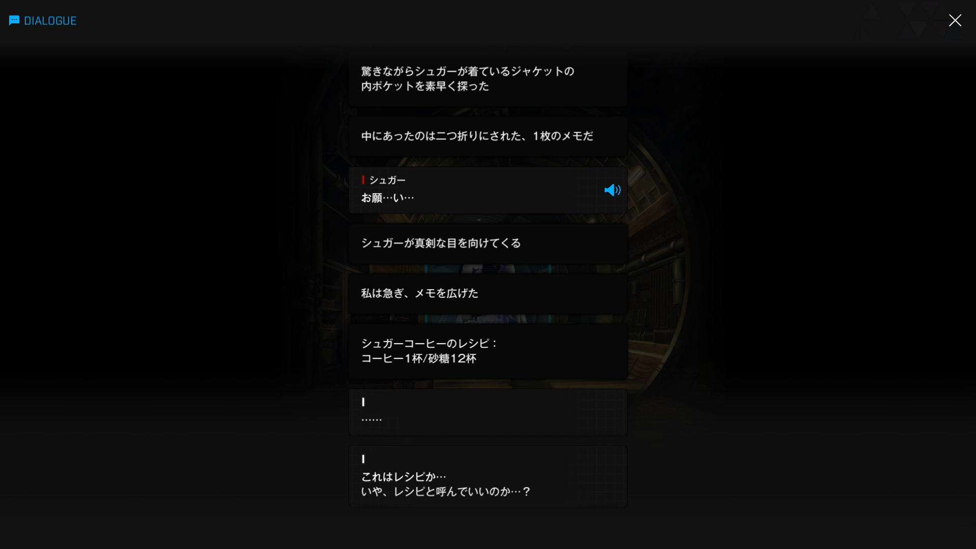 ・主人公が退室前にマリアンの頭をなで、ブレインシェルターに保管されたままの3名も助けると心に誓う → 帰路に就く前、セシルと以下SSのような会話を交わす