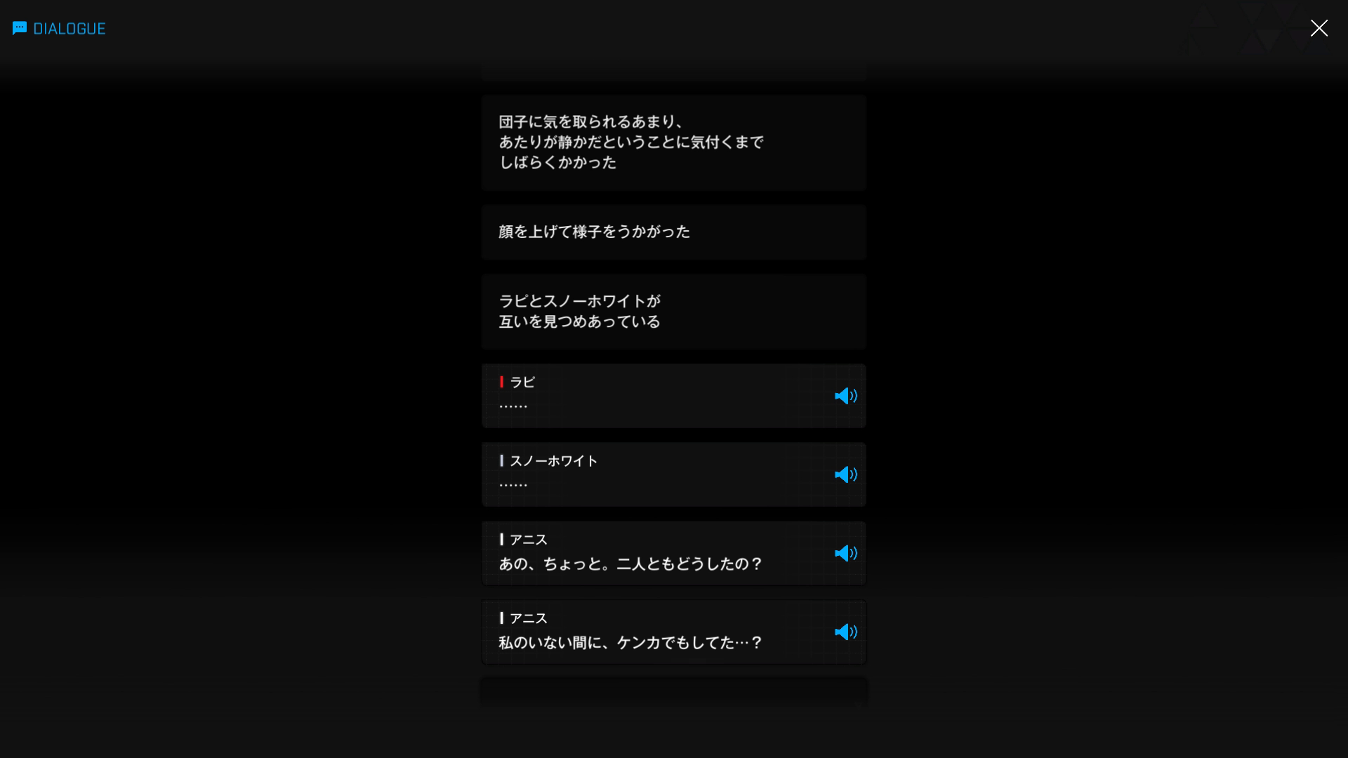上記でスノホワHAから最上級の誉め言葉をいただいたあと、まだ何の言動も起こしていない主人公に、ラピRHが即以下SSのような茶々を入れる → ちなみに、アニスSSRは「わお」の一言だけ & まだまだ話は続く