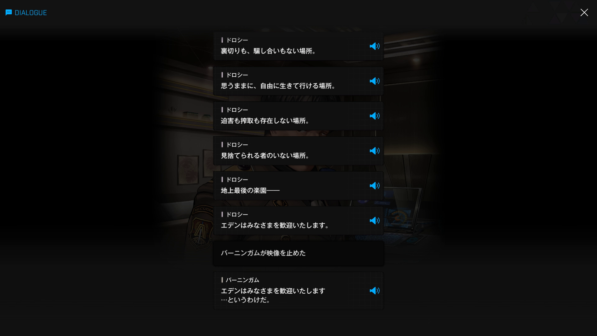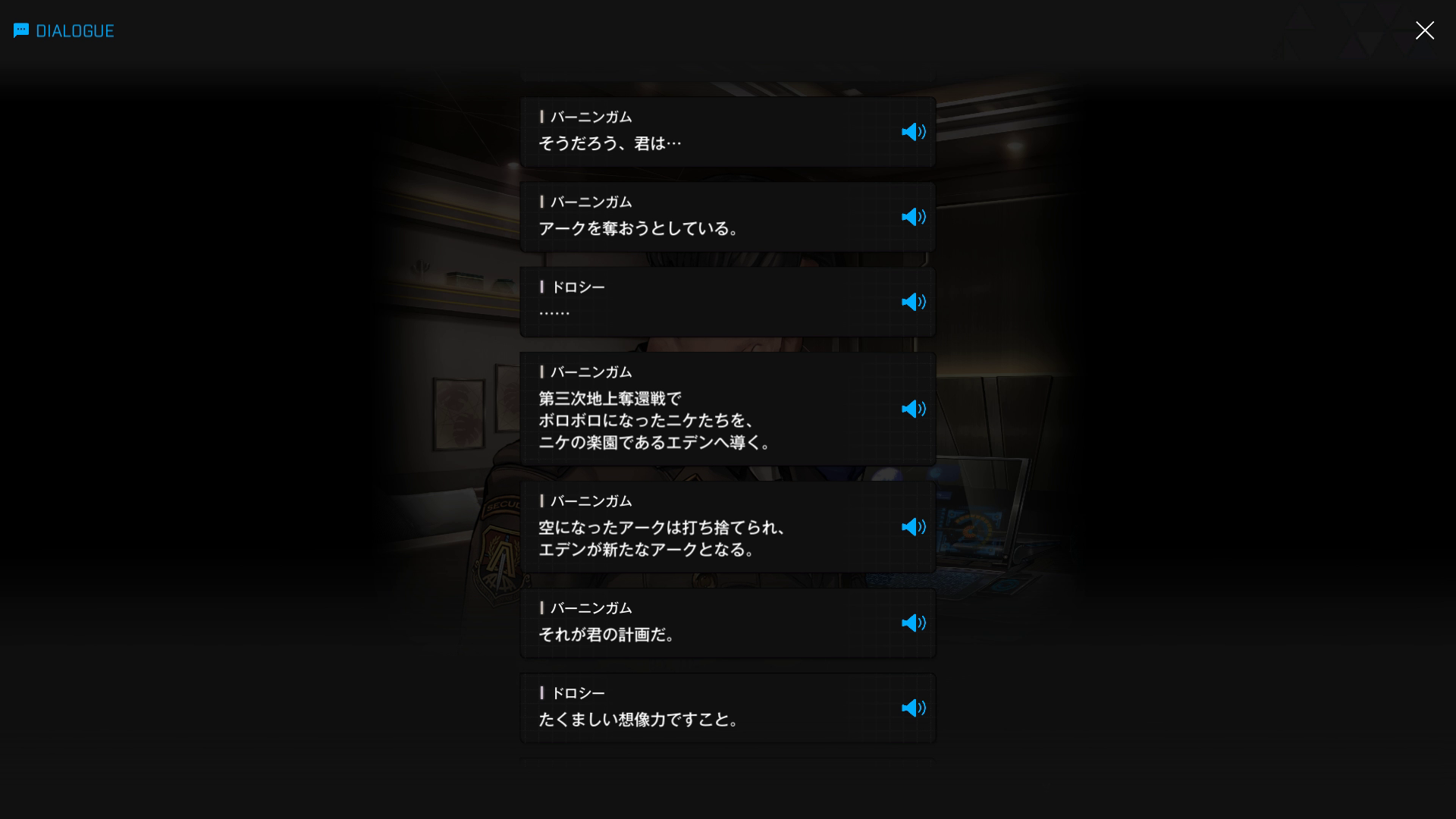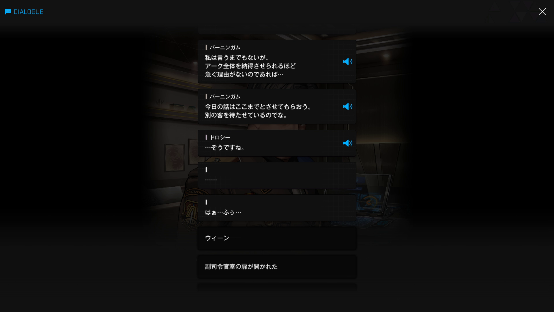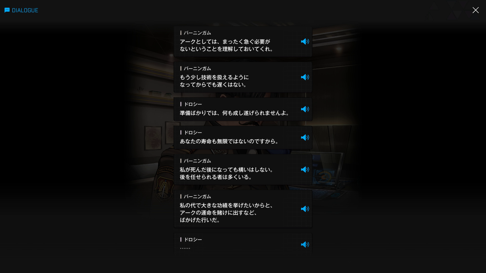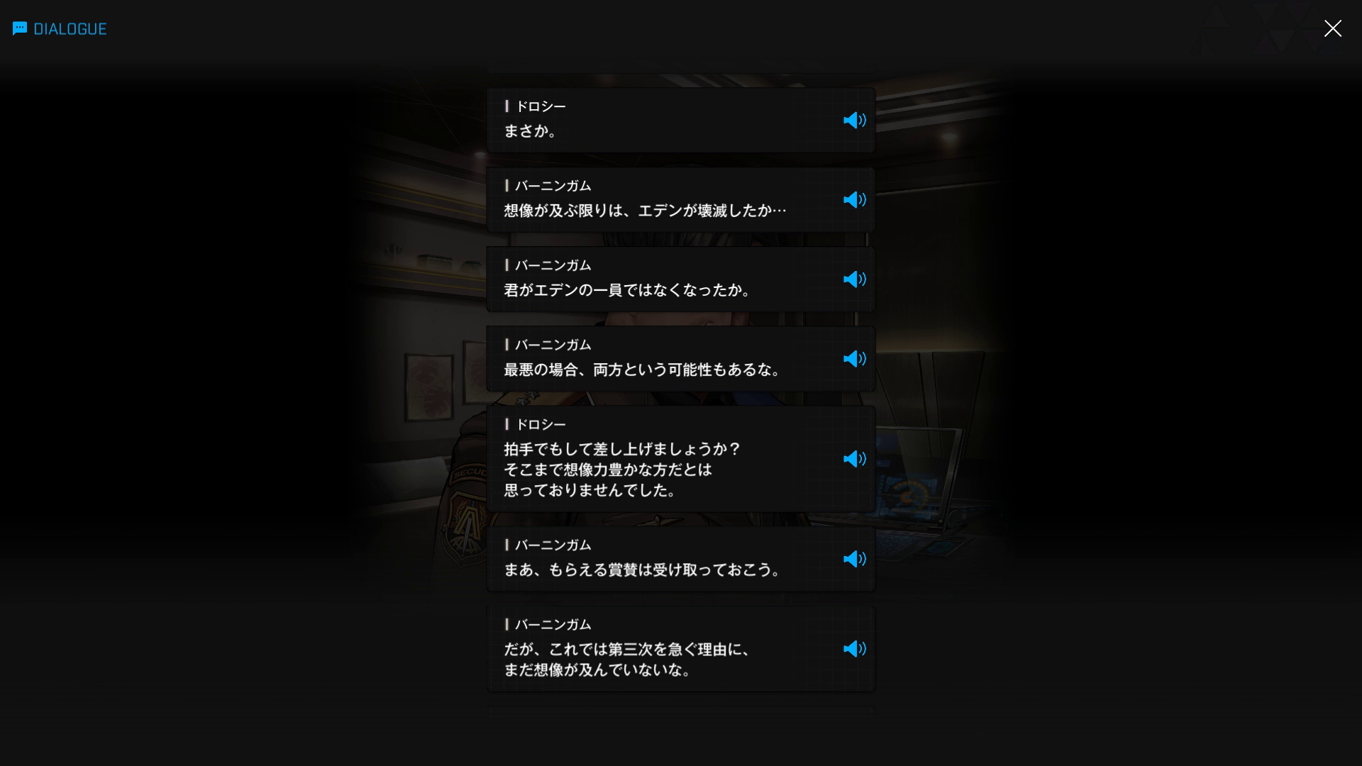 ・バーニンガムの執務室にて、復讐に情熱を傾けすぎてインヘルトの仲間を半ば見殺し & ブチ切れたヨハンからエデンを追放+憎むべきアークにしか行く当て(居場所)がなくなった哀れなドロシーが、なりふり構わずバーニンガムを焚き付ける → 元々頭の切れる彼が「はいそうですか」と言うはずもなく、逆に彼女の魂胆を全て見抜く