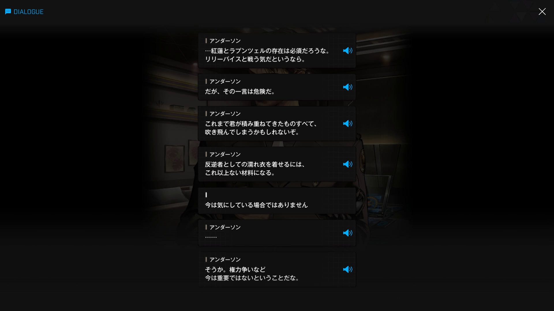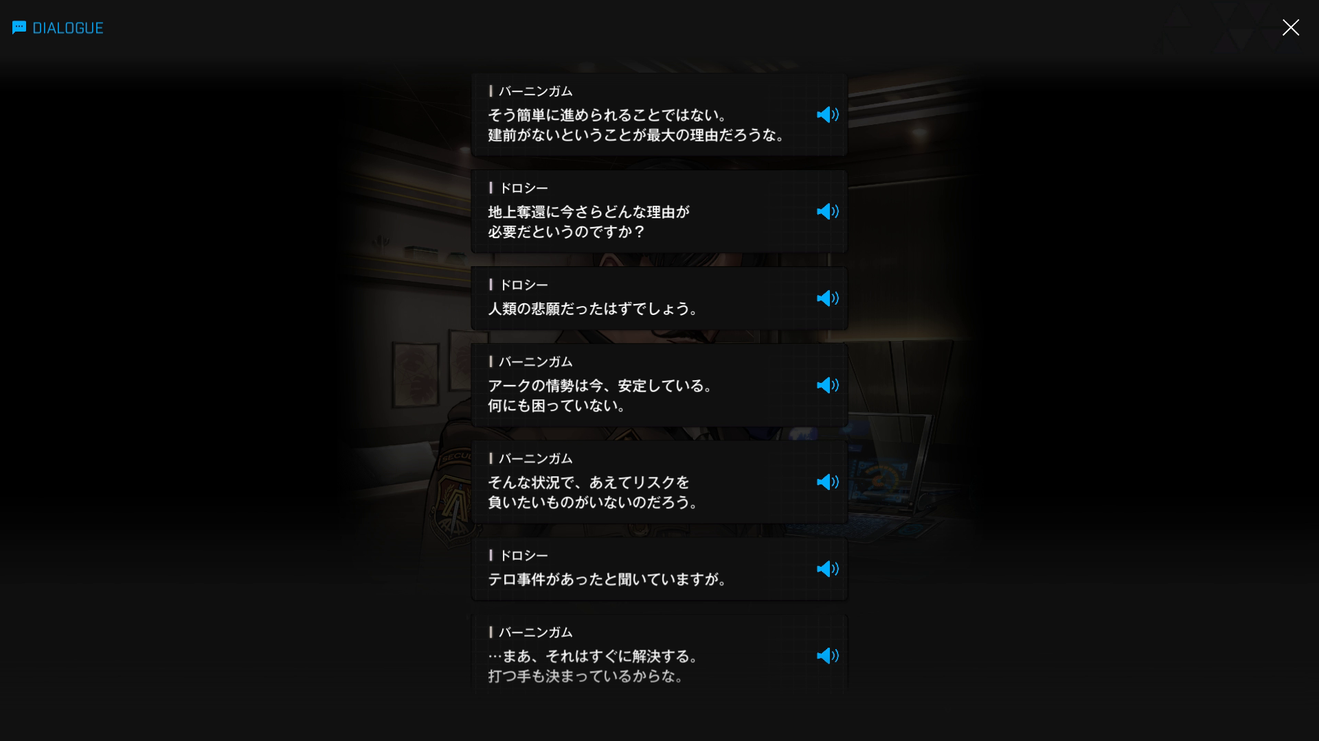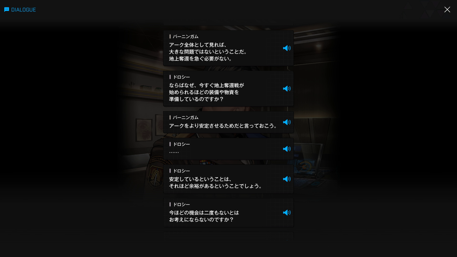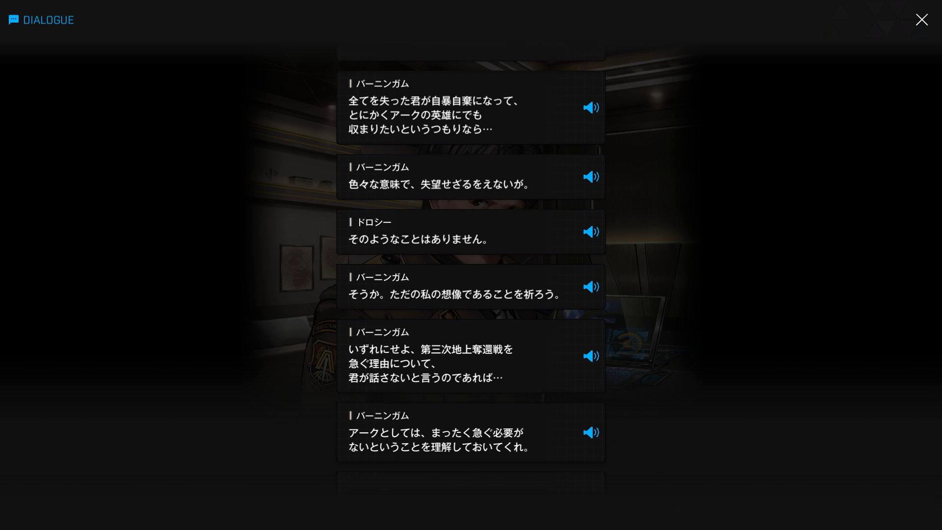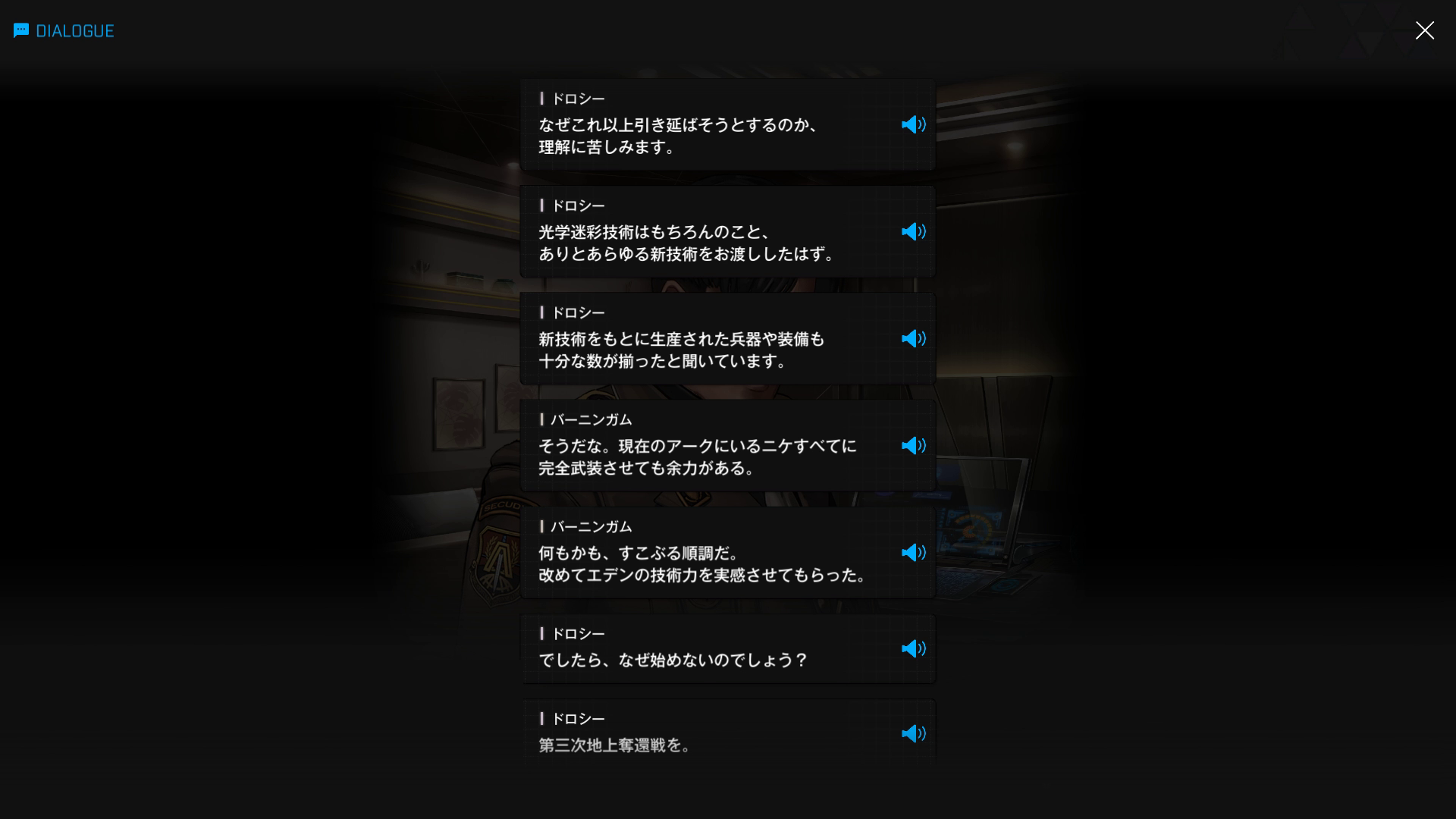 ・バーニンガムの執務室にて、復讐に情熱を傾けすぎてインヘルトの仲間を半ば見殺し & ブチ切れたヨハンからエデンを追放+憎むべきアークにしか行く当て(居場所)がなくなった哀れなドロシーが、なりふり構わずバーニンガムを焚き付ける → 元々頭の切れる彼が「はいそうですか」と言うはずもなく、逆に彼女の魂胆を全て見抜く